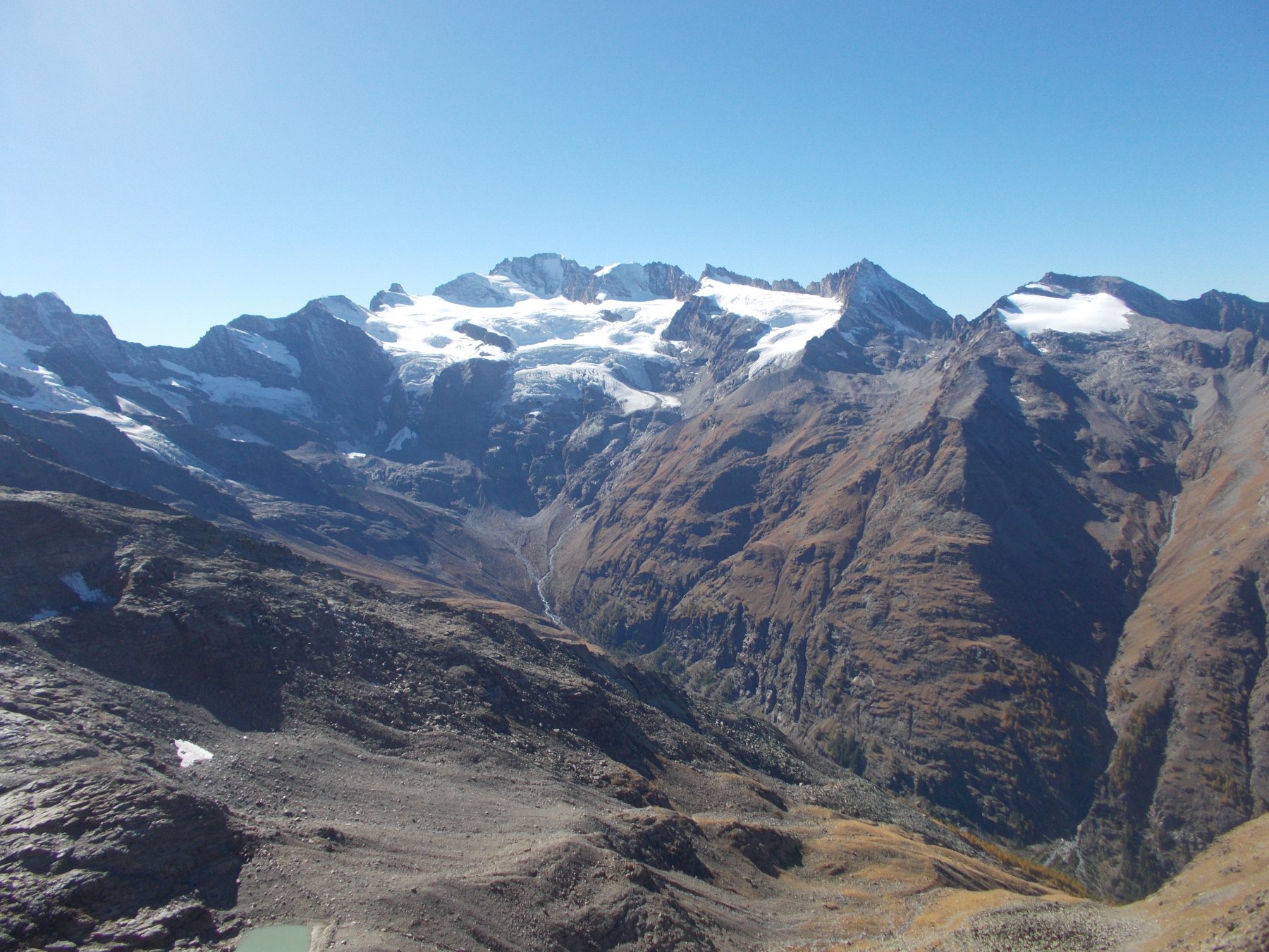 Per la discesa a questo punto in anello comunque sia, esistono piuì possibilita’,ssuna facile, riferito alla natura impervia dei terreni completamente privi di sentiero, cosparsi da estese pietraie non sempre di facile attraversamento. Questi si reperiscono solo una qualvolta si e’ scesi di parecchio da ambo i versanti sia est che ovest (da noi utilizzato per salire e scendere a traversata compiuta), comba di Grandzetta in salita di Vallettaz in discesa. Per scendere a Valmiana da quest’ultima, tenersi tutto alla dx, fino all’alpe della Vallettaz, (un rudere attualmente) dalla quale si intraprende a scendere un canale erboso alla sua dx, dove un tempo si presume esistesse un sentiero o quanto meno una traccia, che consentiva l’accesso a questo alpeggio da Valmiana. Non vi e’ piu’ traccia alcuna attualmente e la discesa dal canale richiede molta attenzione per erba scivolosa e l’uso delle mani dove questi si restringe in piu’ punti a formare brevi saltini rocciosi. Altra soluzione e’ tenersi tutto alla sx della comba scendendo, fino a scollinare sulla sx in traverso ad una quota di ca (2100m), a reperire il sentiero che scende dal Money. In entrambi i casi disagevoli comunque i rientri, a causa la natura selvaggia dei terreni e le distanze kilometriche specie si decidesse per questa seconda soluzione che verrebbe a coprire notevoli distanze, venendosi a trovare di parecchio interni alla valle e dovendola ridiscendere a ritroso con ampio giro ad anello di tutto rispetto. Calcolare dalle 13 alle 15 ore per tutto il giro completo).