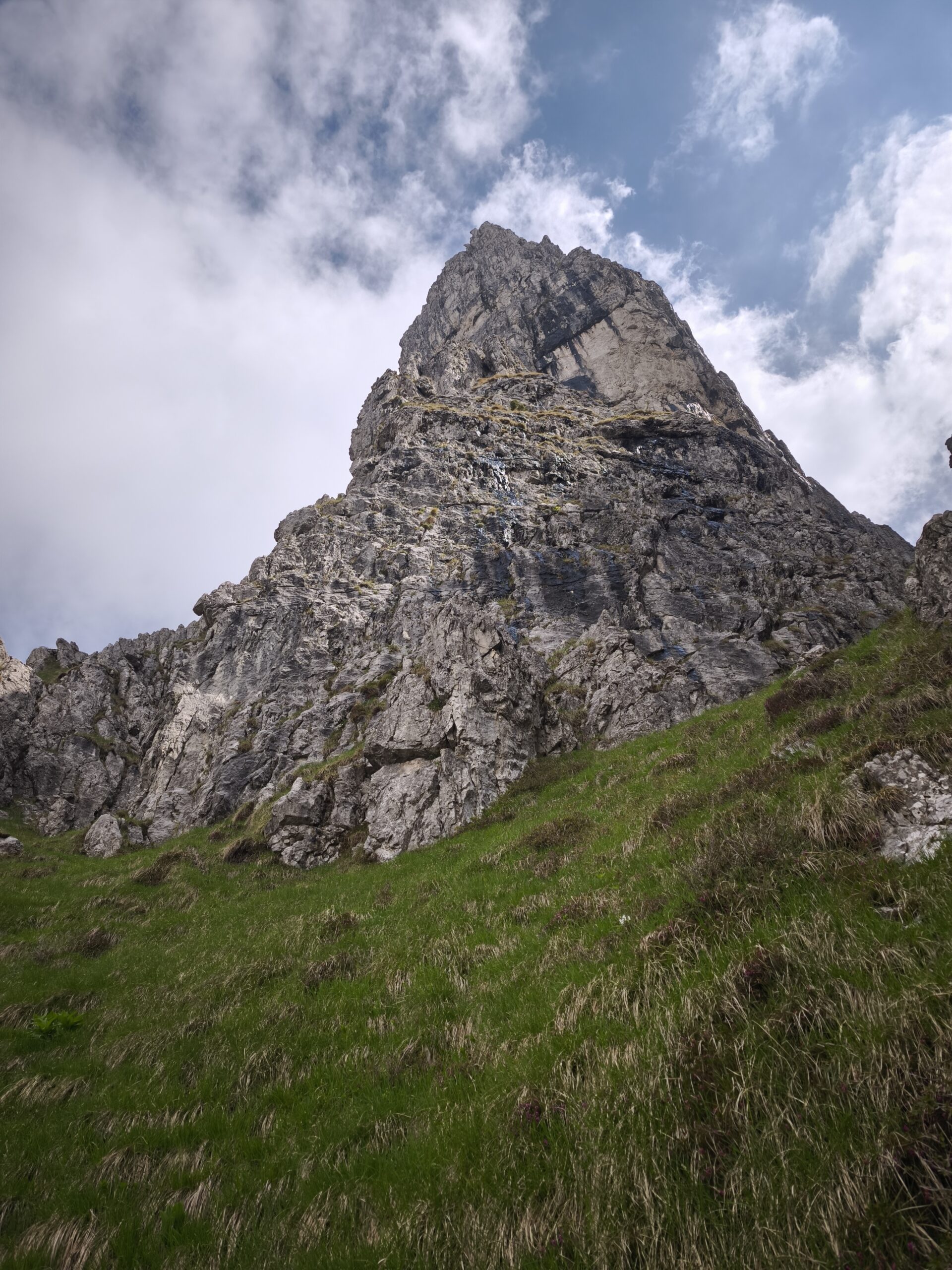 - L2: con passo delicato e non banale, rimontare la placca a sinistra della sosta fino a raggiungere lo spigolo. Qui entrare nel canalino di roccia rotta fino a ritornare sul filo dello spigolo. Proseguire sul filo aggirando le difficoltà maggiori sulla sinistra, fino a raggiungere un’ampia cengia erbosa. La sosta si trova alla base del successivo risalto roccioso – 35m V+
