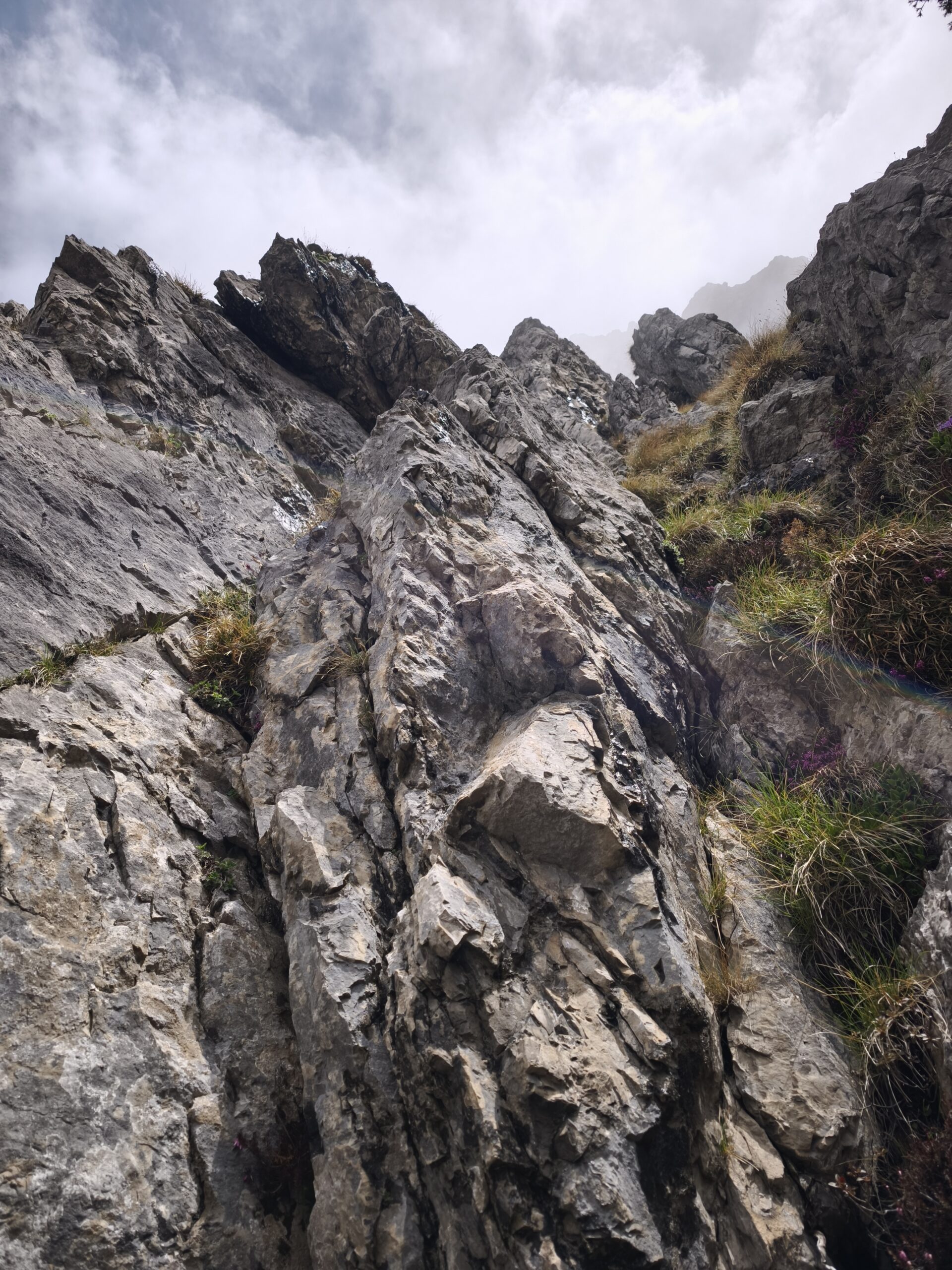 - L6: dalla sosta, traversare a destra per 3/4 metri, quindi salire dritti cercando il passaggio migliore e facendo attenzione alla roccia poco sana (1 ch e 1 cordino). La sosta si trova su un’ampia e comoda cengia erbosa alla base della cresta finale – 45m V