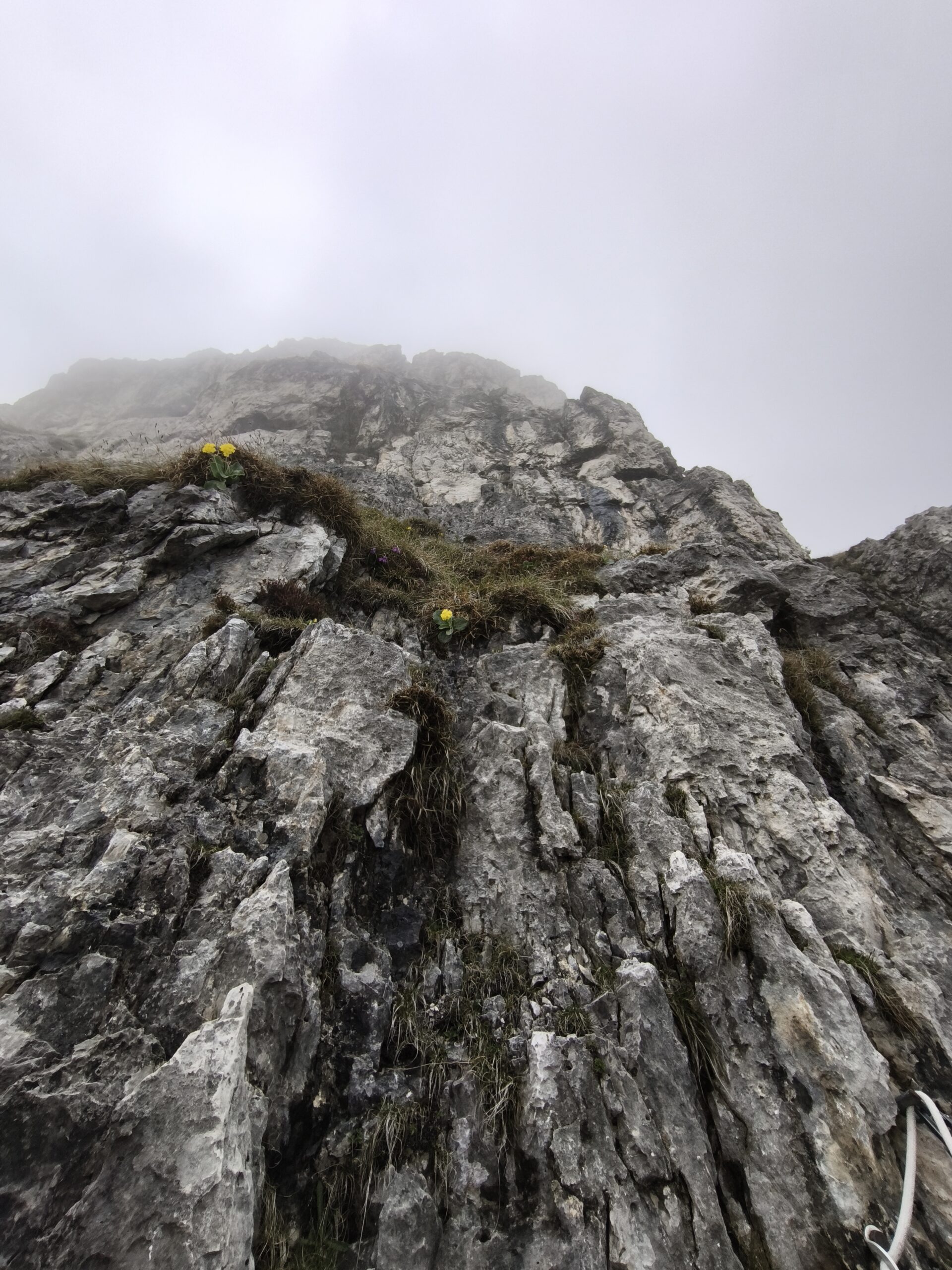 - L4: tiro chiave. Salire dritti sopra la sosta su terreno semplice ma di roccia poco sana fino a portarsi alla base di una breve paretina di roccia gialla. Con bella arrampicata fisica e non semplice rimontare la paretina (ben chiodata) fino a quando questa non risulta essere sbarrata da un tetto. Qui traversare verso destra aggirando lo spigolo e sostare su cengia erbosa alla base del successivo risalto – 20m IV+, VI+