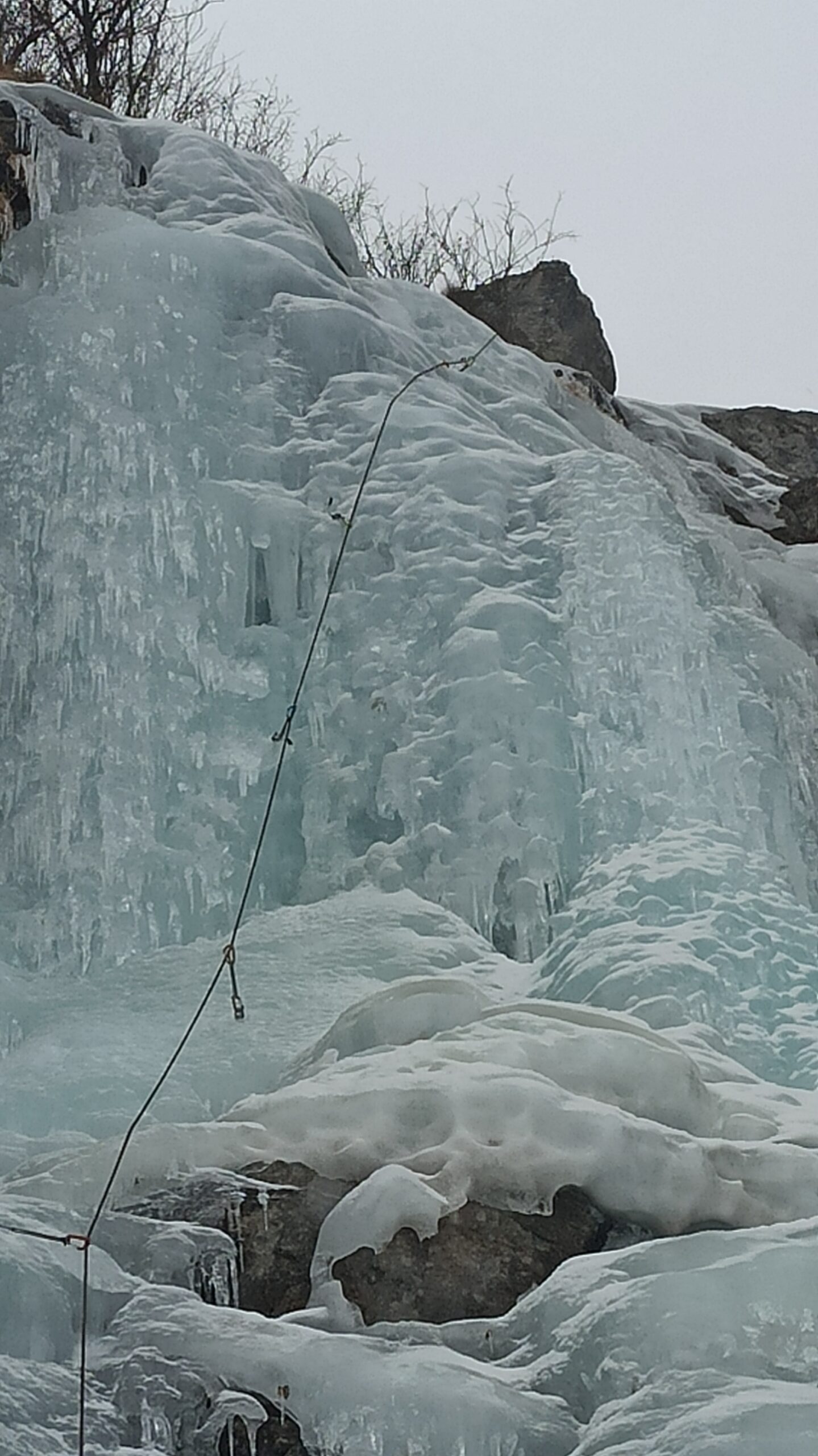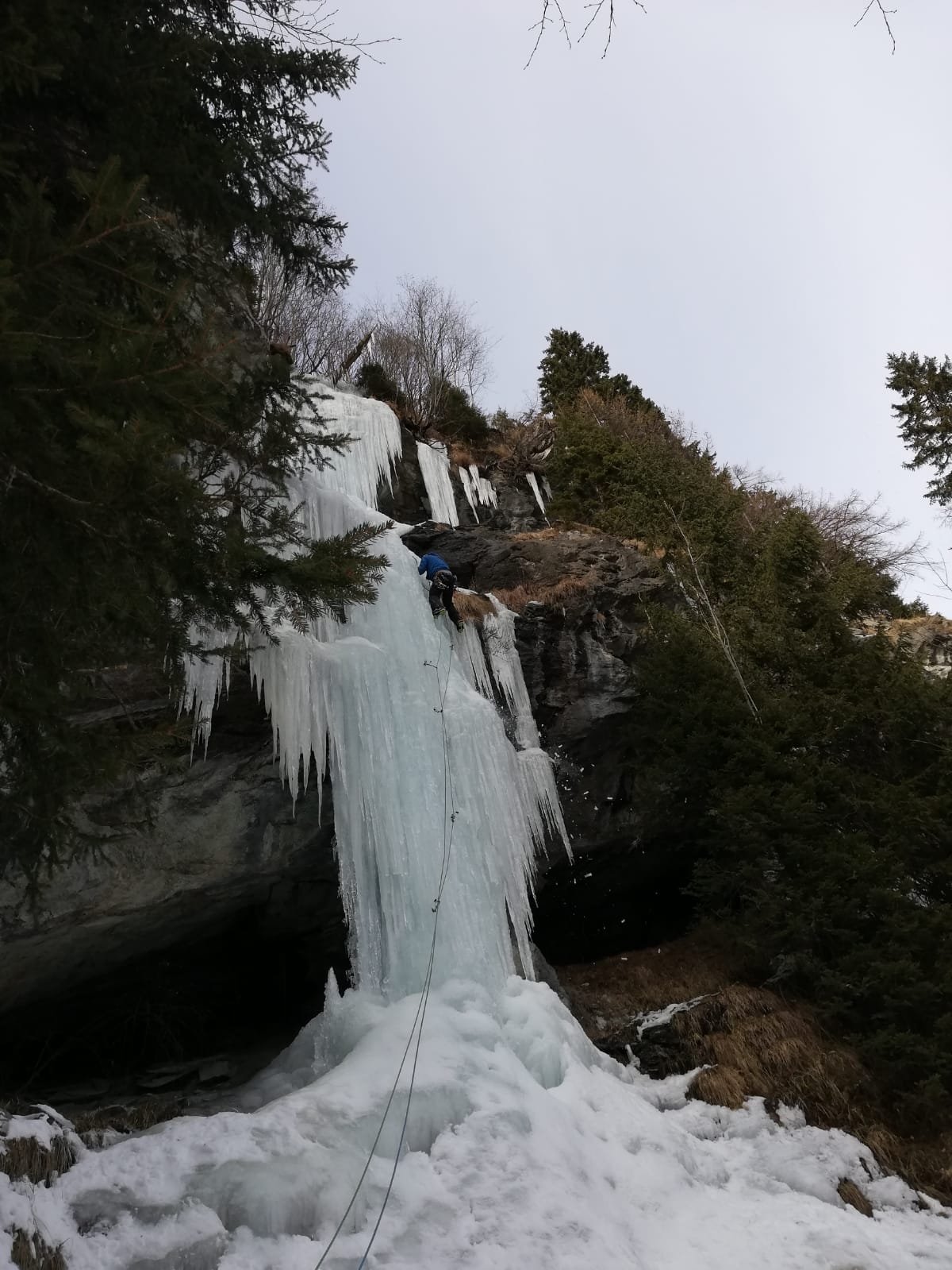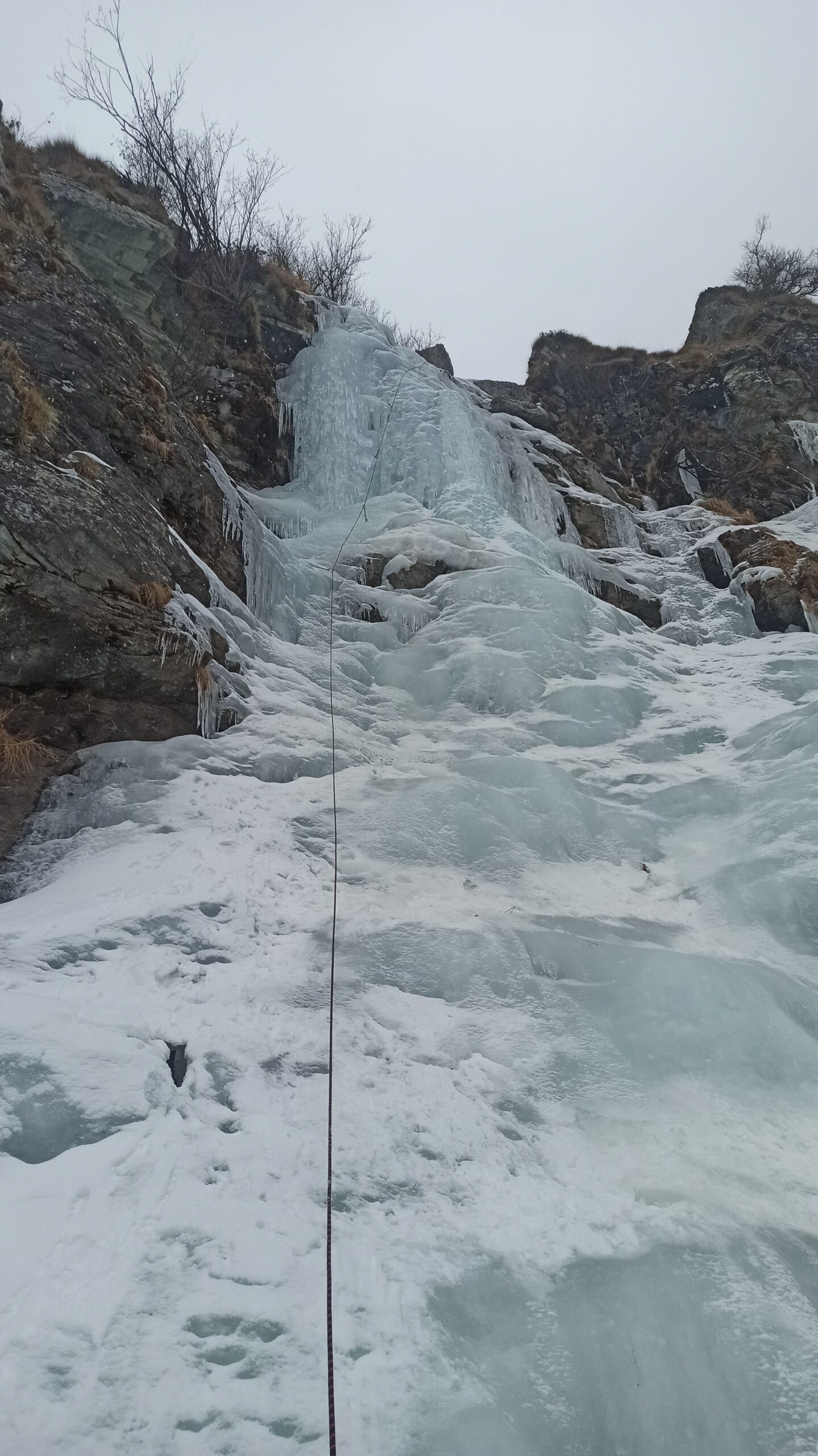 Salire a sx e in diagonale portarsi ai piedi di un muro che si supera (70°/80°) facendo sota nella spiazzo superiore.