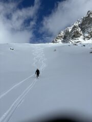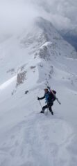 Prima della selletta della cresta finale un po’ di attenzione (neve inconsistente, ripido e fondo ghiacciato) poi lasciati gli sci a 50mt dalla vetta. Discesa fantastica su powder (presi solo pochi sassi che erano coperti dalla nuova neve) ma scegliendo opportunamente i pendii ce la siamo cavata egregiamente.