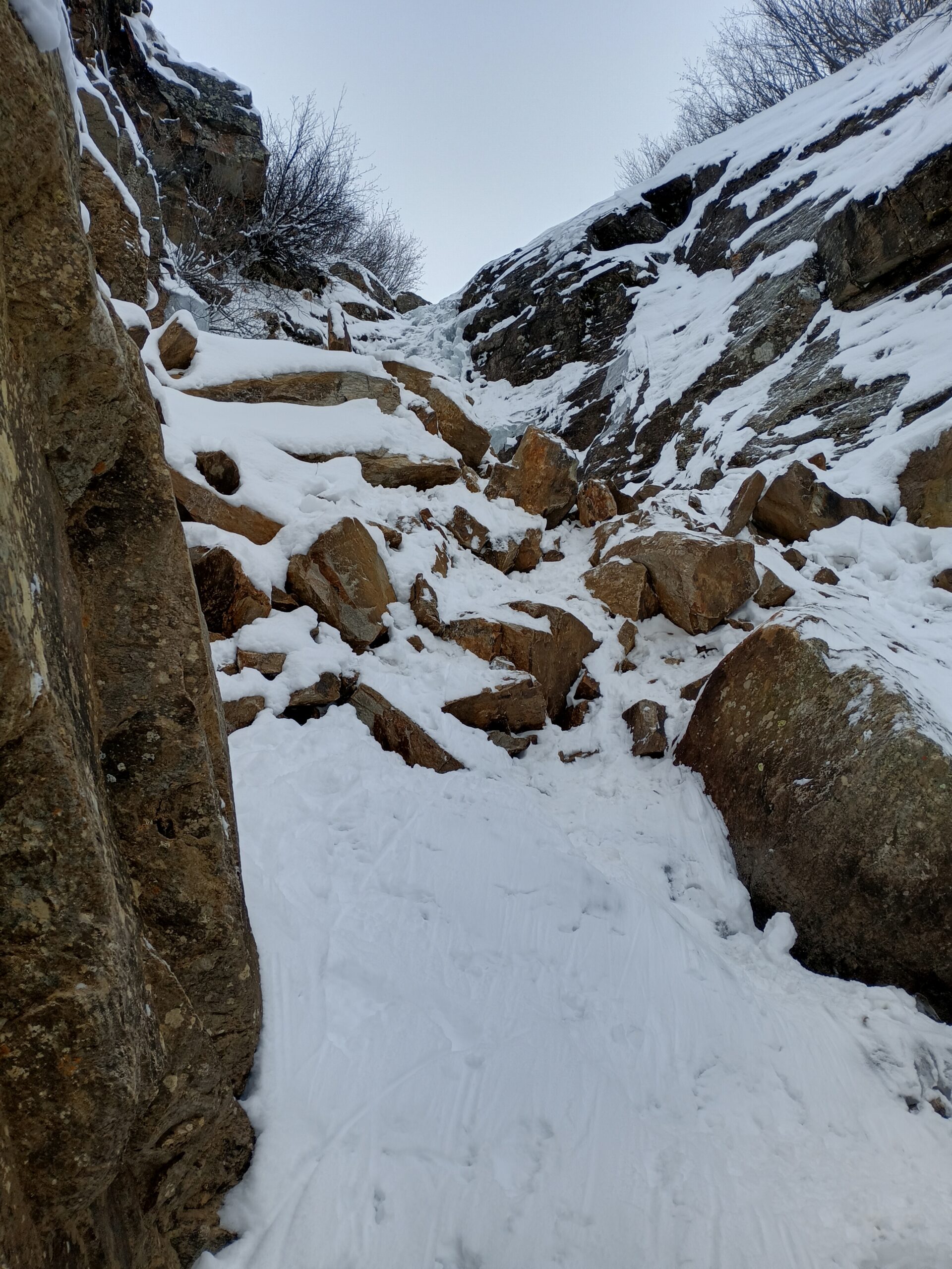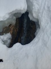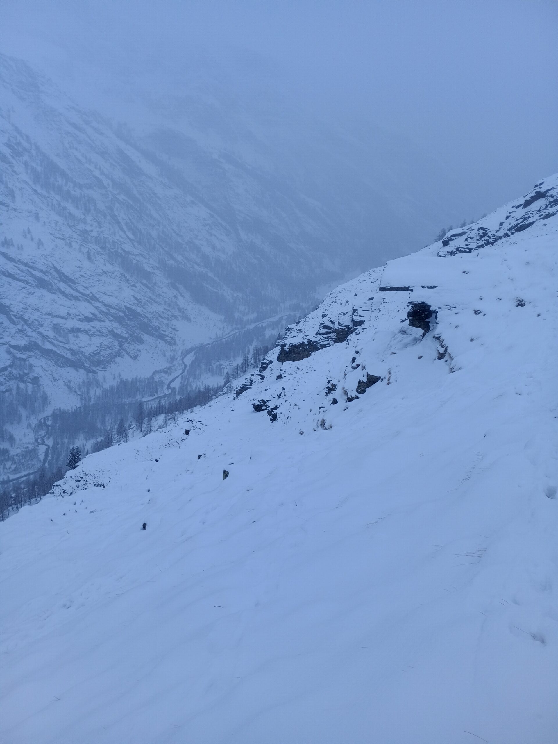 Per la discesa, ritrovandoci per combinazioni astrali fuori dal nostro controllo (più o meno) con solo una corda in cima, abbiamo deciso di proseguire nel canale innevato, ascoltando bene il rumore di acqua sotto per capire dove passare, per poi raggiungere il sentiero che conduce sopra Patri. Ambiente bellissimo, neve dei giorni precedenti accumulata e leggera nevicata in atto, la discesa è risultata più appassionante della salita. Tracciato tutto fino a trovare un canalone e scenderlo tutto fino a ricongiungersi al sentiero battuto, decisamente più divertente che calarsi!