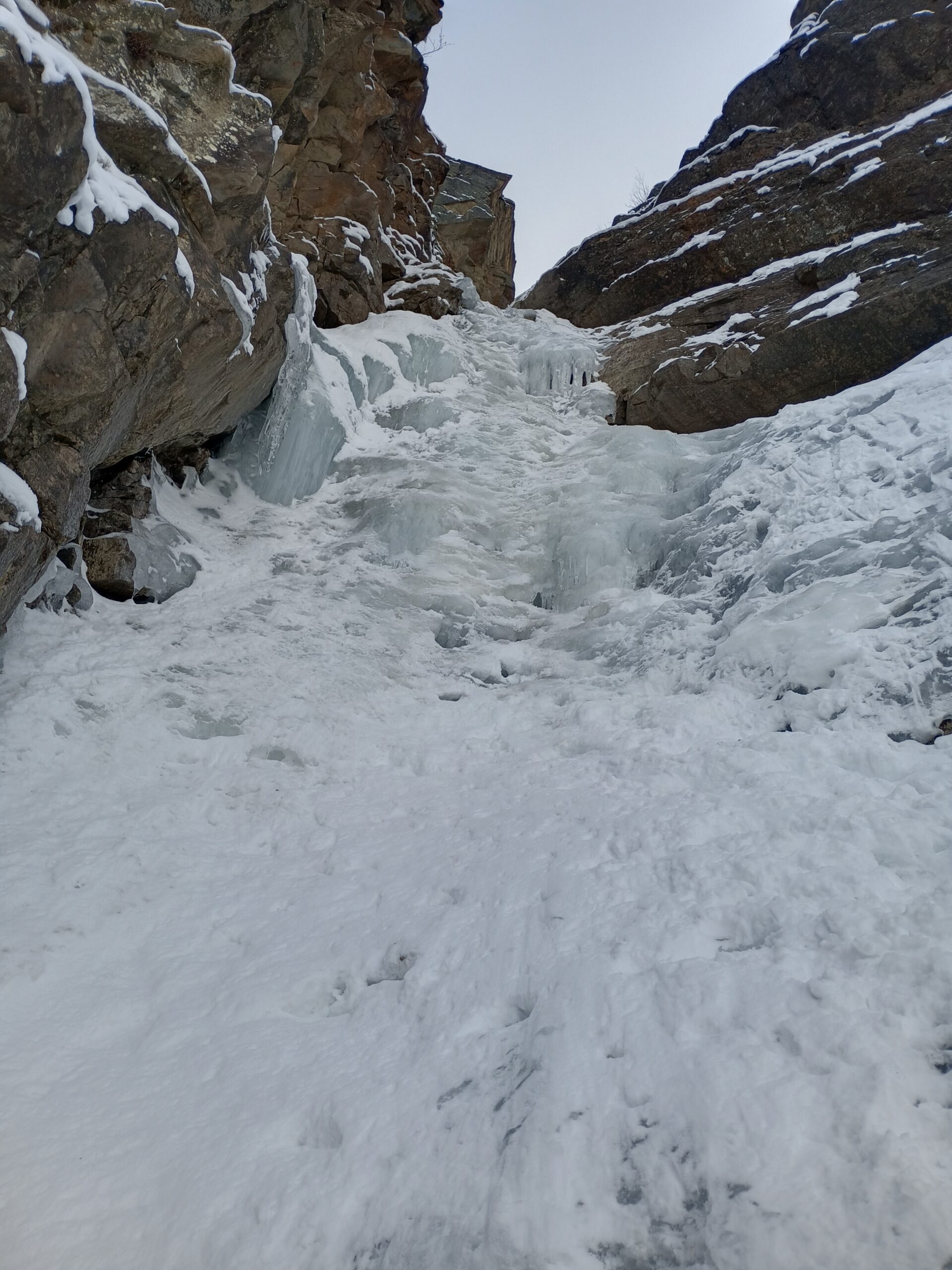 Cascata in condizioni, un po’ di delicatezza in alcuni punti in cui si vede l’acqua scorrere sotto, ma percorribile senza problemi. Ghiaccio lavoratissimo dai mille passaggi, sono praticamente tutti agganci.