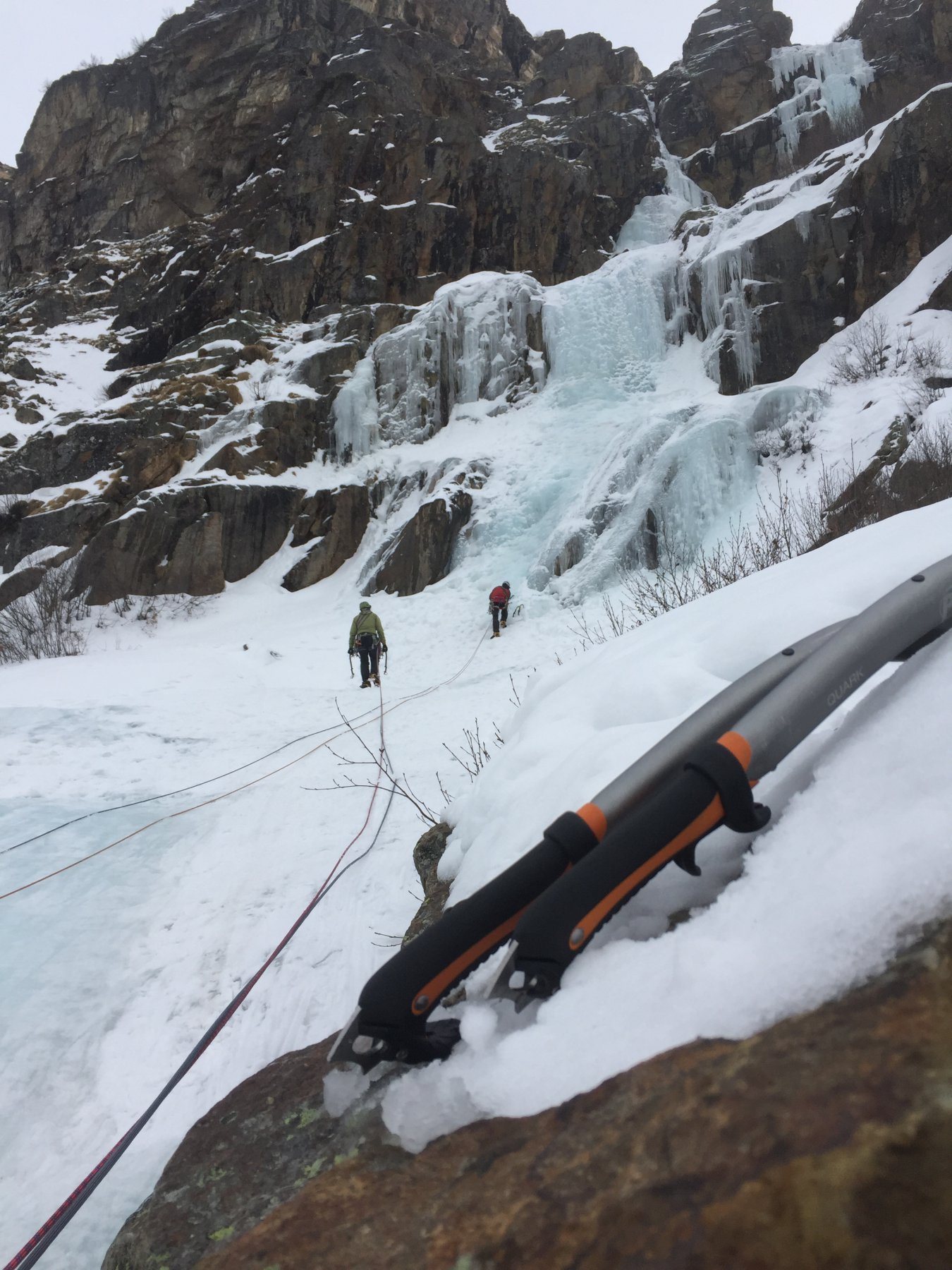 Attaccato dalla colata di sx e concatenato i primi due tiri, con passaggio a quattro zampe sotto un tetto prima di uscire su sosta a spit. Ghiaccio lavoratissimo e pieno di agganci, c’è da battere pochissimo e comunque su ghiaccio molto morbido. All’ultimo anfiteatro abbiamo scelto la linea più semplice sulla colata di sx, praticamente una scala totalmente gradinata dai numerosi passaggi.
