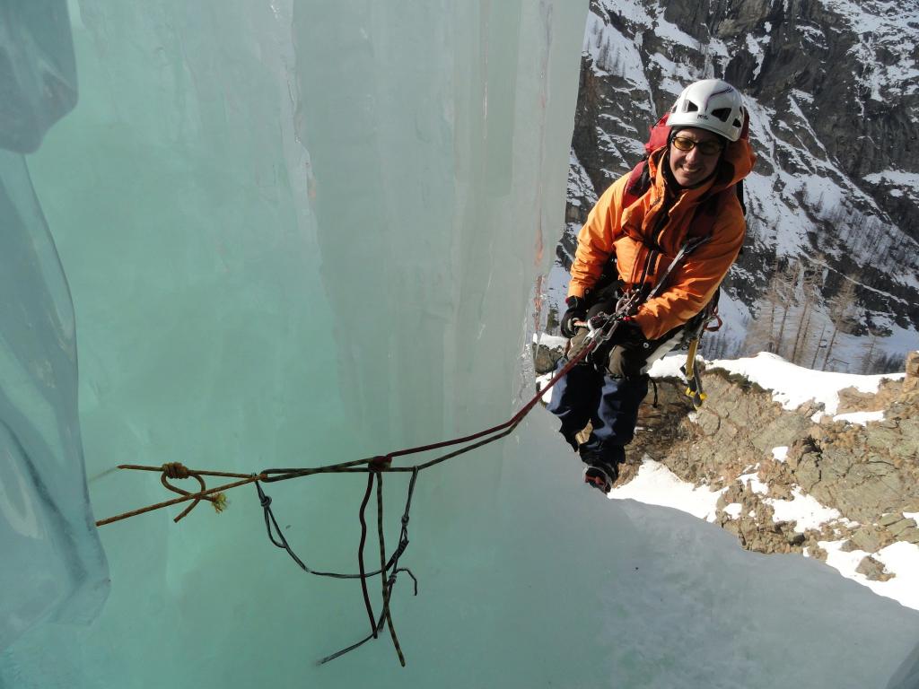 ghiaccio oggi un po’ troppo duro, per fortuna che gli agganci aiutano, anche se non bastano..su una cascata impegnativa come questa (almeno x il mio livello). l’ho trovata difficile forse più per la continuità nel suo complesso che per i passaggi singoli. è sempre molto verticale o leggermente strapiombante. a parte L4, nessun tiro banale (ne abbiamo fatti 6: 3 sul primo salto, 4° tiro facile che supera i 60 mt!, 5° tiro muretto di nuovo difficile, tiro finale corto per uscire sui piani di Money).