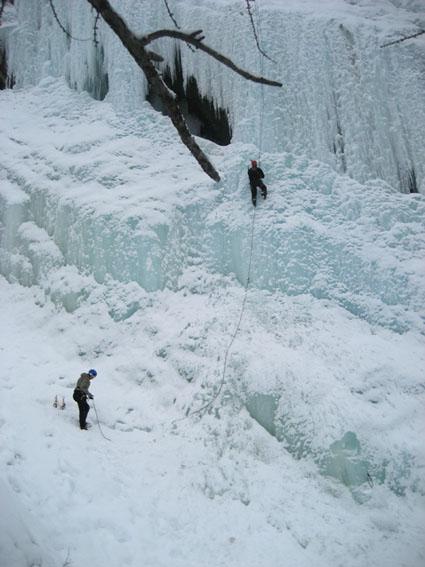 Iniziato l’avvicinamento sotto una fine nevicata e proseguito la gita sotto di essa.Le tre dita di neve cadute hanno reso particolarmente scivoloso l’avvicinamento e la discesa.Primo tiro veramente bello anche il secondo era bello e fotogenico ma un incidente abbastanza inusuale alla picozza di Marco ci ha fatto perdere un mucchio di tempo per cui abbiamo preferito fermarci lì anche perchè eravamo un pò sbroccati dal freddo causato da due lunghe soste.