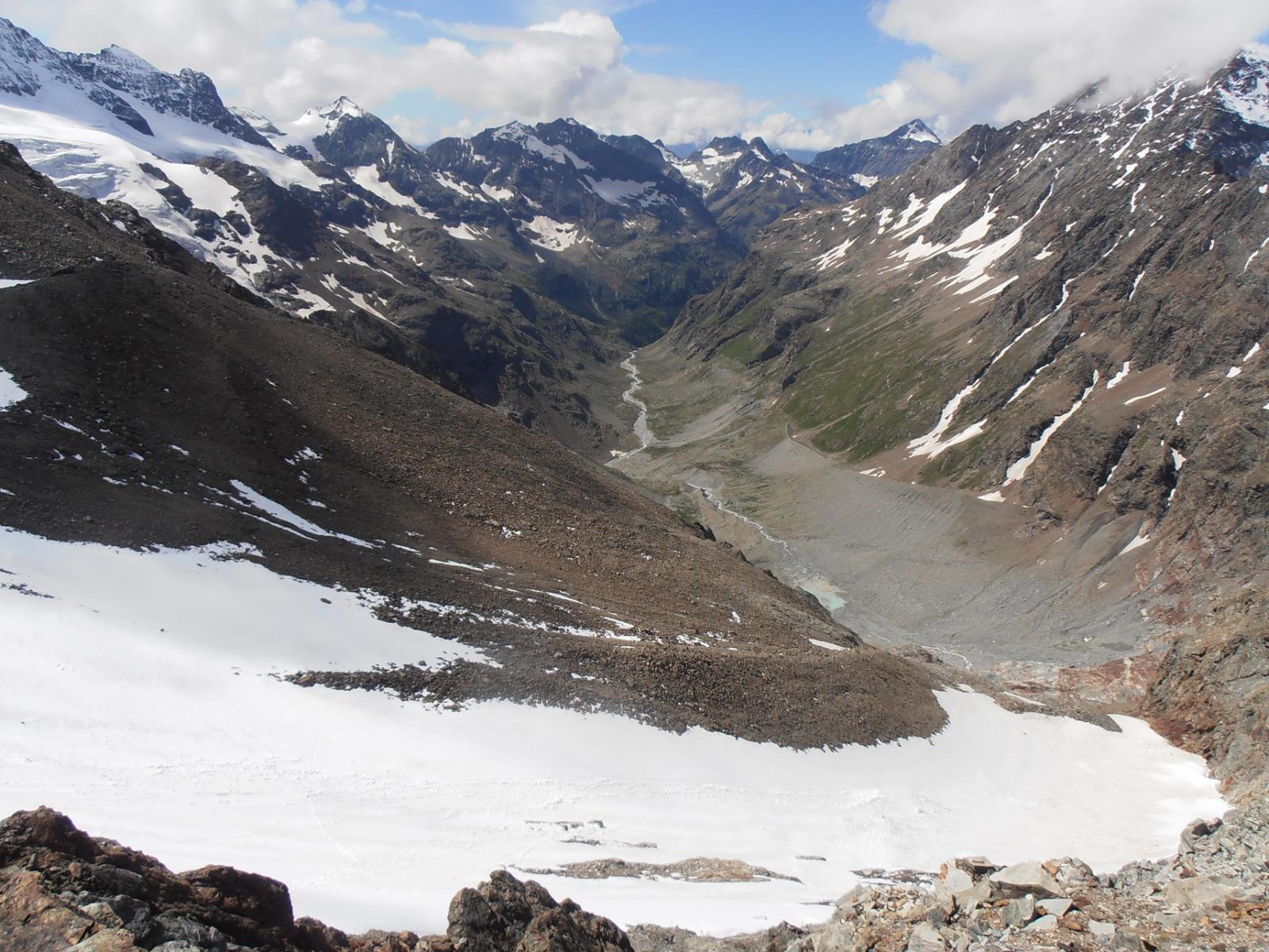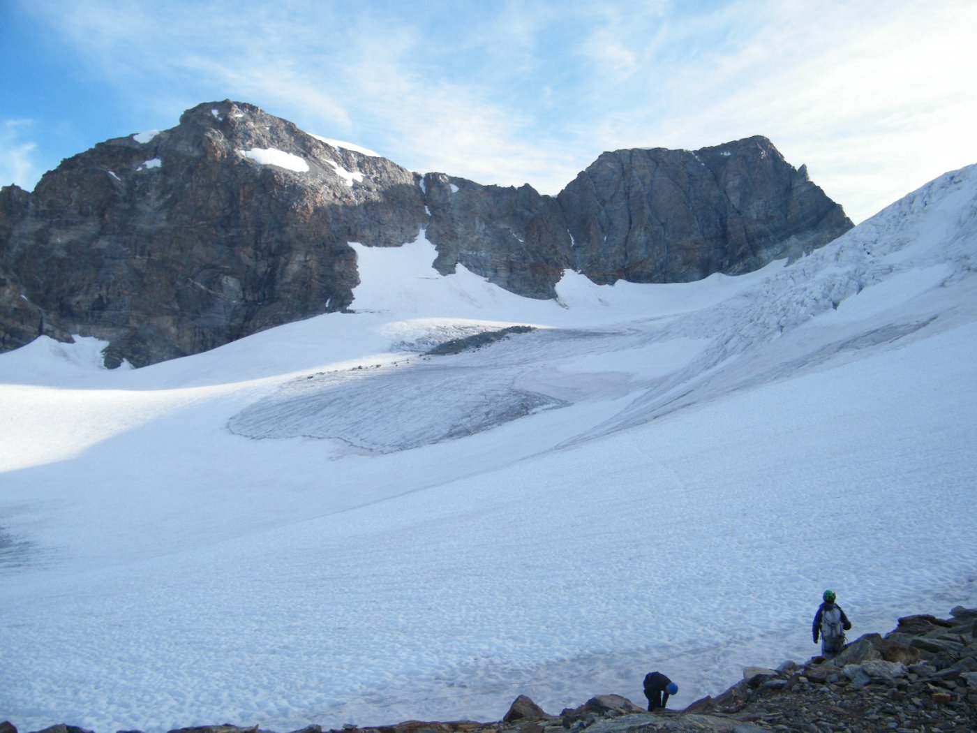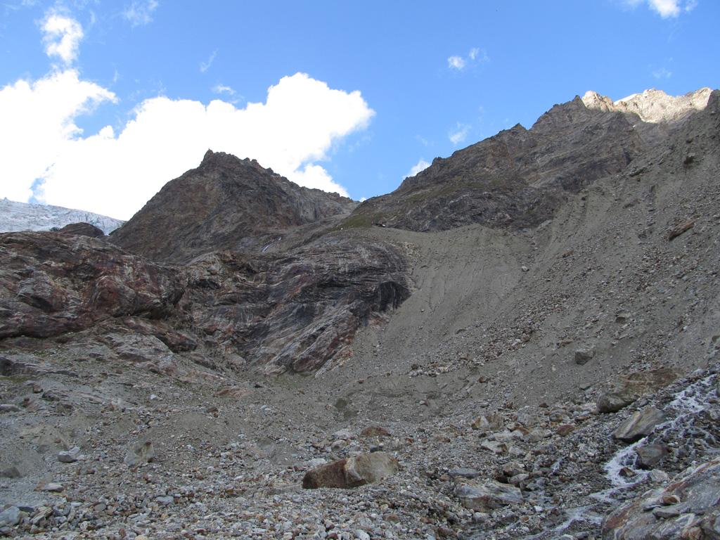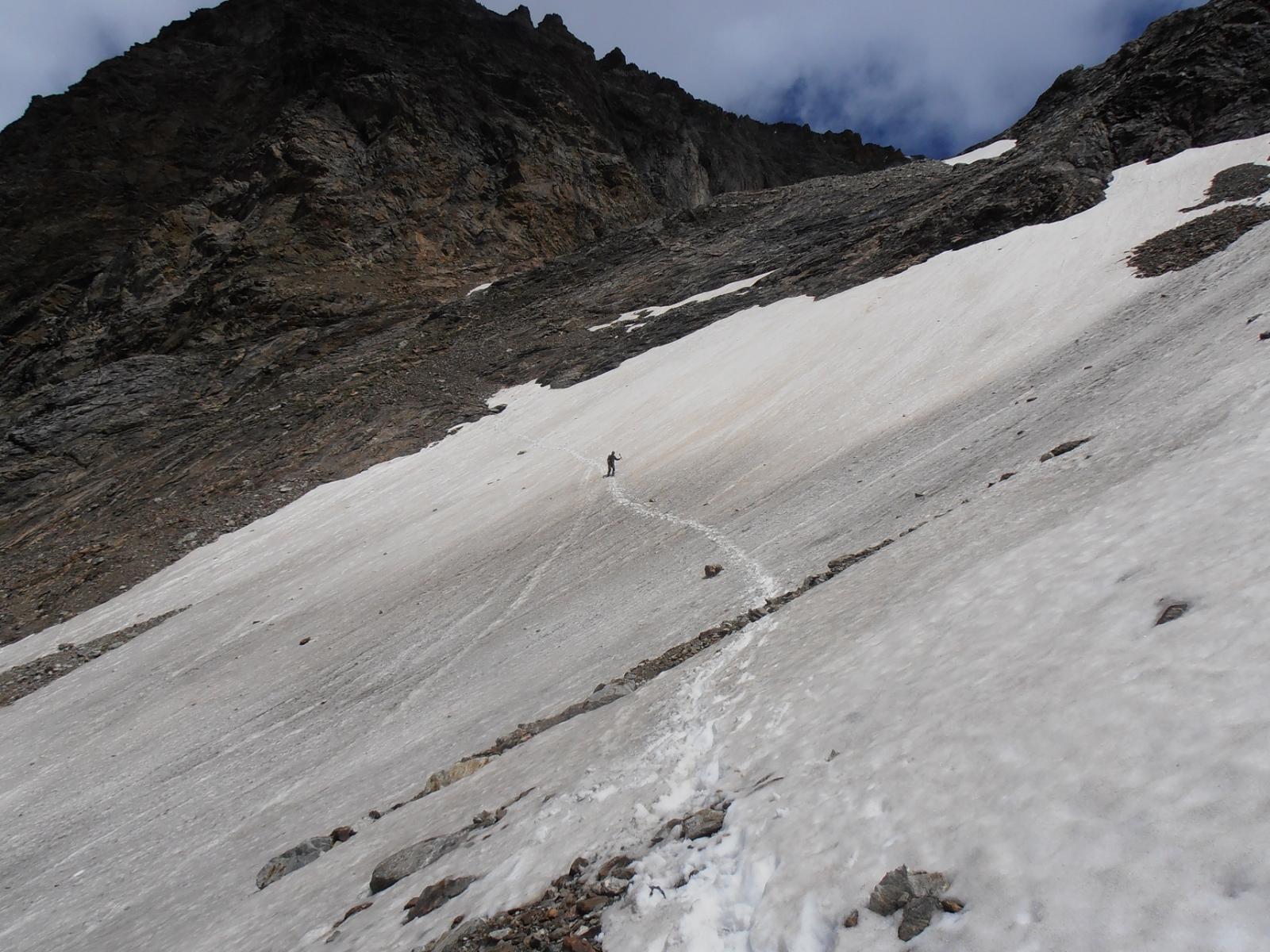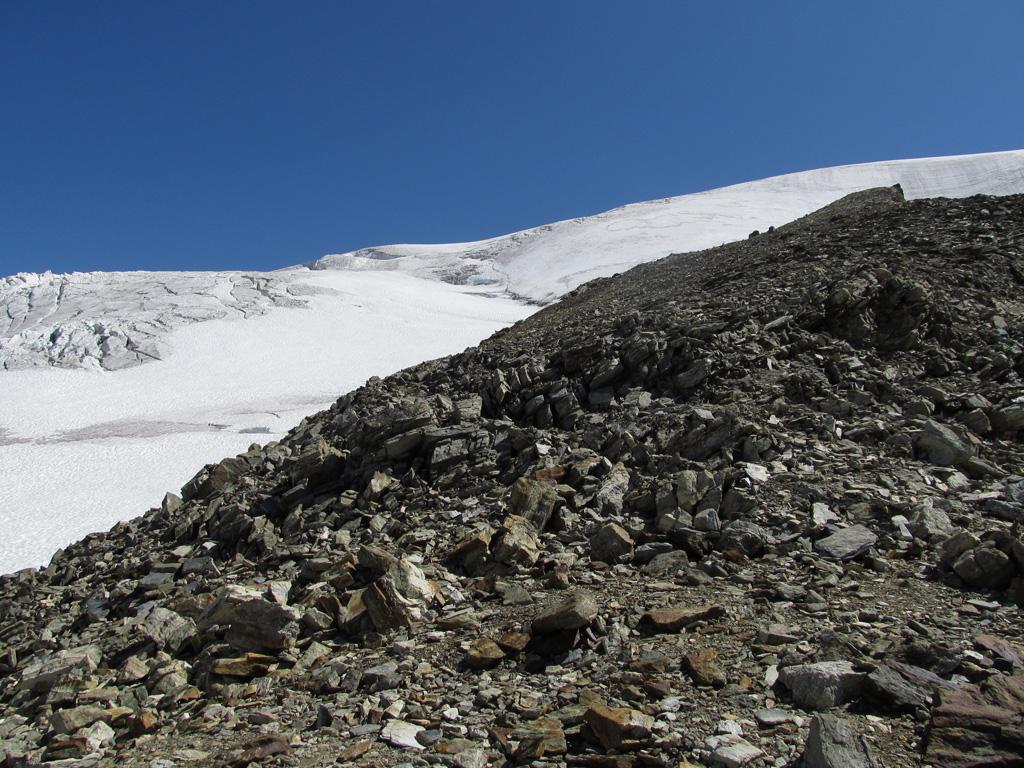 Il 2° giorno si segue il sentiero che sale dietro il rifugio, inizialmente su terriccio ed erba, poi su terreno più ripido e faticoso, tra roccette e placconate sporche di detrito, ripido ma non esposto. Si lascia sulla destra su un cucuzzolo un pluviometro, entrando in una conca morenica superiore, dove il terreno migliora e le varie tracce di sentiero sono più comode.
