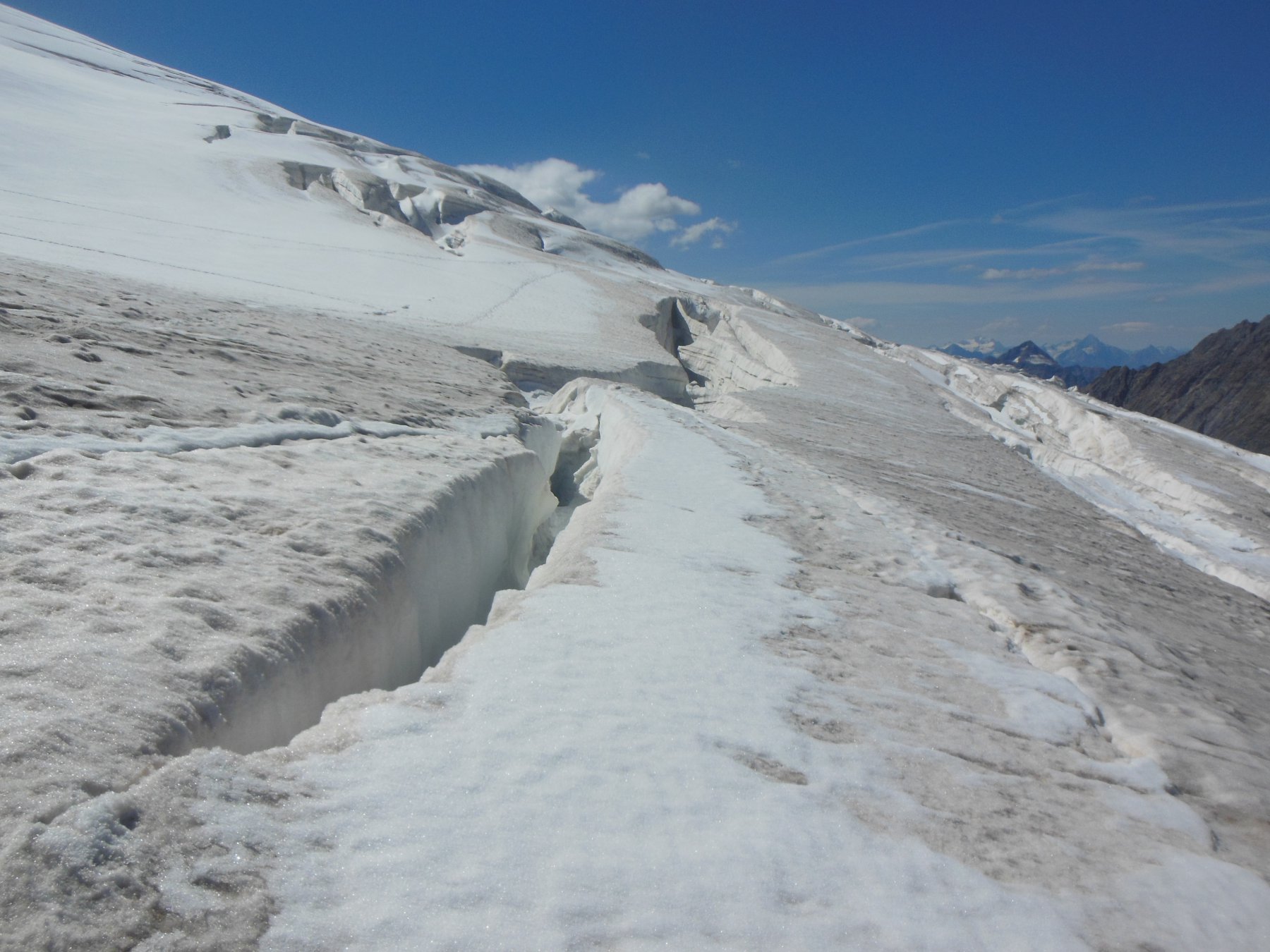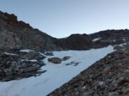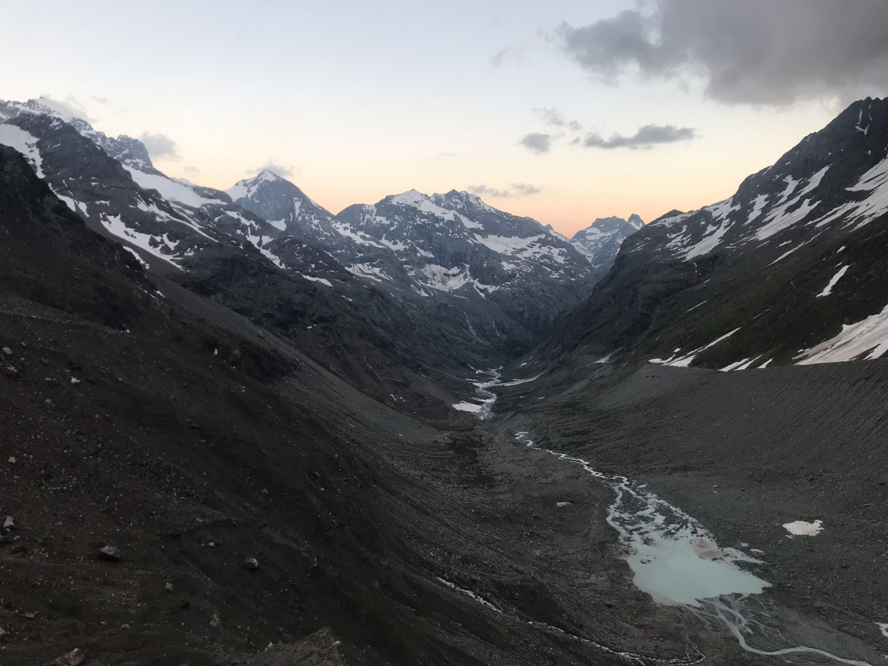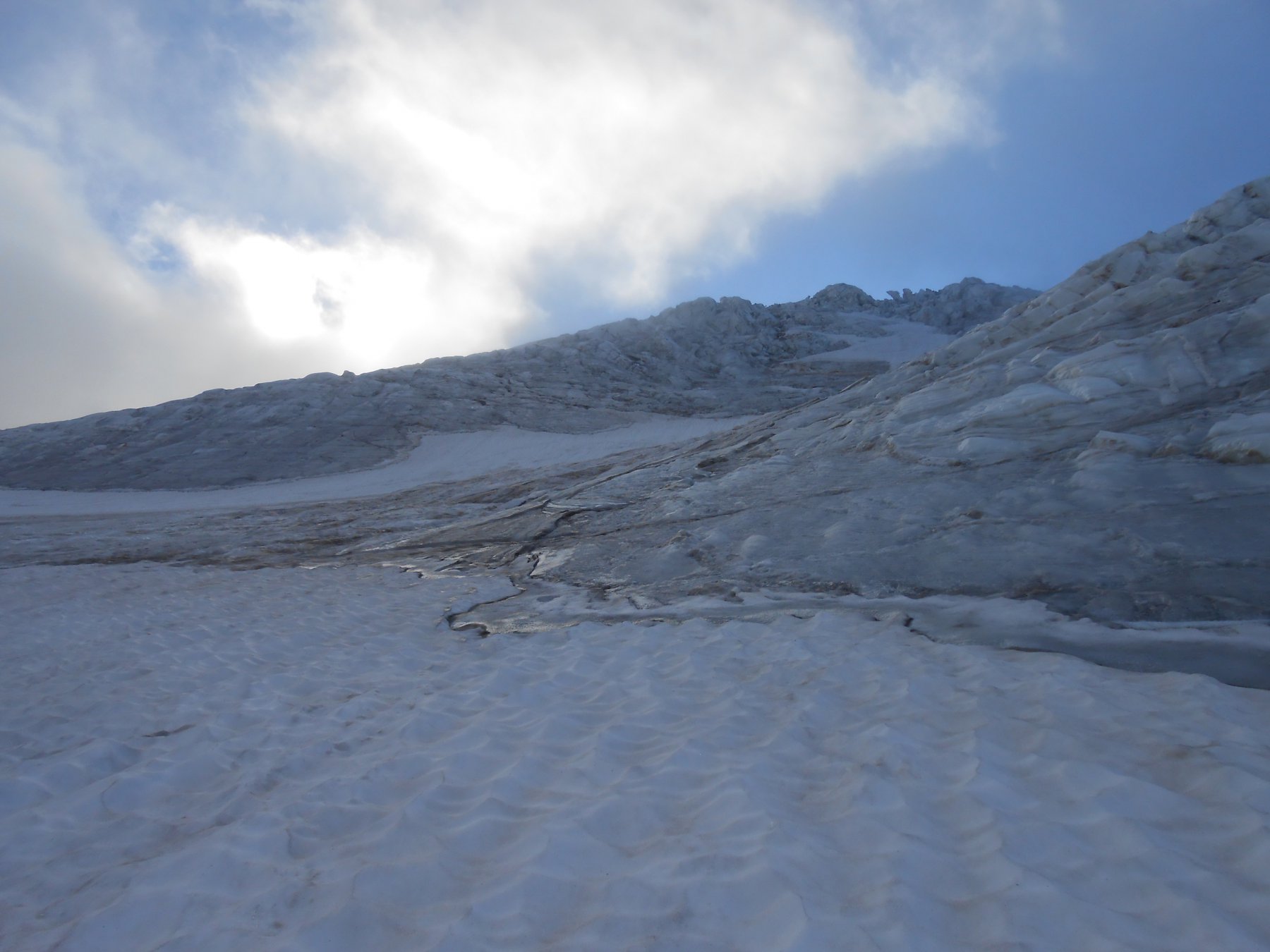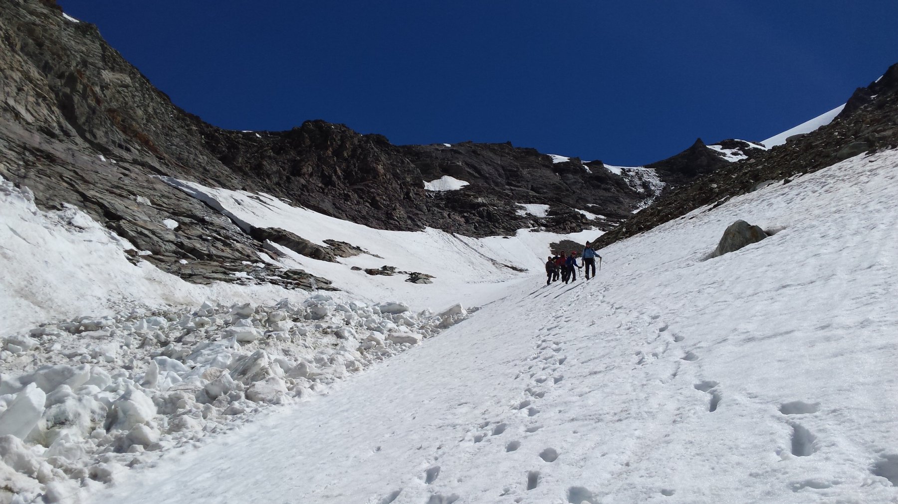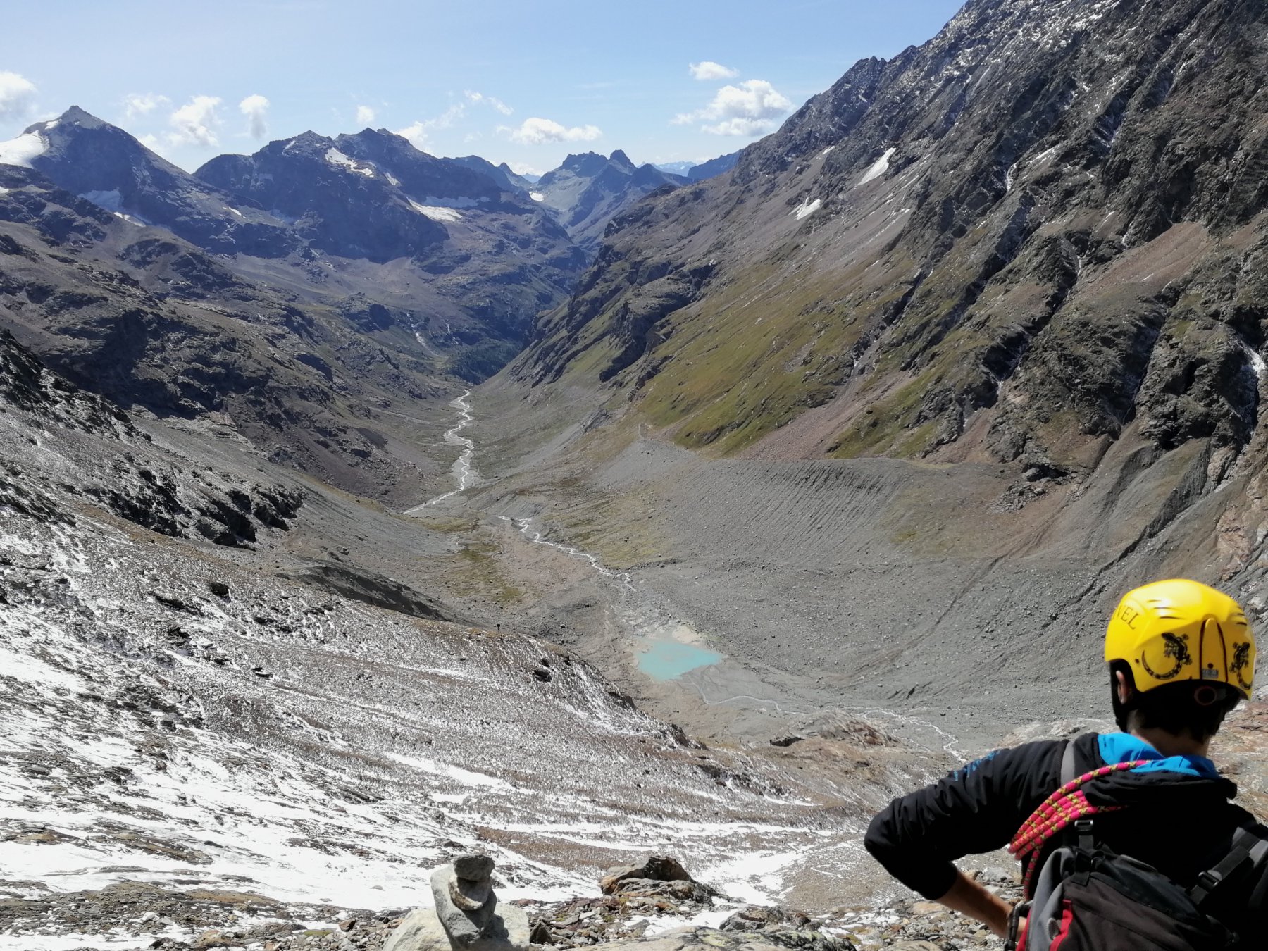 Il 2° giorno si segue il sentiero che sale dietro il rifugio, inizialmente su terriccio ed erba, poi su terreno più ripido e faticoso, tra roccette e placconate sporche di detrito, ripido ma non esposto. Si lascia sulla destra su un cucuzzolo un pluviometro, entrando in una conca morenica superiore, dove il terreno migliora e le varie tracce di sentiero sono più comode.