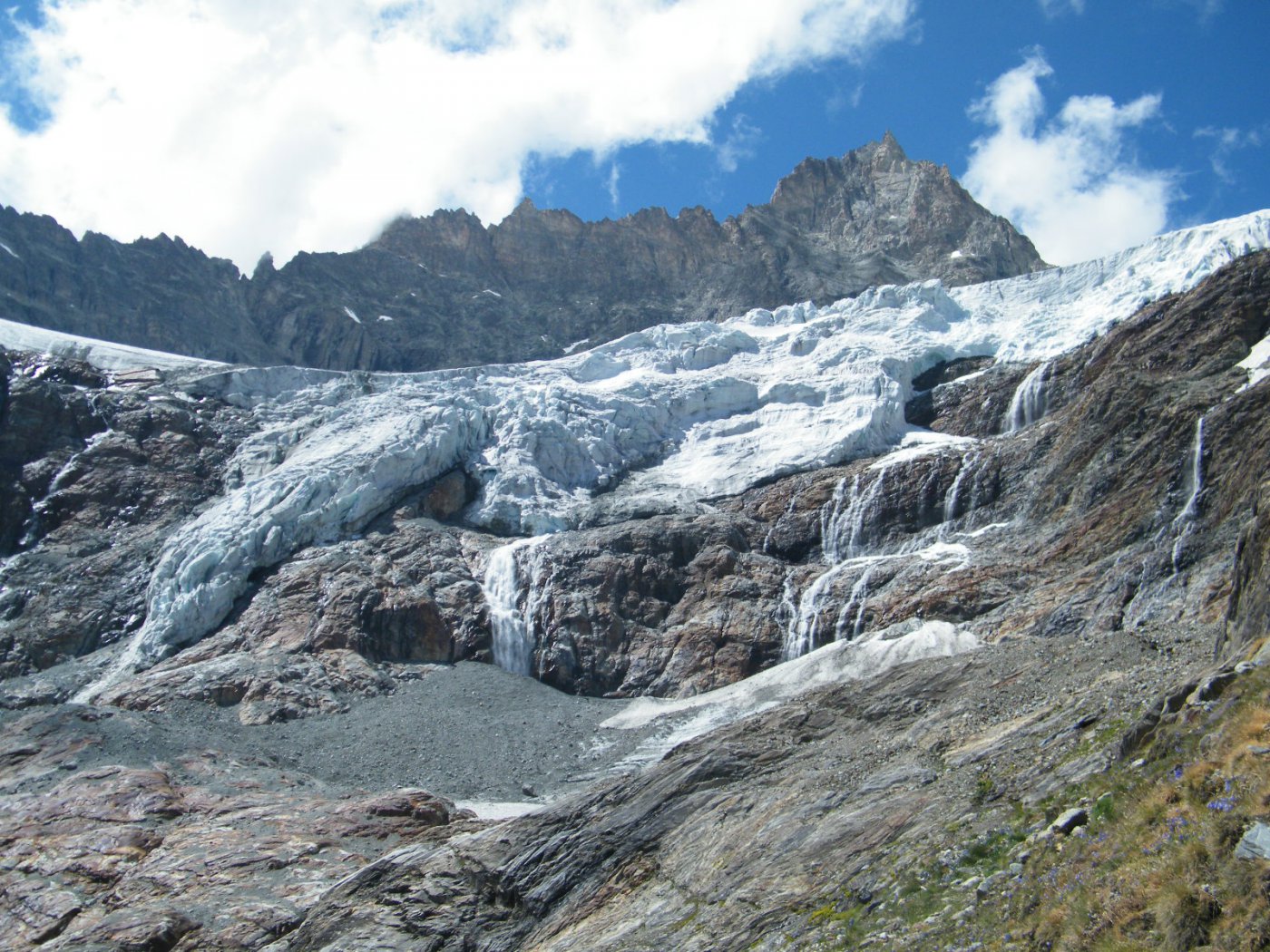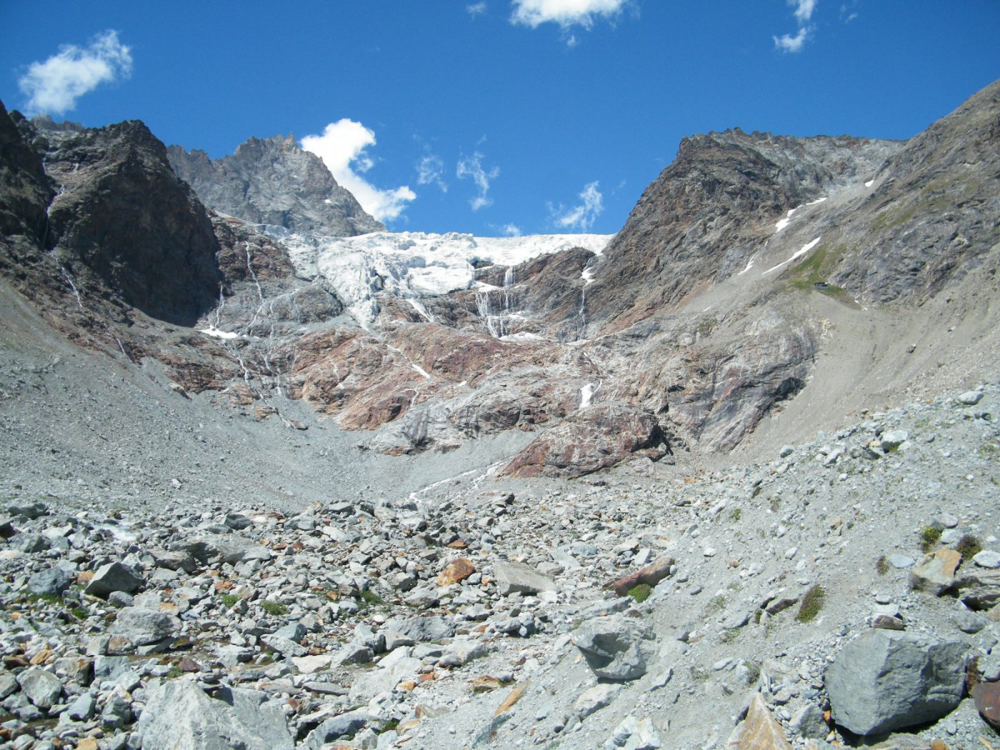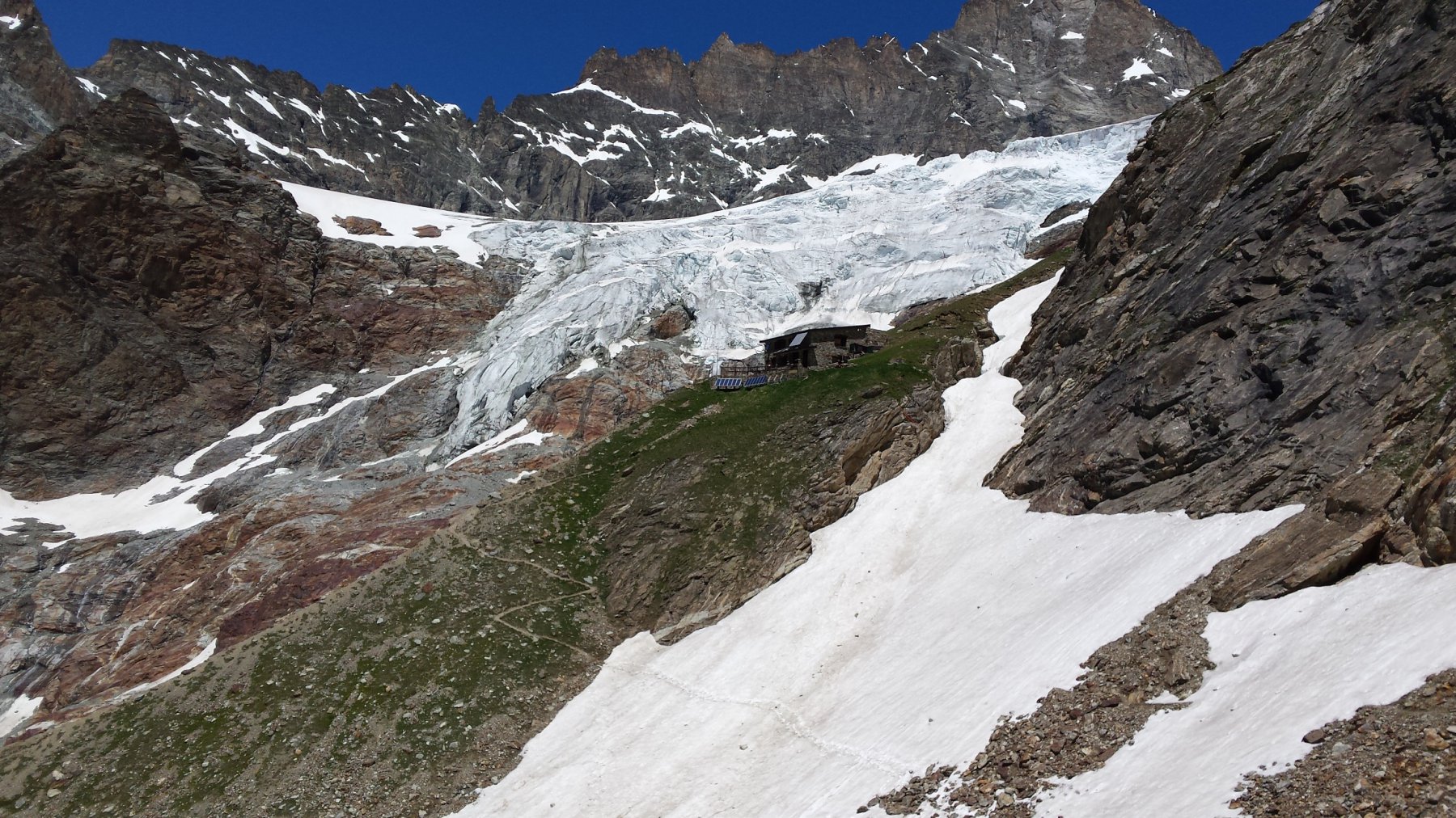 Dall’ultimo ponticello è possibile puntare direttamente al rifugio costeggiando sulla destra il torrente con il vecchio sentiero che tramite alcune catene fisse e scalette nella roccia porta al rifugio: questo tratto può risultare pericoloso nel caso di cadute di seracchi dal ghiacciaio soprastante.