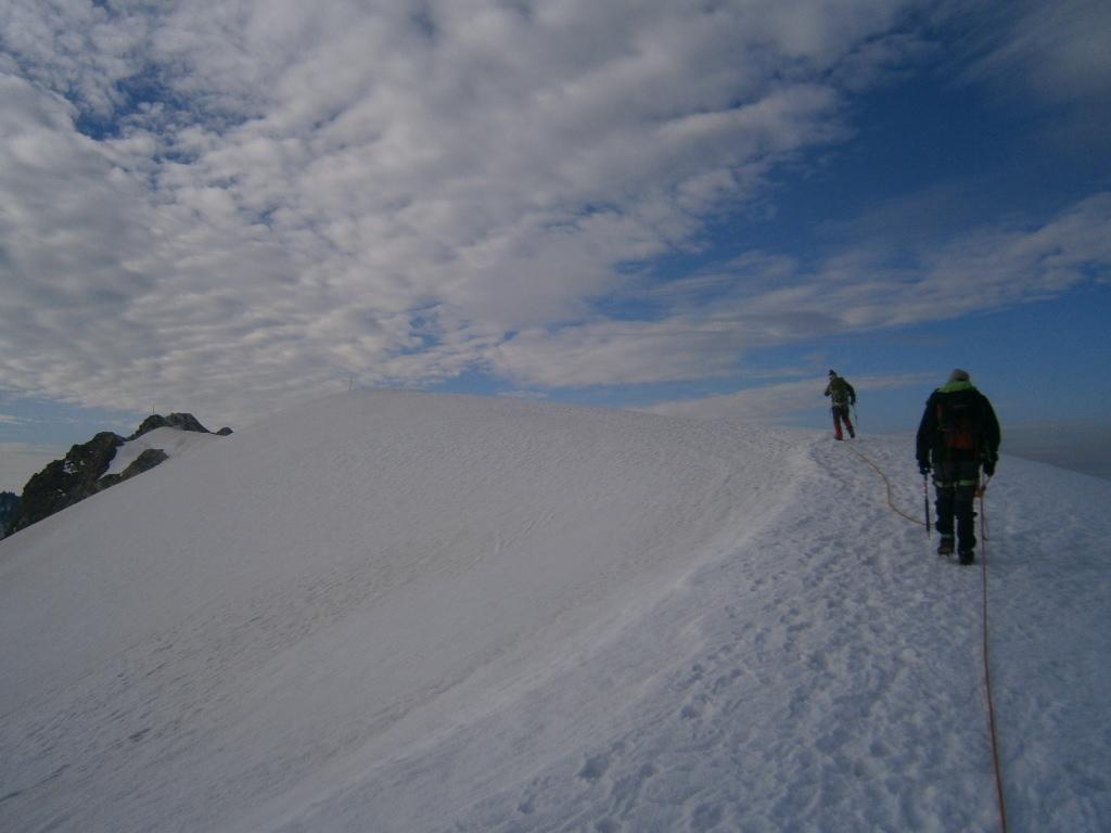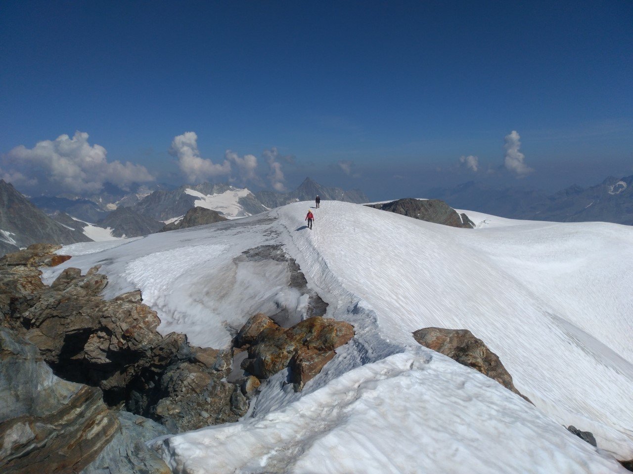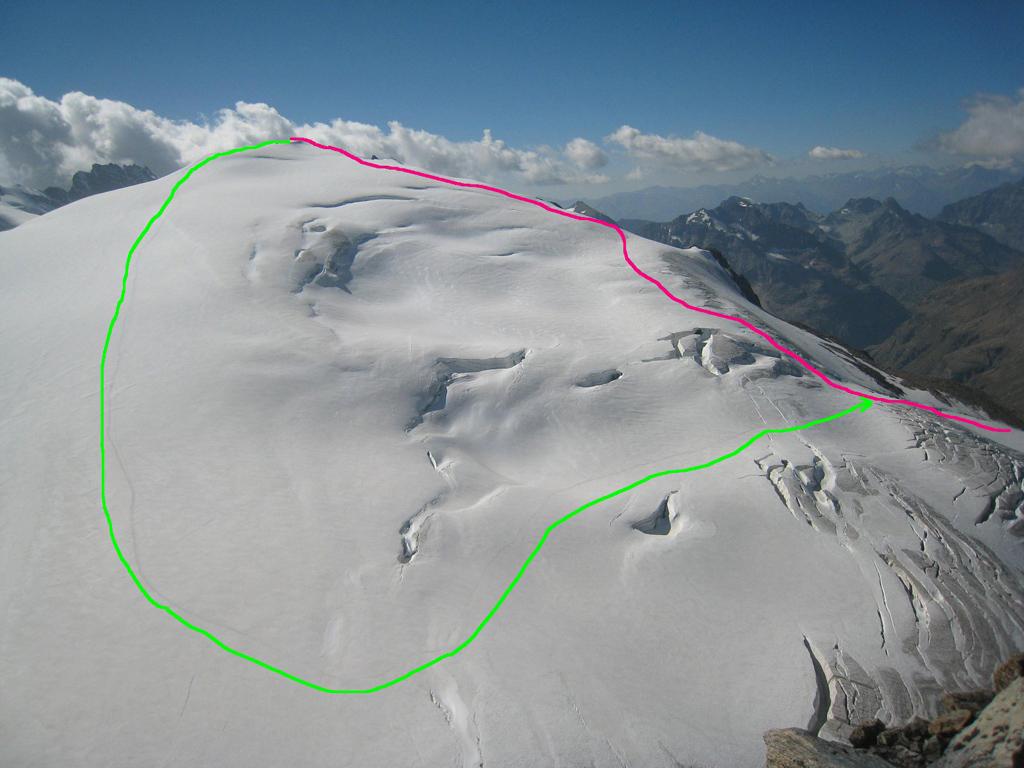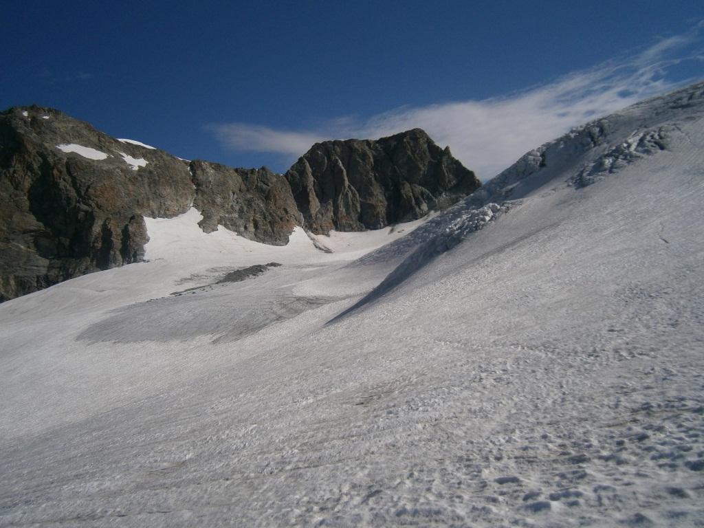 Si mette piede sul ghiacciaio di Tza de Tzan, dove in base alle condizioni il percorso può variare. Si può risalire più o meno direttamente il ripido pendio (30 max 35°) non lontano dal filo di cresta, oppure puntando prima a nord, e poi volgendo a destra, per superare un dedalo di seracchi, per portarsi quasi sotto la ripida parete rocciosa della Tète Blanche. La seconda ipotesi compie un giro più dolce e anche più lungo. Si piega decisamente a destra raggiungendo la dorsale nevosa che scende dalla Tete de Valpelline, ormai sopra il colle. Si percorre l’ampia dorsale glaciale in direzione sud, raggiungendo un panettone arrotondato, dove inizia la breve e più sottile cresta nevosa, che conduce alle roccette di vetta.