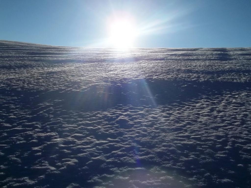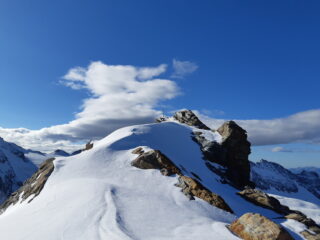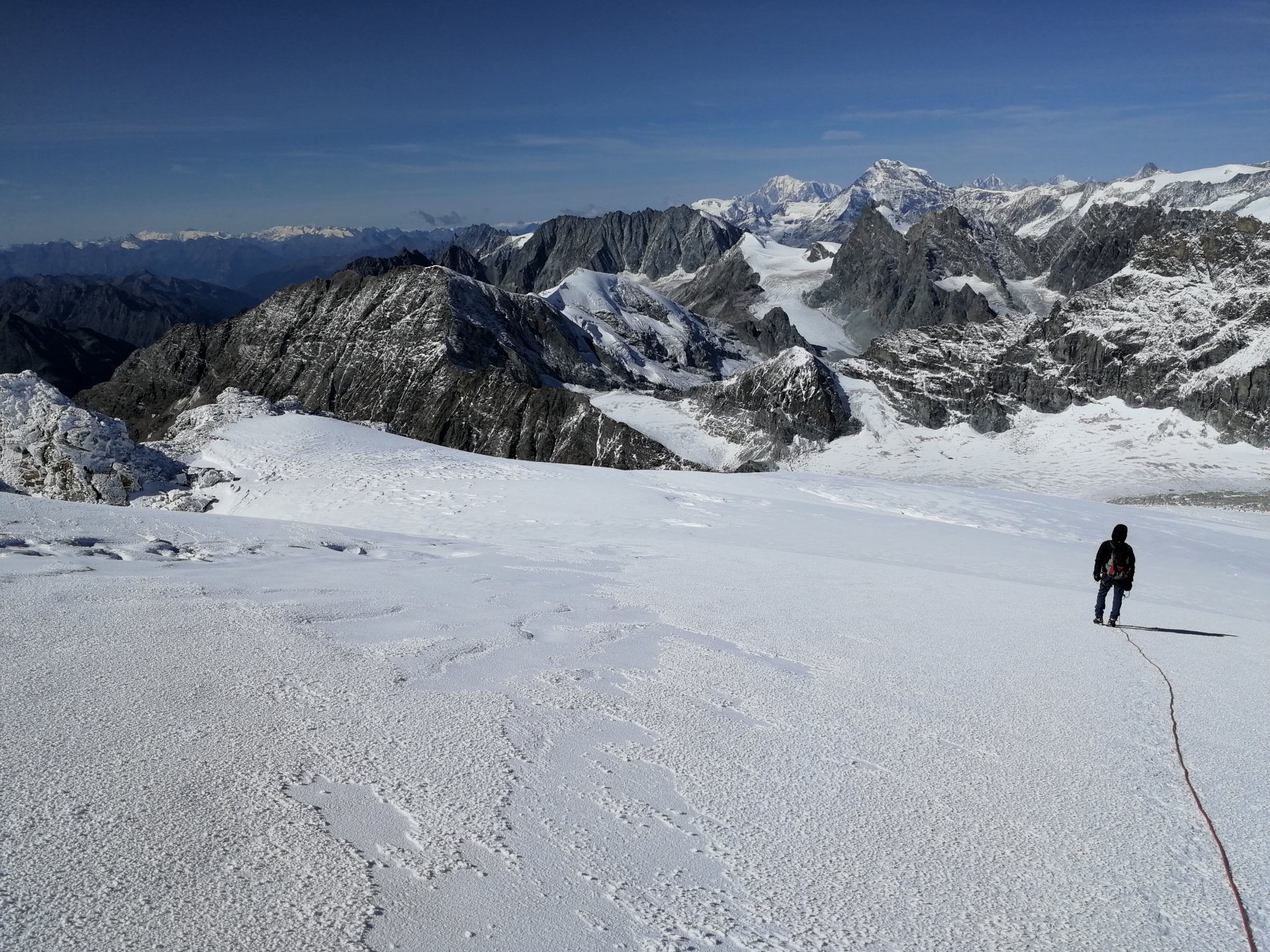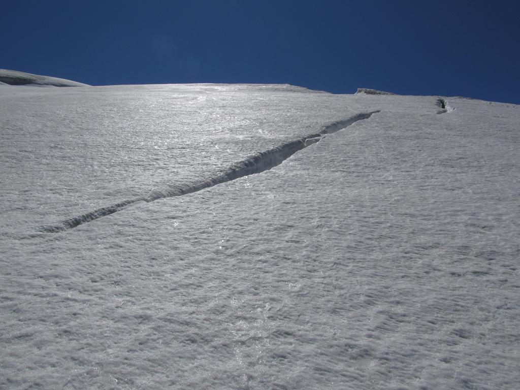 Si mette piede sul ghiacciaio di Tza de Tzan, dove in base alle condizioni il percorso può variare. Si può risalire più o meno direttamente il ripido pendio (30 max 35°) non lontano dal filo di cresta, oppure puntando prima a nord, e poi volgendo a destra, per superare un dedalo di seracchi, per portarsi quasi sotto la ripida parete rocciosa della Tète Blanche. La seconda ipotesi compie un giro più dolce e anche più lungo. Si piega decisamente a destra raggiungendo la dorsale nevosa che scende dalla Tete de Valpelline, ormai sopra il colle. Si percorre l’ampia dorsale glaciale in direzione sud, raggiungendo un panettone arrotondato, dove inizia la breve e più sottile cresta nevosa, che conduce alle roccette di vetta.