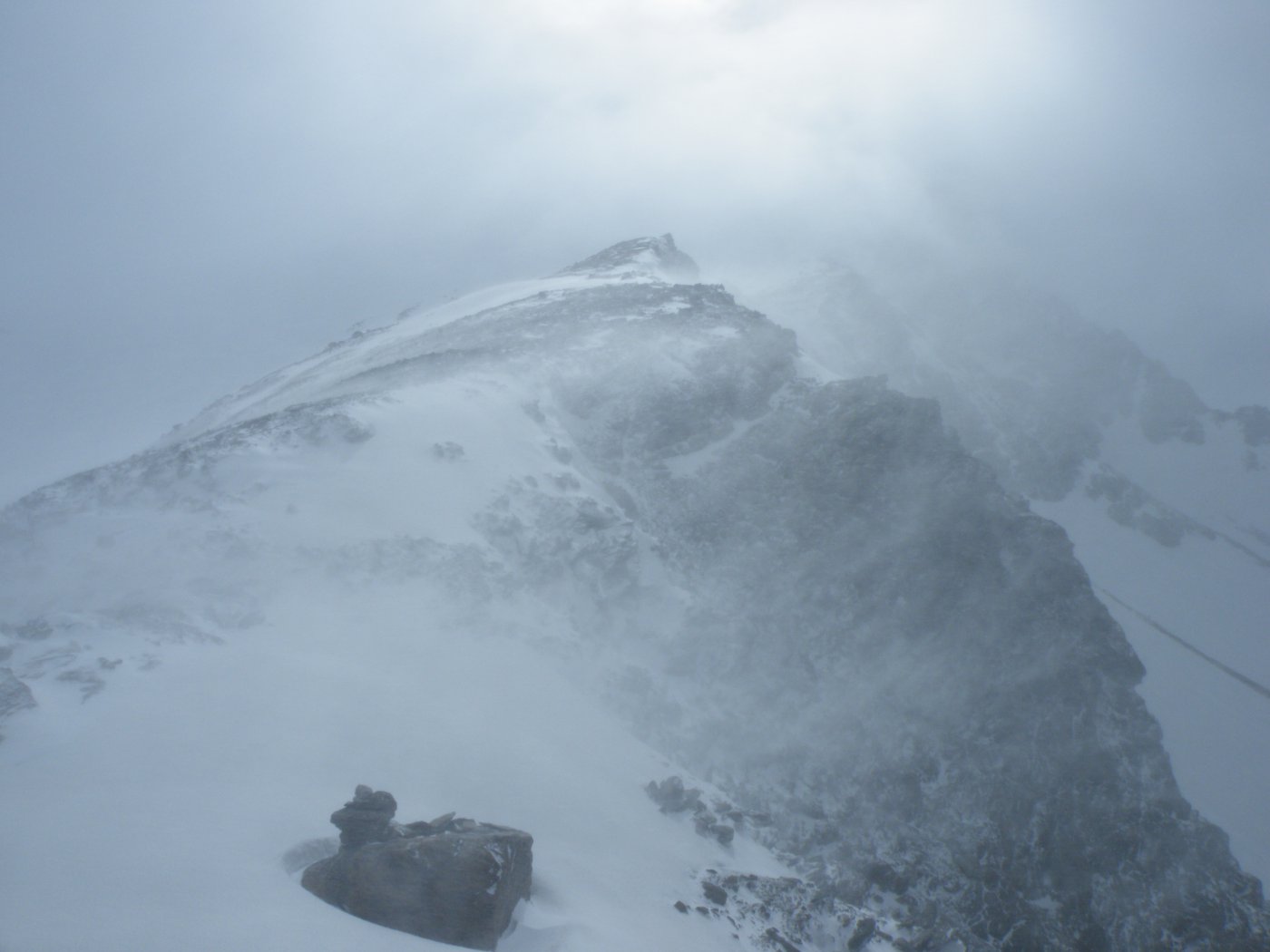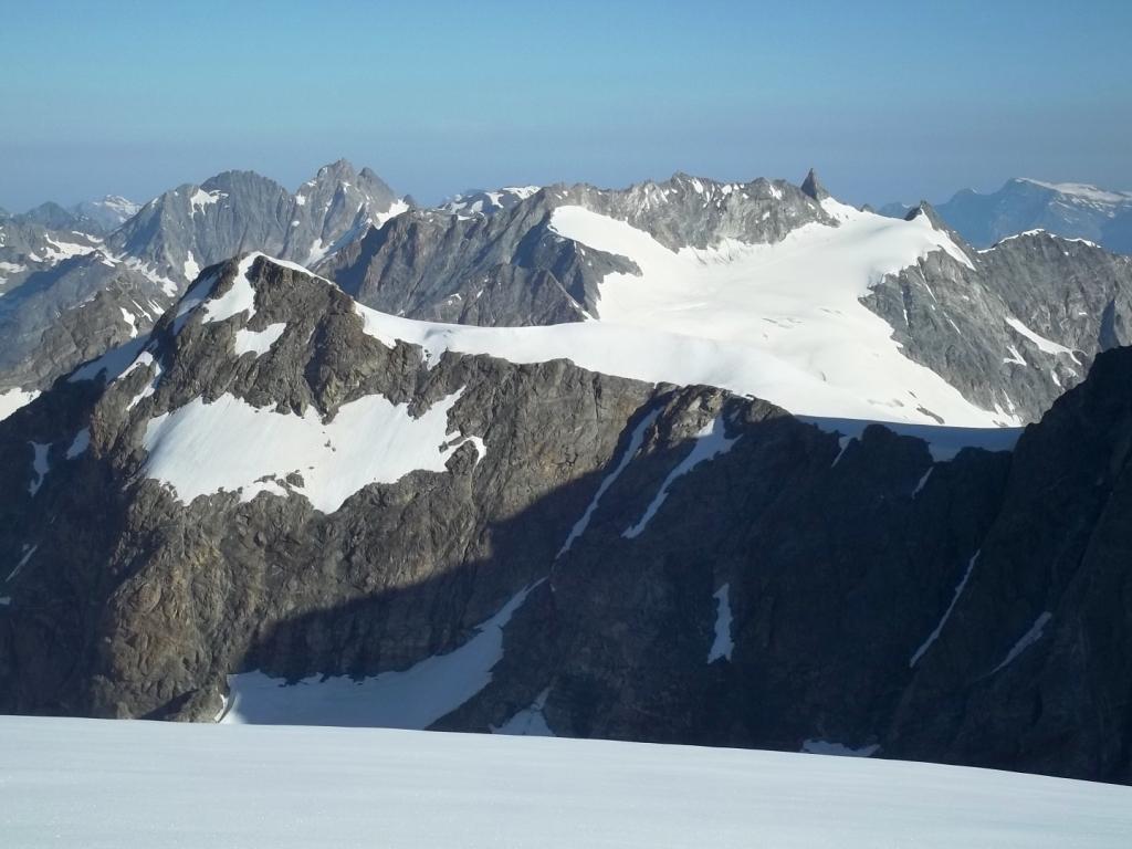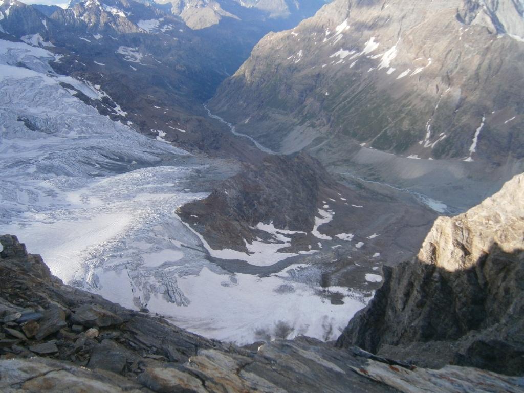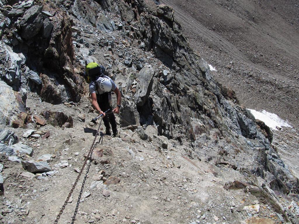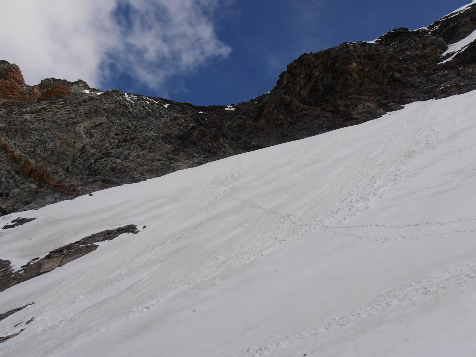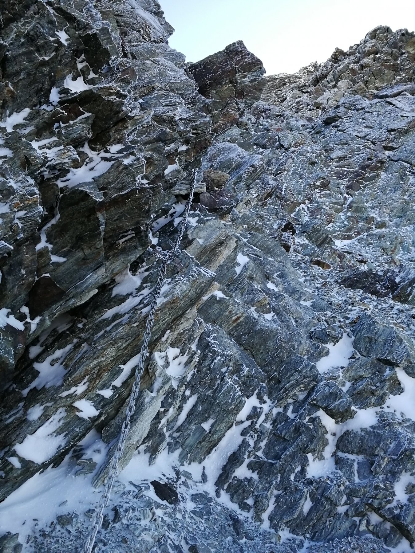 Si seguono i numerosi ometti mantenendosi al centro della pietraia di medie dimensioni (nevai a inizio stagione, la cui parte finale di accesso alle catene può essere di 40° per un breve tratto), fino a raggiungere la base del canale roccioso che scende dal Col de la Division. Qui conviene indossare il casco, sopratutto in presenza di altre persone sopra, e con l’aiuto di catene si risalgono le roccette, comunque ben appigliate e non esposte ma sporche di detrito, sbucando al Col de la Division 3314 m.