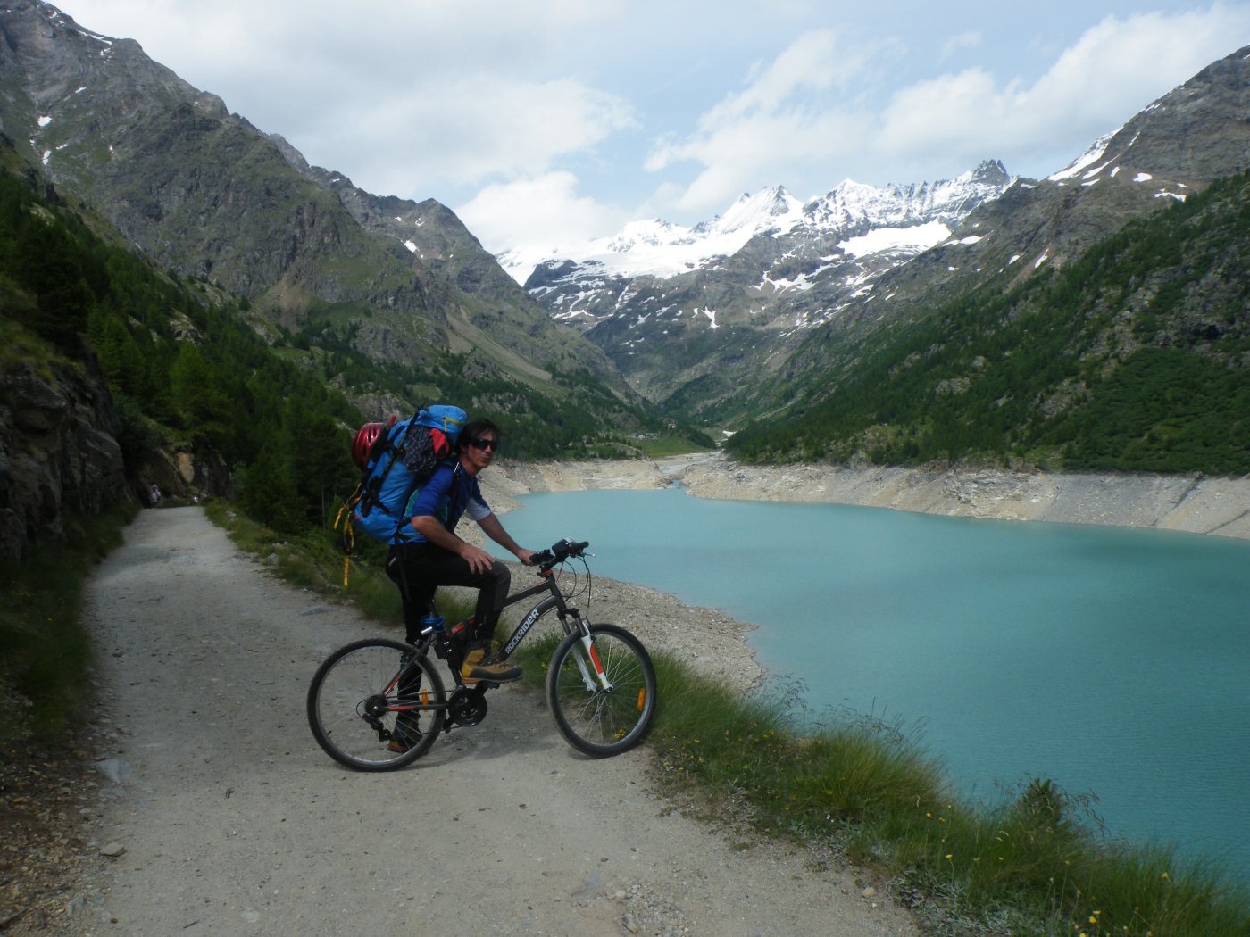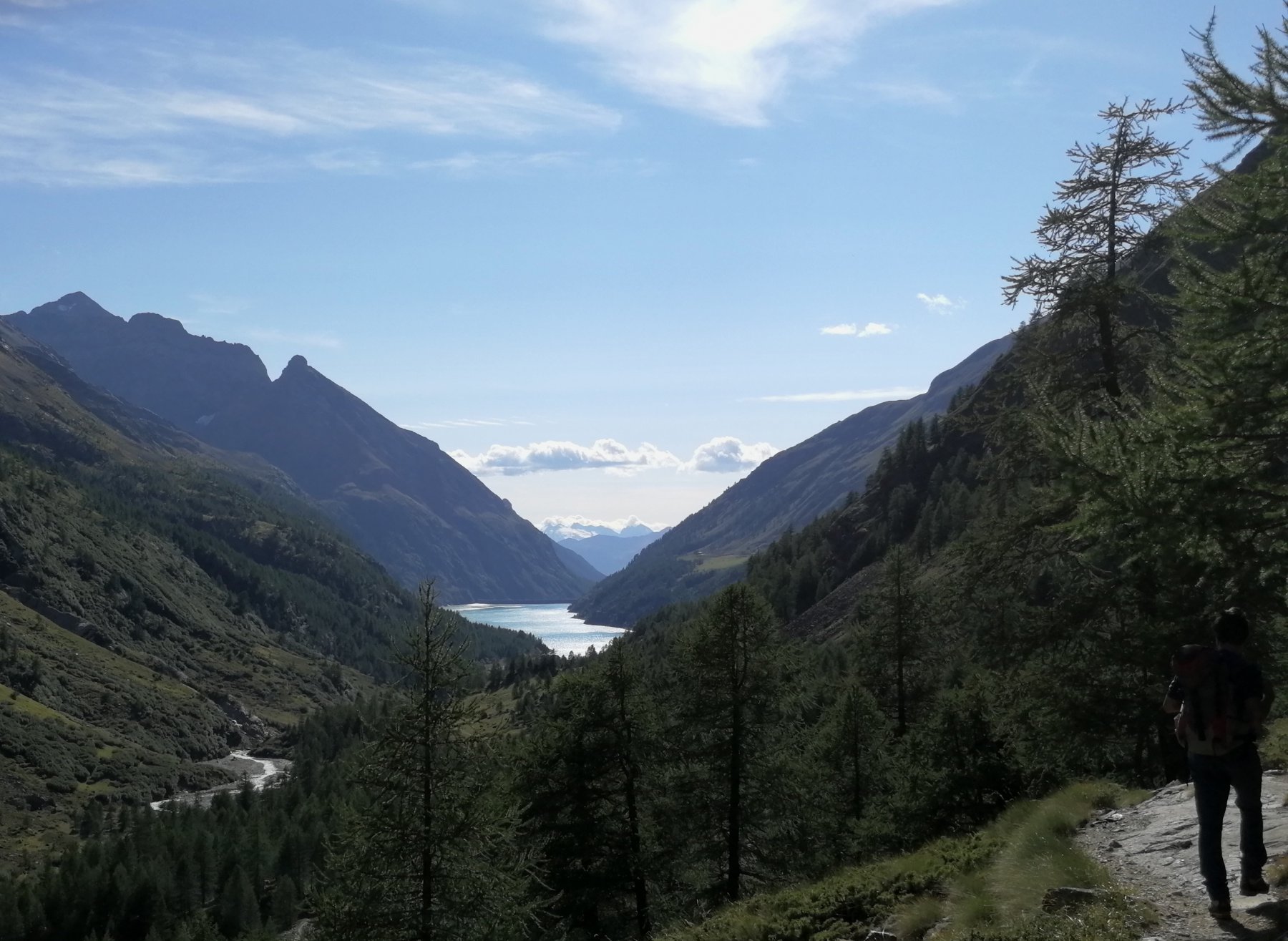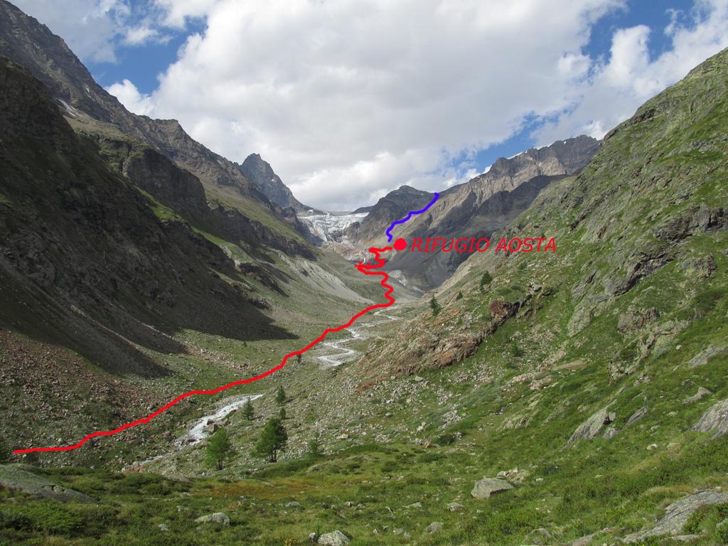 Itinerario molto lungo (solo il rifugio Aosta dista circa 12 km dal parcheggio). Il dislivello tiene conto dei saliscendi della strada lungo il lago e del sentiero di accesso al rifugio.