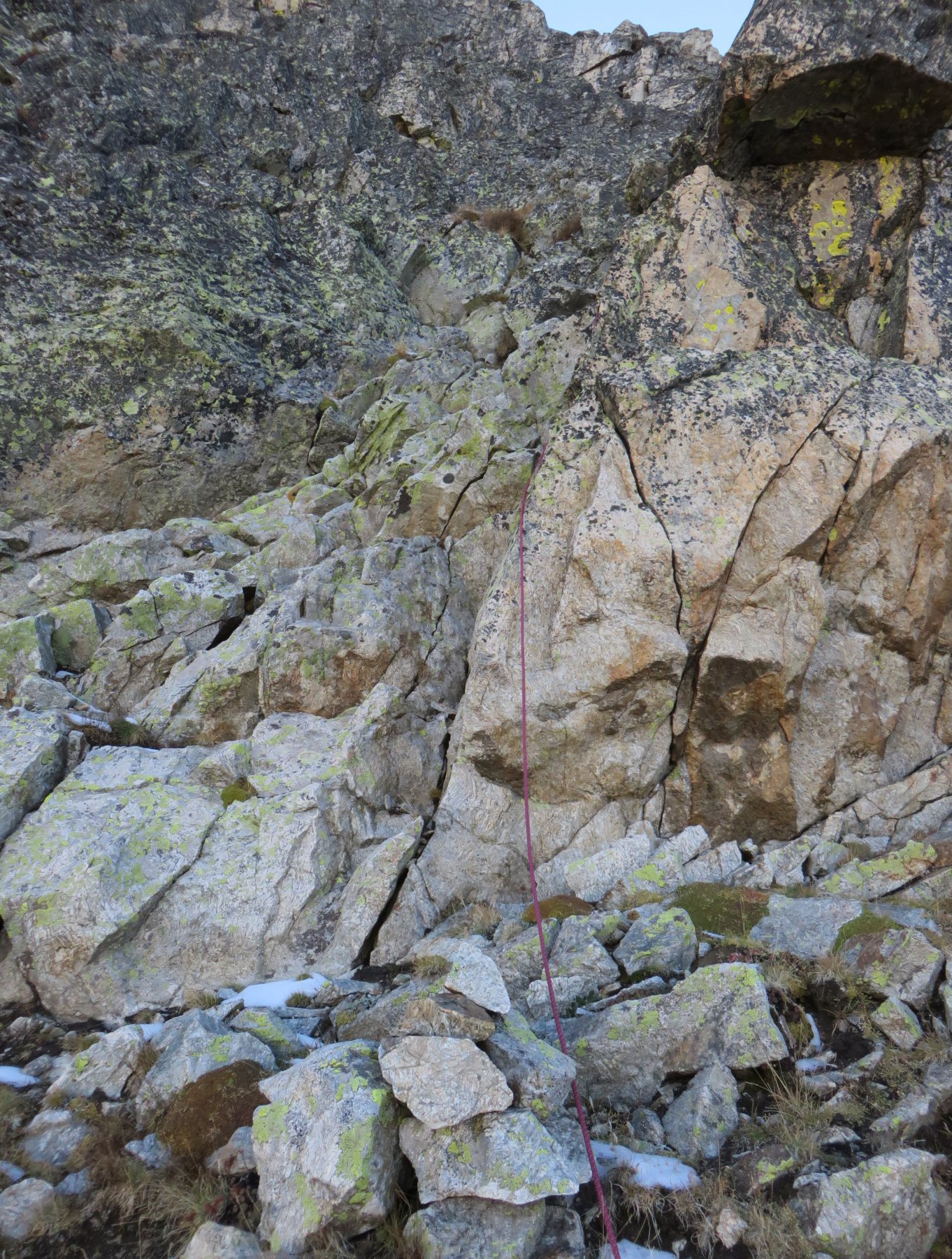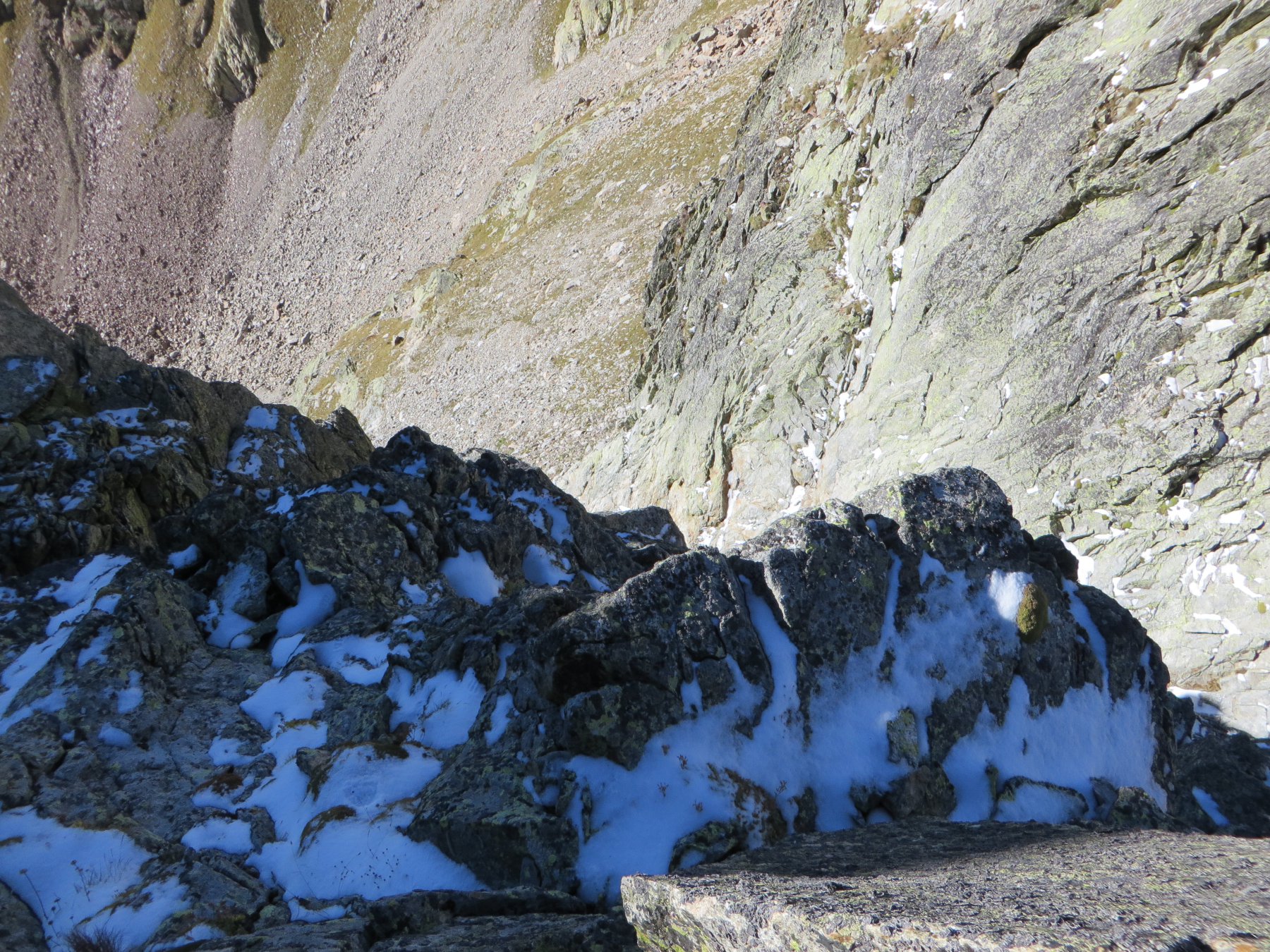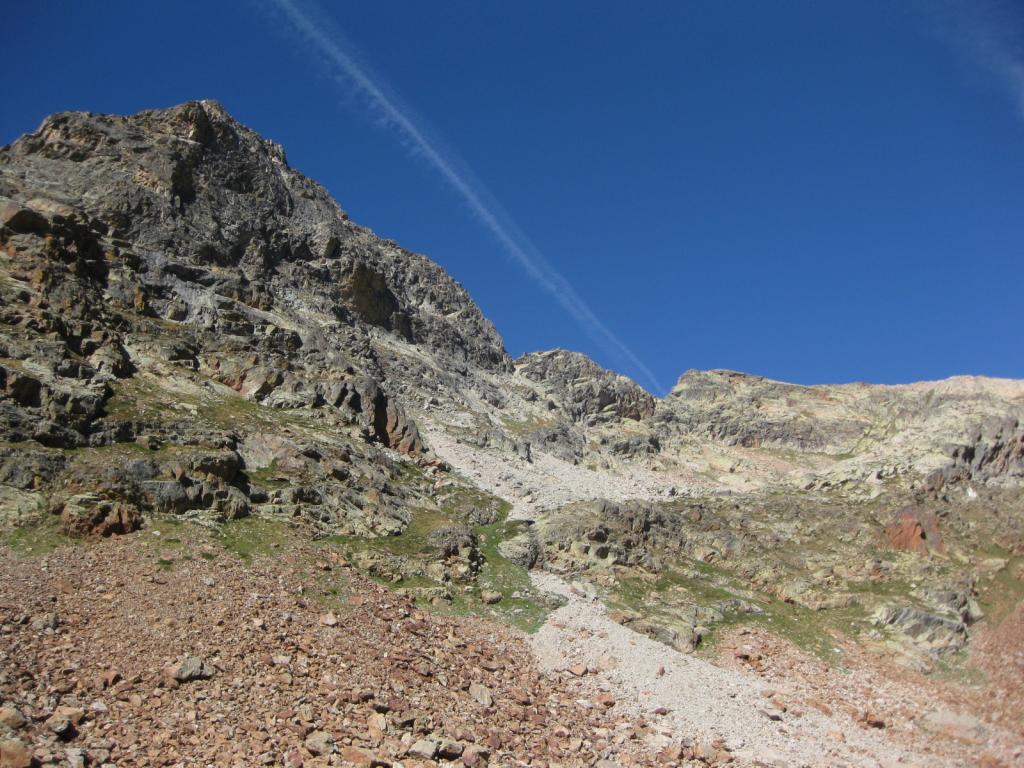 Superato un salto non esposto(II+) si risale una placca liscia (35 m II+ esposto, filo di ferro a mo’ di corda fissa) fino a pochi metri sotto il colle (m 2800 circa ore 1); si traversa a sx per superare il salto (II+) e si tocca il colle.