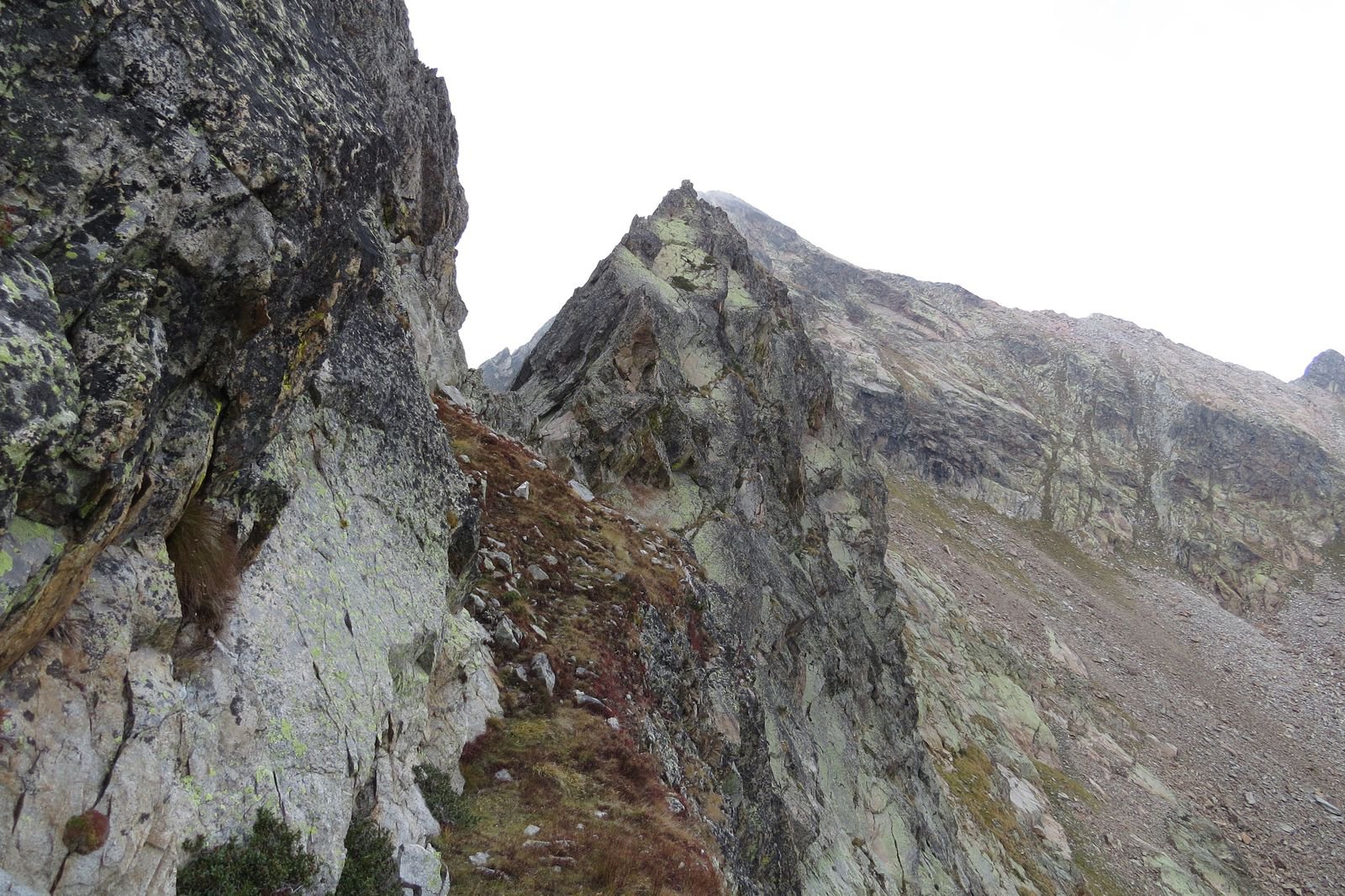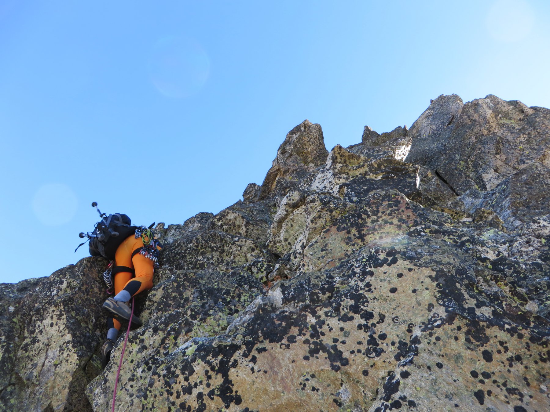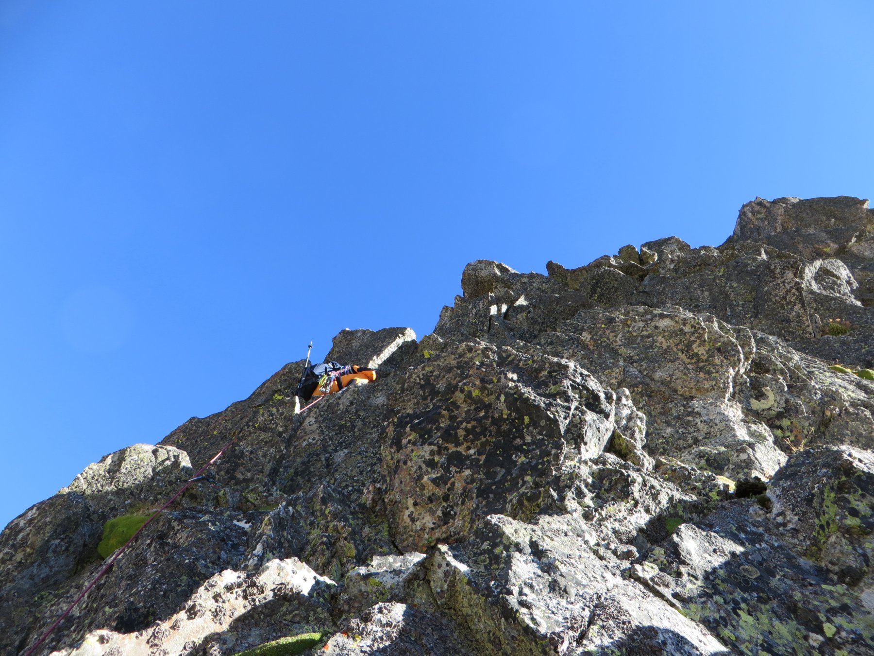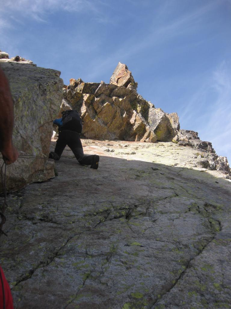 A questo punto si attacca direttamente la cresta nord-ovest su placche e rocce verticali (III/III+).