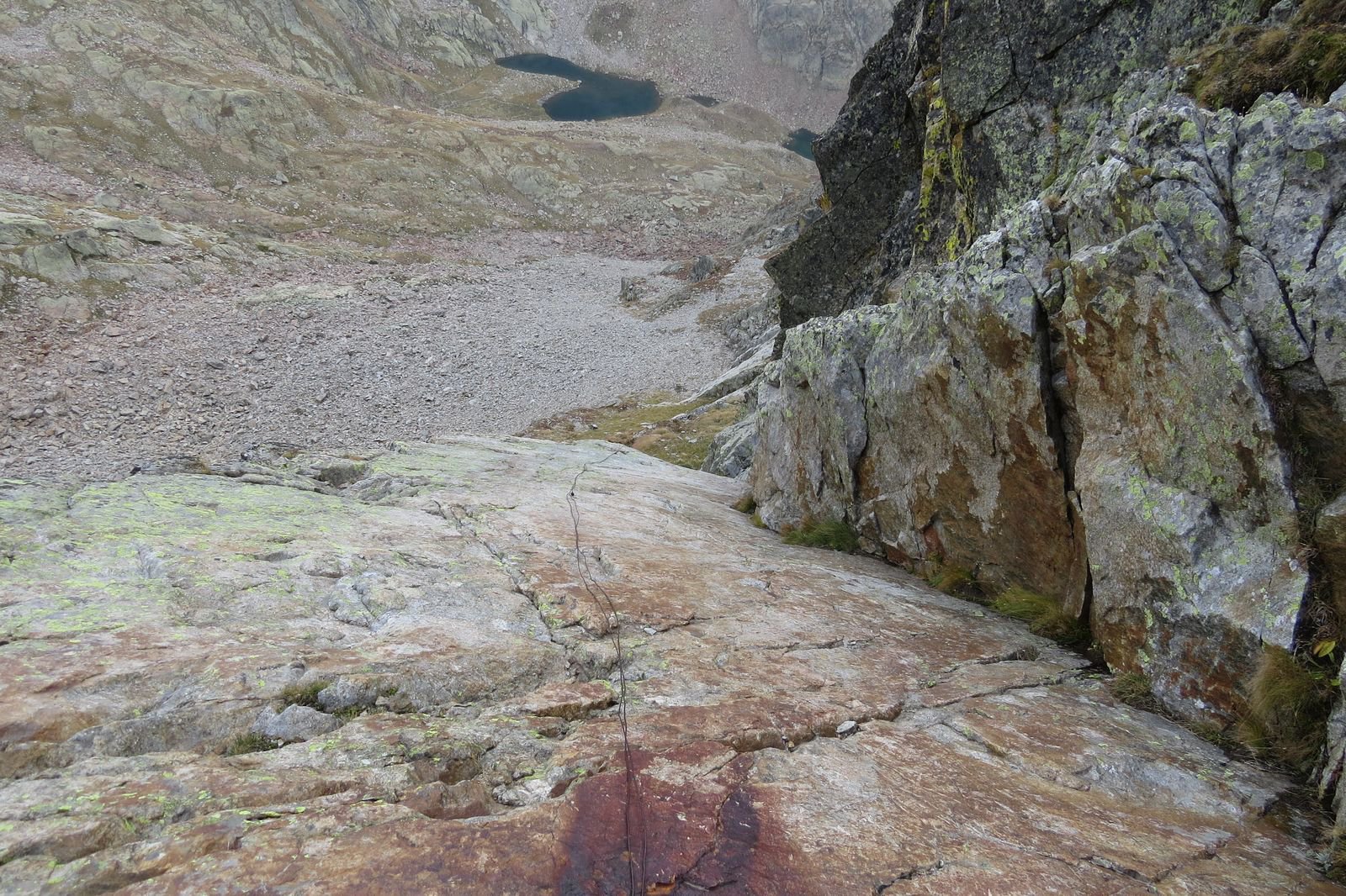 Proseguire ora oltre il primo Lago inferiore di Valrossa, subito dopo abbandonare il sentiero per il Colle est della Paur e risalire al meglio prima su pietraia poi su chine erbose in direzione dell’evidente Colle del filo di Ferro.