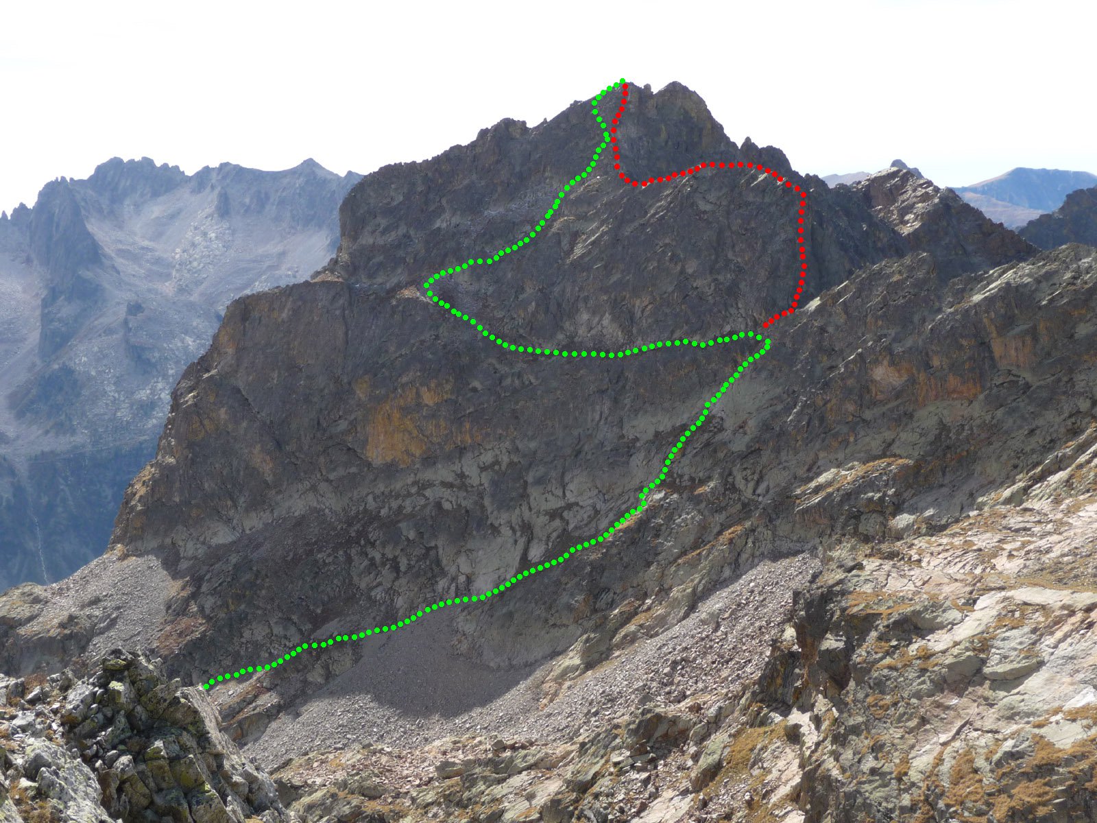 Dopo un primo tratto quasi verticale segue un tratto orizzontale, lo si percorre verso SE sul filo o sul fianco Valle Stura (II/II+) fino ad un intaglio dove si incrocia la via normale e la si segue fino in cima m 2894 (passi di II), ometto di pietre, o restando poco a sx ancora sul filo (1 ora dal colle).
