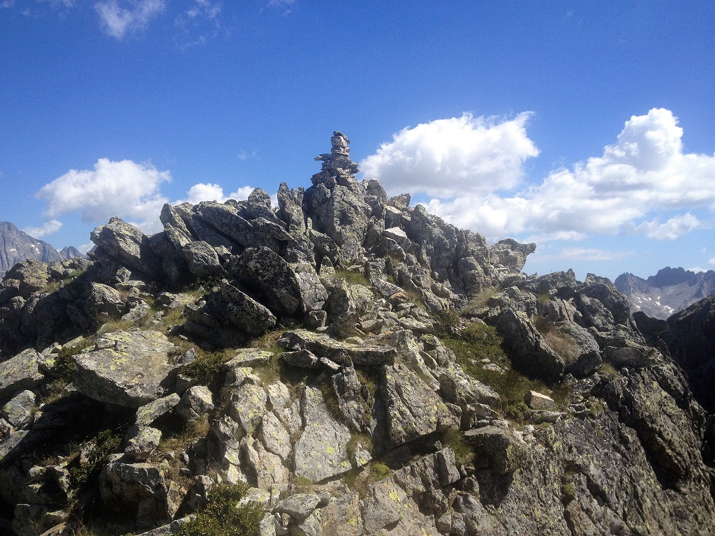 Si attacca in una rampa erboso-rocciosa sulla verticale dell’intaglio tra le due cime e poi su con intuizione e fantasia (2-2+) sino in vetta.