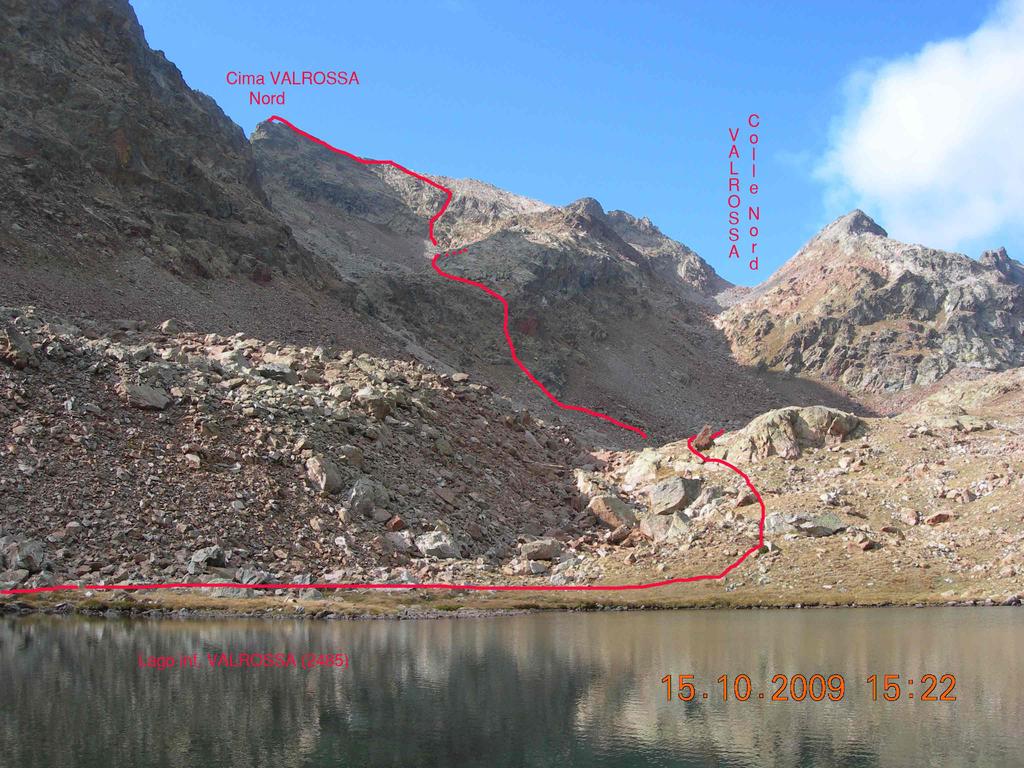Si procede parallelamente al rio fino ai laghi di Valrossa, dai quali, attraverso pietraia, si raggiunge l’evidente colle nord di Valrossa.