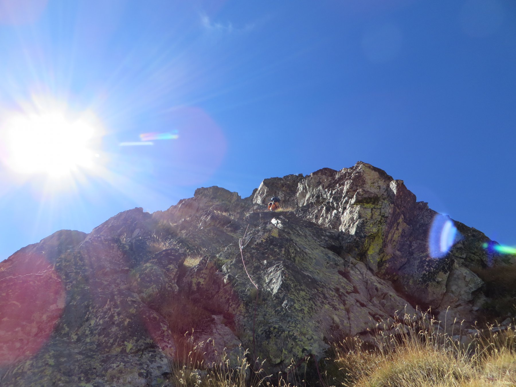Dovendo improvvisare per cambio piano, senza alcuna relazione e ormai in tarda mattinata, ci siamo incamminati in direzione dei Laghi di Valrossa raggiungendo il Colle N nel primo pomeriggio. Seguendo fedelmente la cresta abbiamo superato dapprima un risalto con due tiri (III) per poi raggiungere con facile camminata la Cima N. Siamo poi scesi, con attenzione, in direzione del Colle del Filo di Ferro rimanendo quasi sempre sul filo o spostandoci alcune volte su delle cenge erbose esposte. Dopo qualche saliscendi ci siamo ritrovati all’intaglio principale che divide la Cima N da quella Centrale che avremmo risalito di lì a breve.