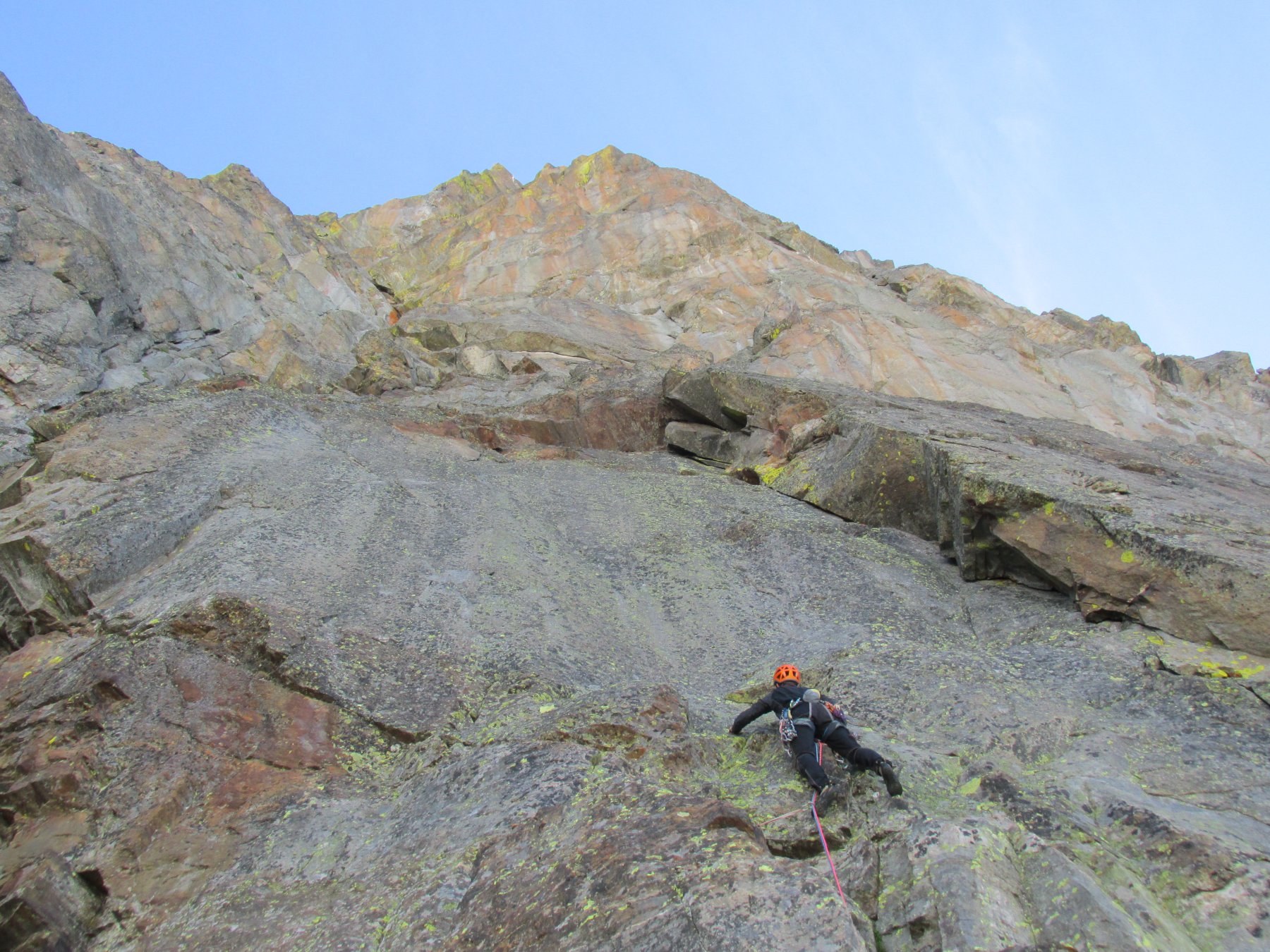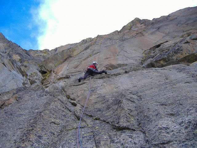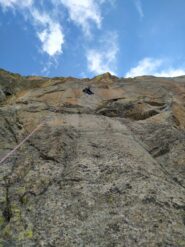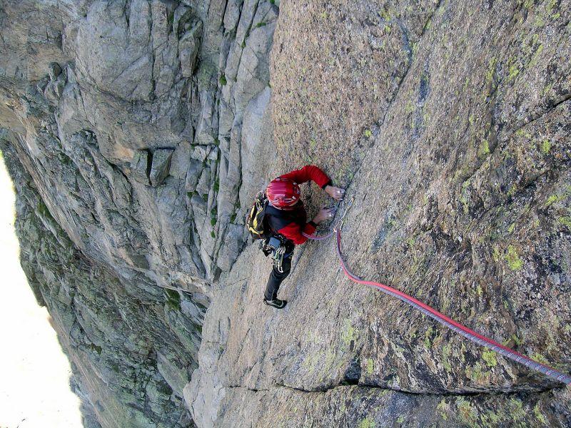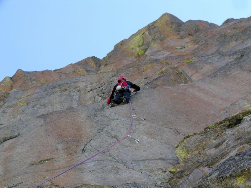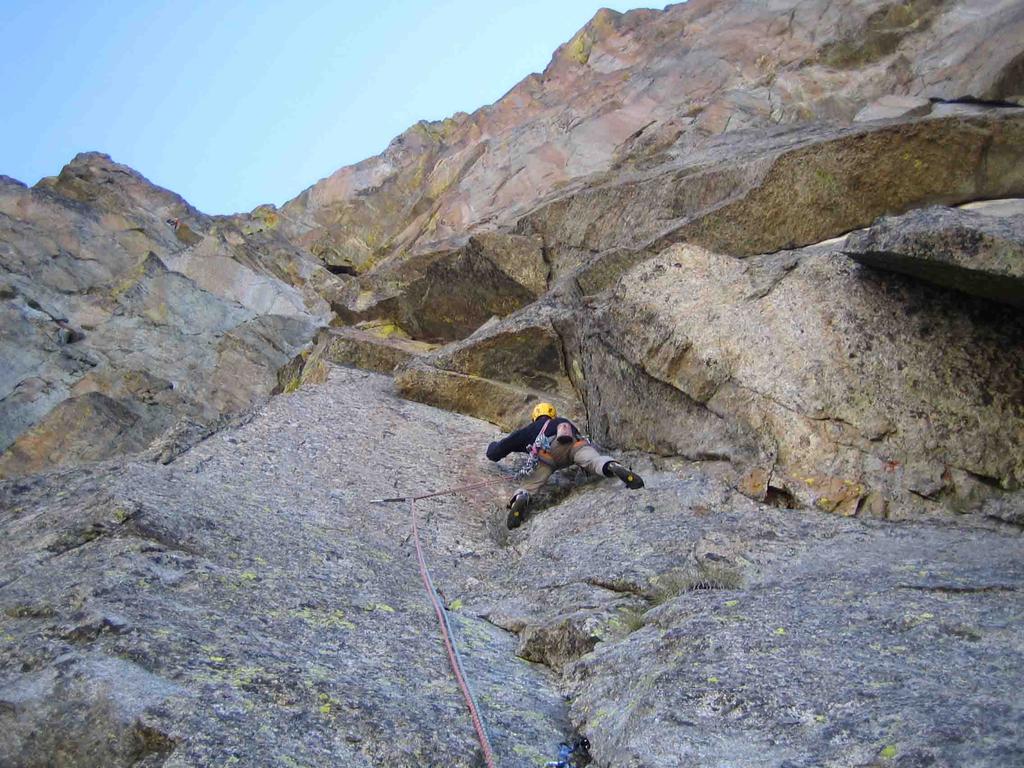 Salire una placca levigata con passo tecnico e difficile (7a+). Il seguito è più facile (6a+) ma poco protetto (friend) S1.