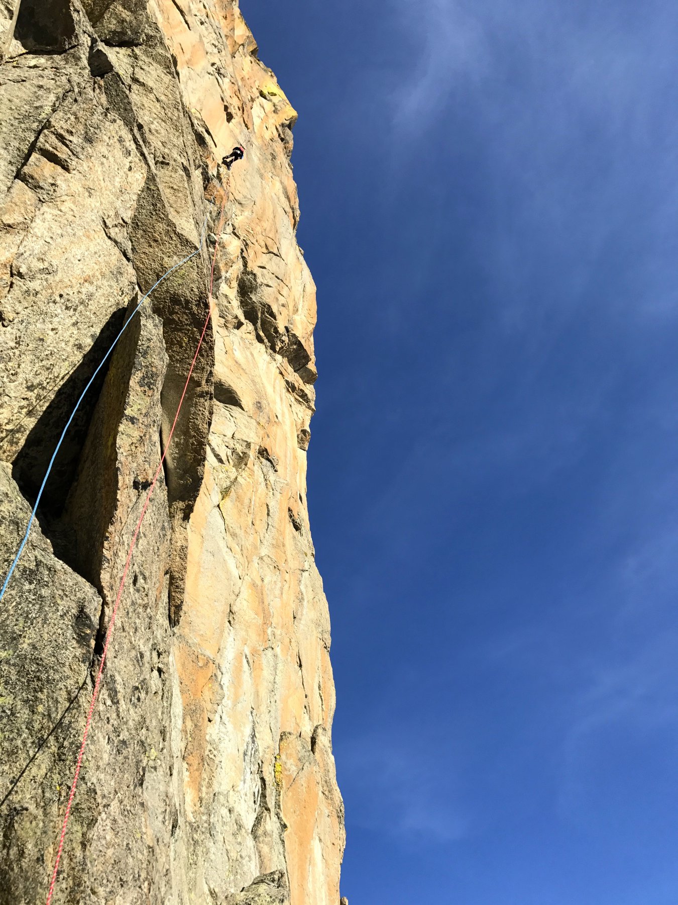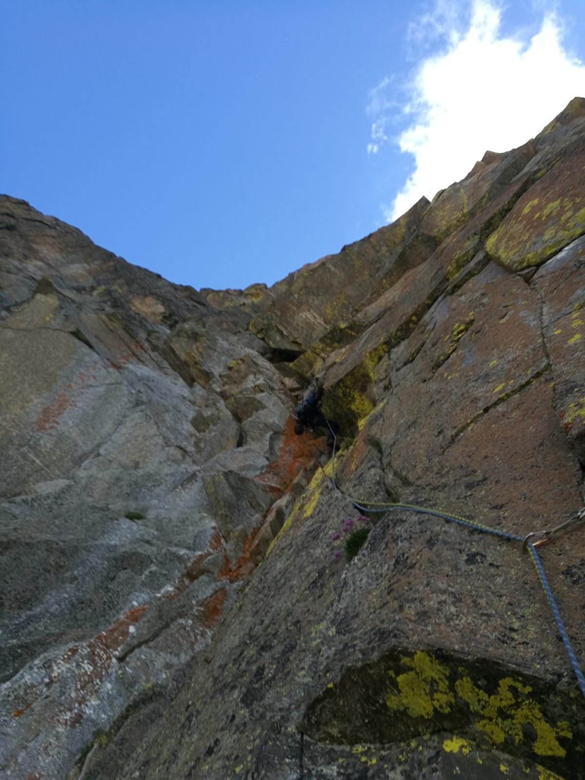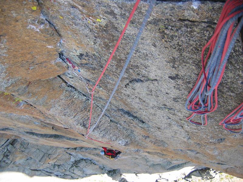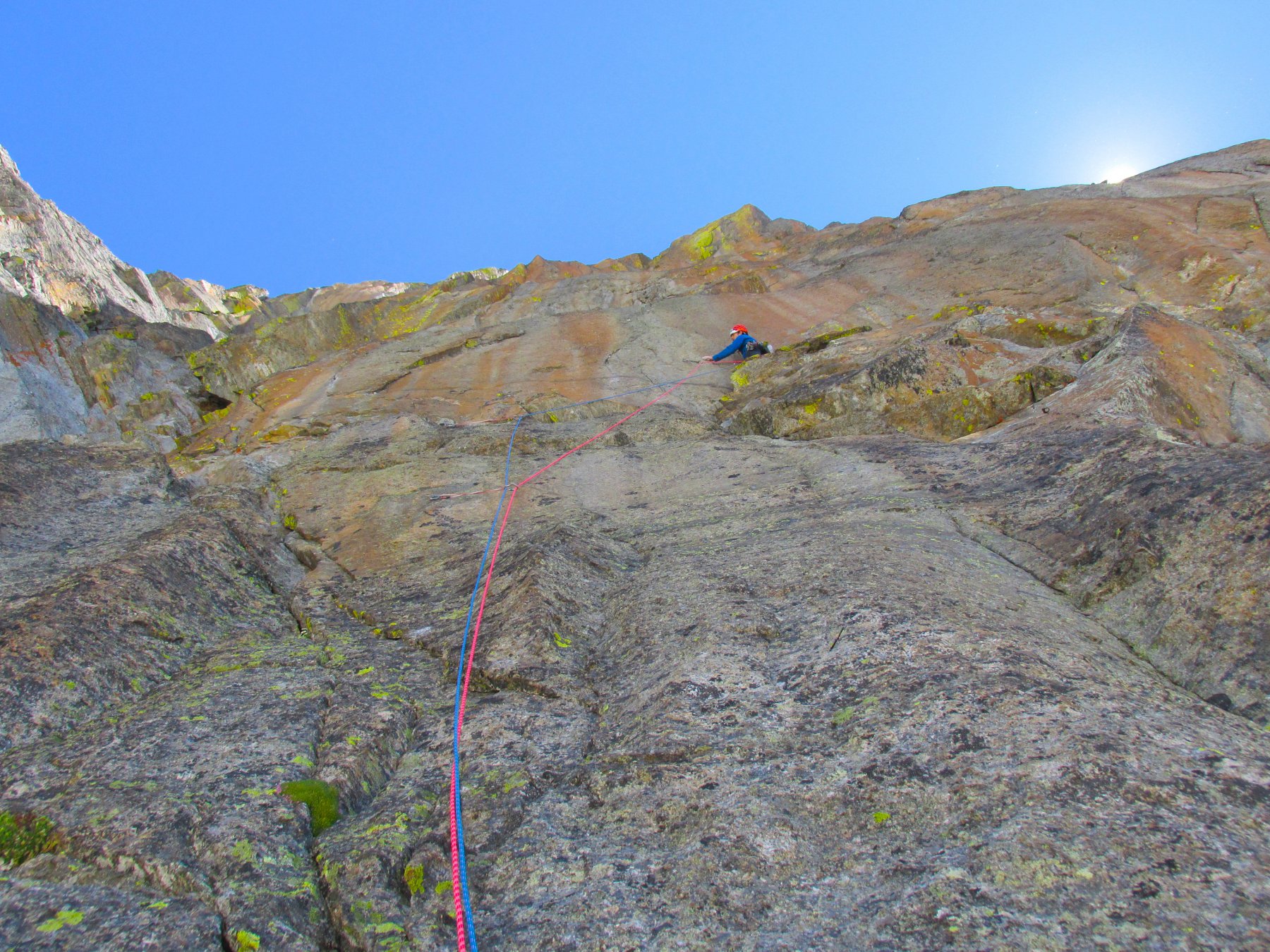 Salire una placca levigata con passo tecnico e difficile (7a+). Il seguito è più facile (6a+) ma poco protetto (friend) S1.