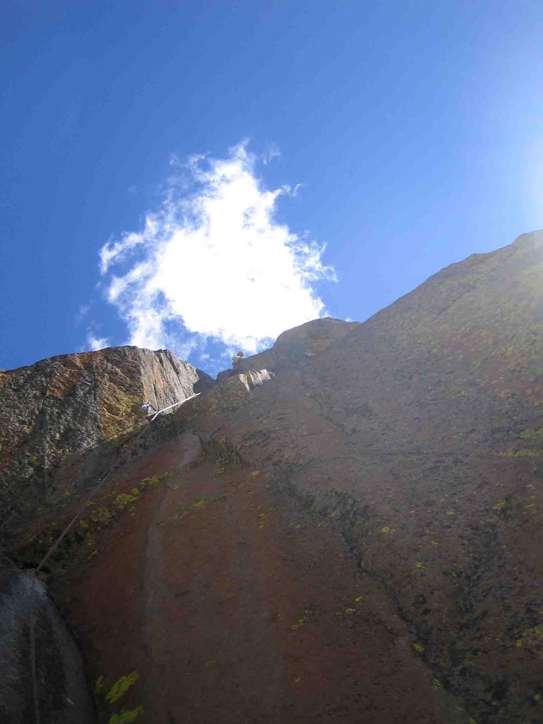 Si sale un diedrino e con difficile traversata a dx, sotto un tetto, si arriva ad una sosta in piena parete (6b+) S2.