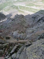 Si raggiunge la base di una fessurina diagonale con impostazione complicata (7a), la fessura e evitabile a dx per un diedro abbattuto.per muretti (6a) si giunge in sosta S7.