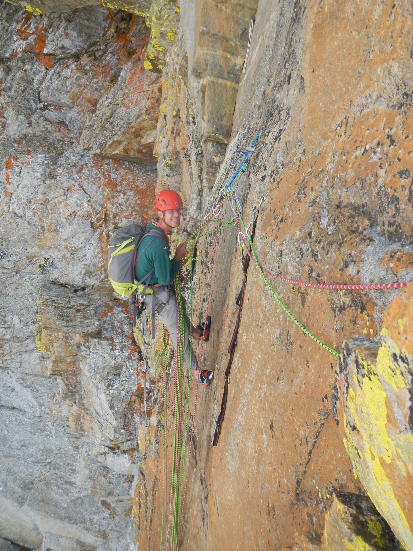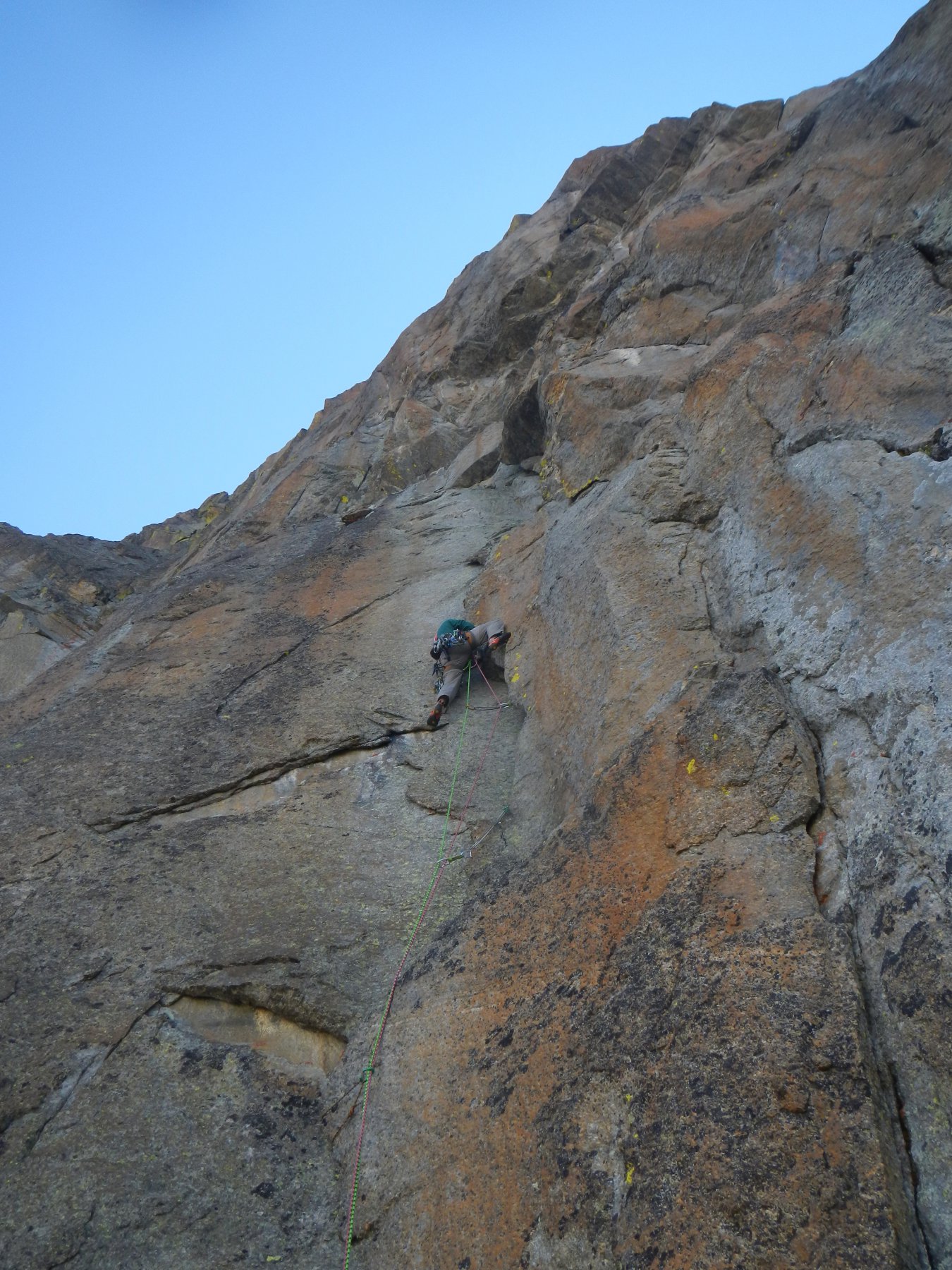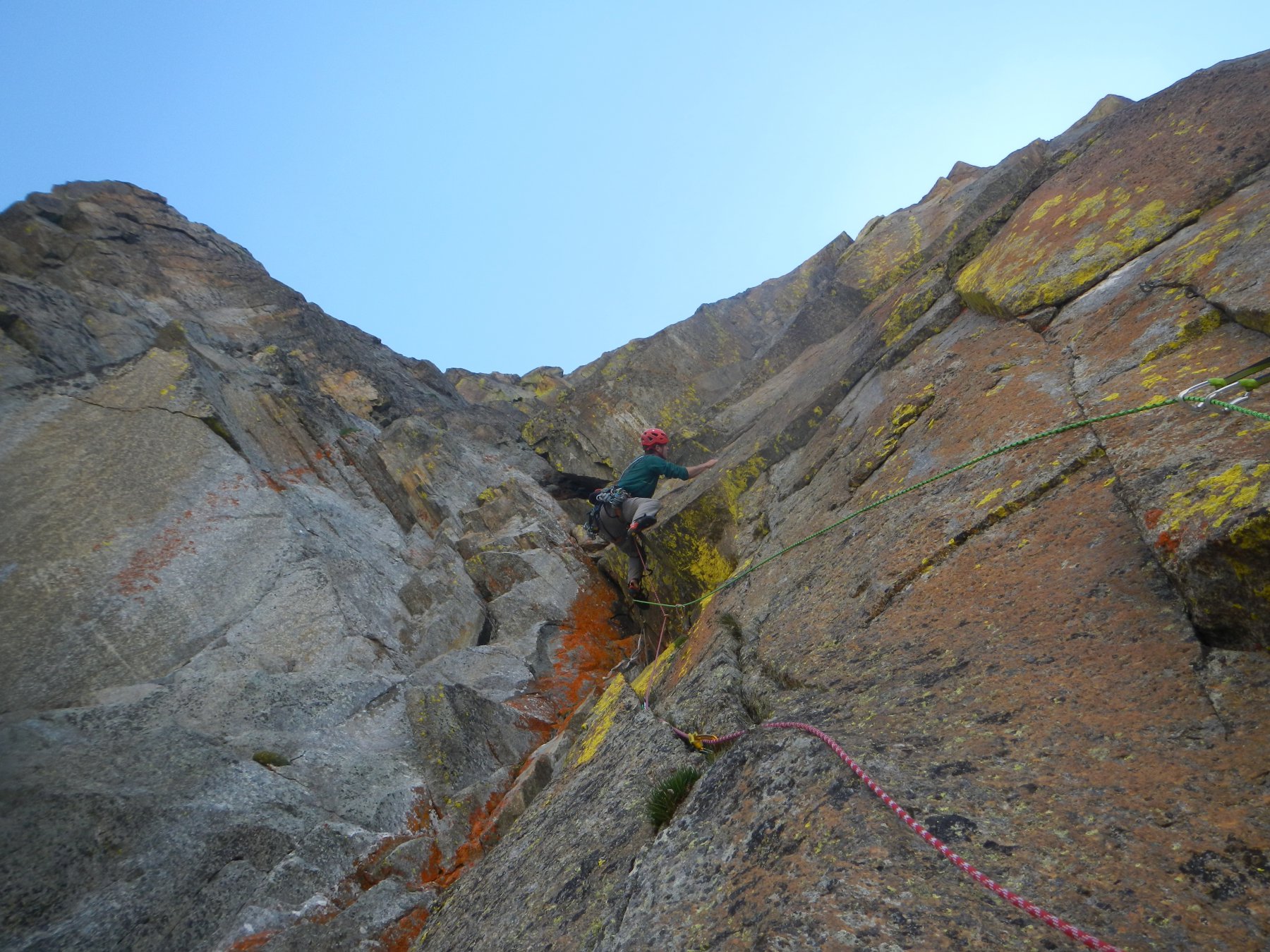 L7 si seguono le protezioni (nut martellati e chiodi mezzi fuori) aggirando lo strapiombo a sx. Salire fino ad un diedro con chiodo giallo.non continuare dritti ma prendere un diedrino a sx.Al suo termine tornare a dx sostando su un chiodo ed un friend incastrato. 30 m 7c o 6a/A1 (originariamente A3, adesso basta tirare con qualche precauzione e magari con una staffetta)