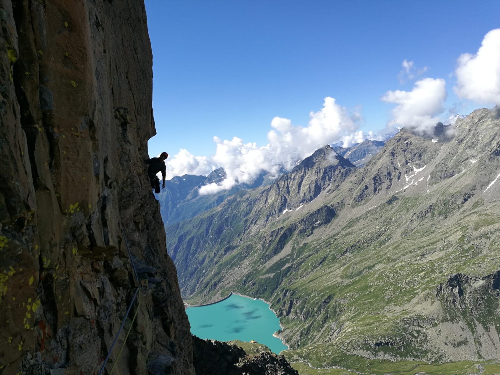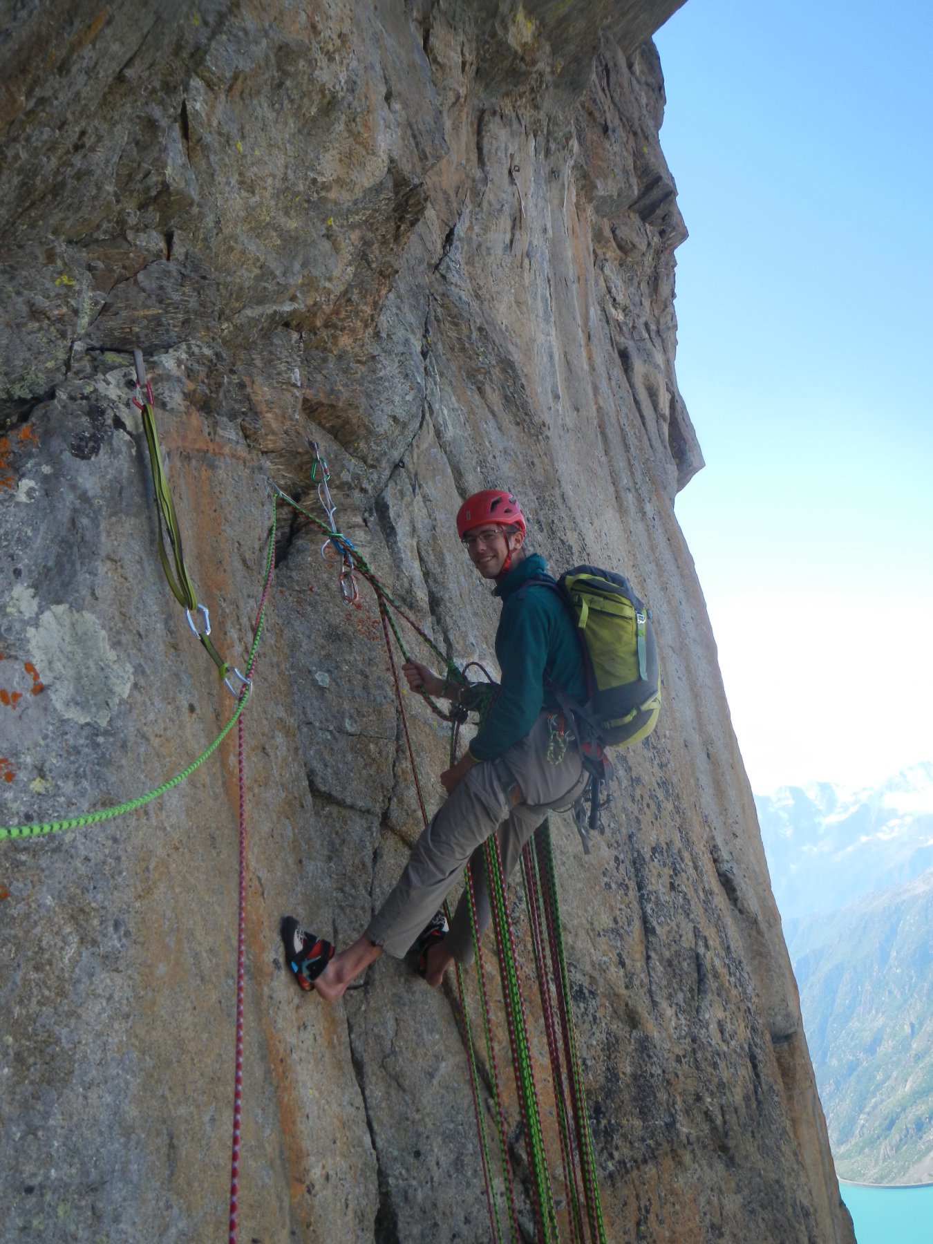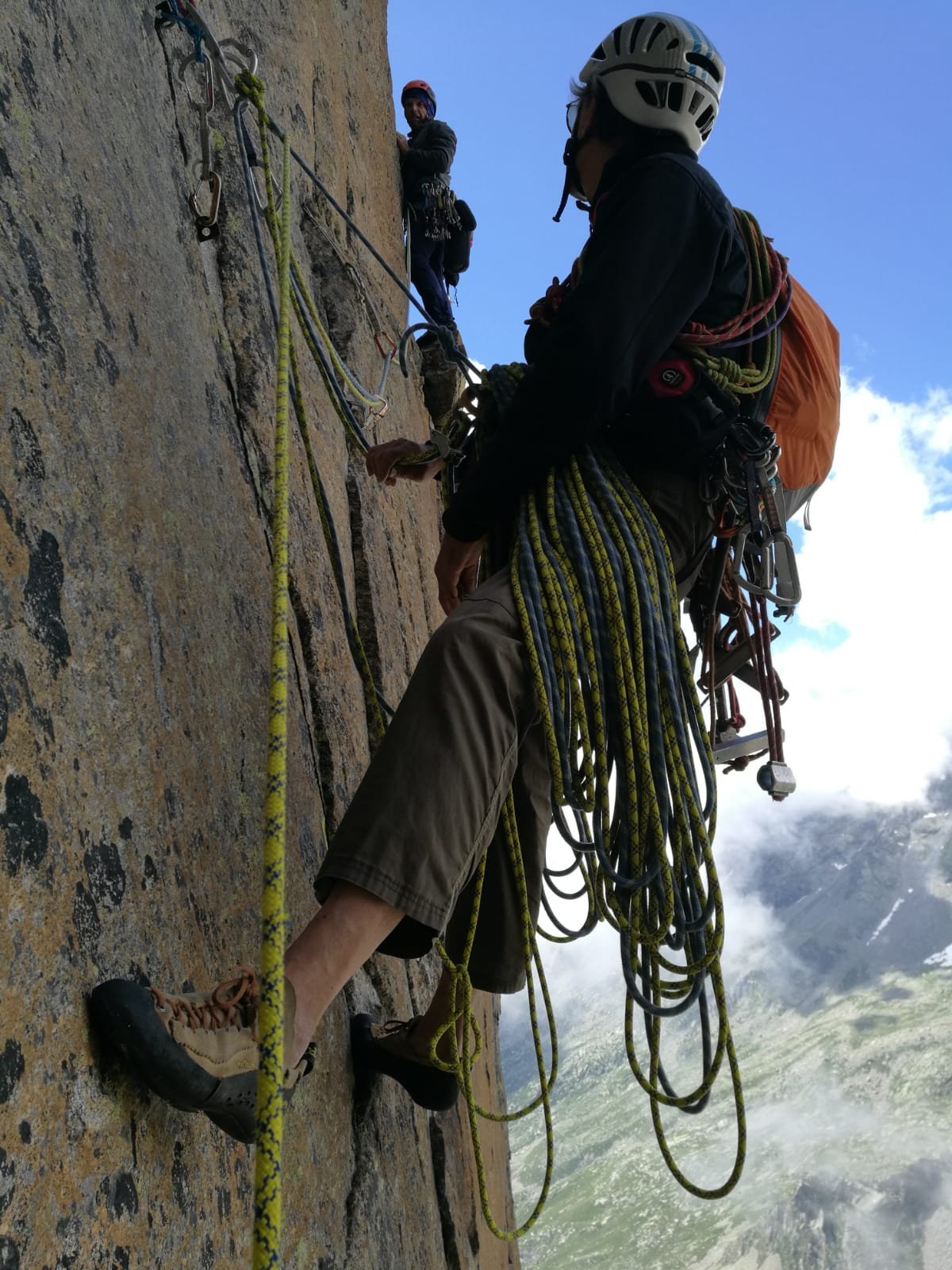 L7 si seguono le protezioni (nut martellati e chiodi mezzi fuori) aggirando lo strapiombo a sx. Salire fino ad un diedro con chiodo giallo.non continuare dritti ma prendere un diedrino a sx.Al suo termine tornare a dx sostando su un chiodo ed un friend incastrato. 30 m 7c o 6a/A1 (originariamente A3, adesso basta tirare con qualche precauzione e magari con una staffetta)