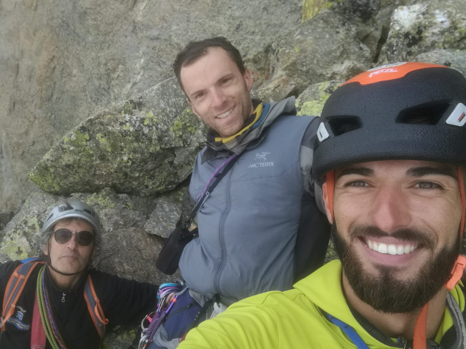 Probabilmente sul terzo tiro avevano aggirato lo spigolo, e la soste precedente era più a sx dell’attuale con spit di chissà che tentativo. Si aggiunge un passaggio non banale, soprattutto per i secondi. Dopo essersi ricongiunti con “nel corso del tempo” Sandro dice che erano passati a sx di quest’ultima, ma anche lui non ricorda perfettamente.