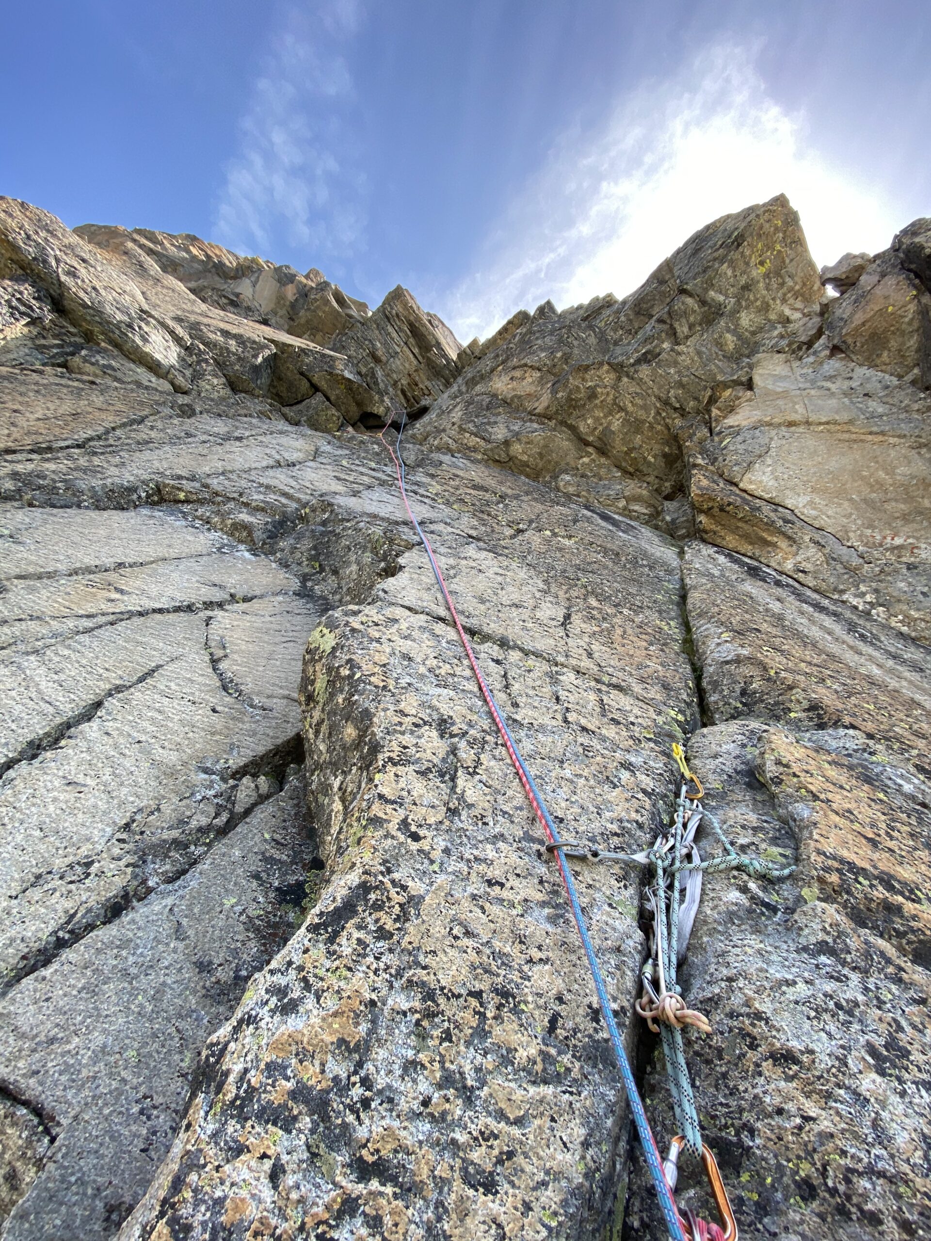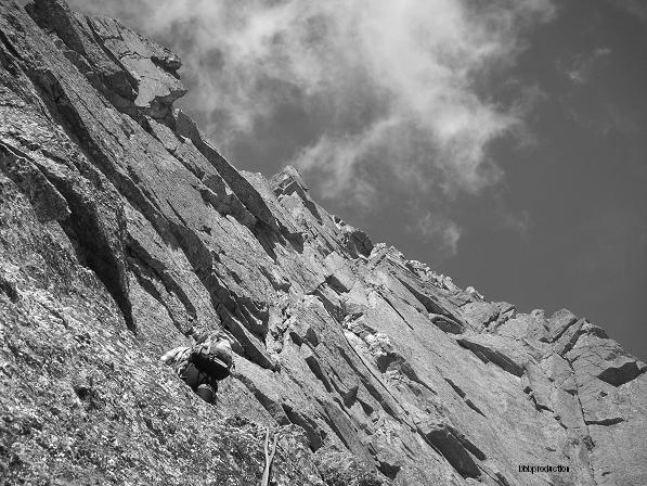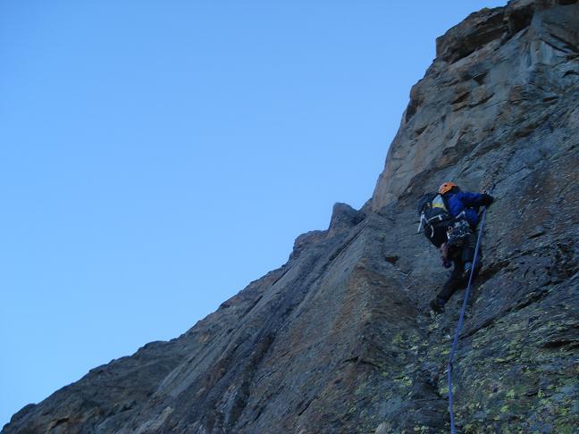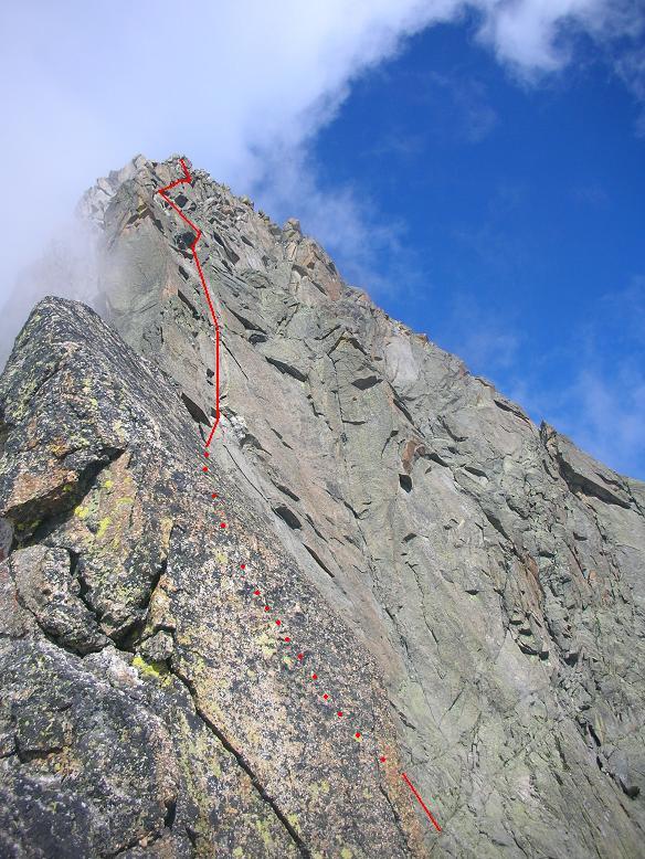 Salire a sin. prendendo una serie di divertenti fessure sul fondo di un diedro-canale e poi obliquare nettamente a sin. raggiungendo prima il filo di spigolo che si doppia e la base di una paretina di quarzo (S16).