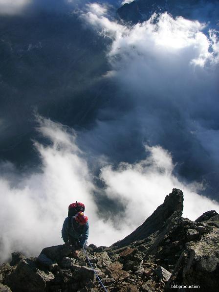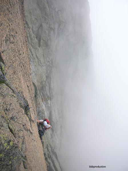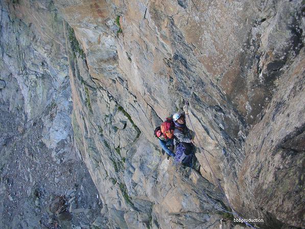 Proseguire verso dx scendendo 1 m, ancora a dx fin sotto la verticale di un dedro strapiombante con spuntoni e lame in forte esposizione. Uscire atleticamente verso dx dove si sosta su uno sperone sospeso sopra i tetti (S4).