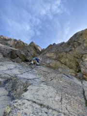 Ancora a dx puntando ad un diedro che inizia da una zona quarzitica chiara con lame instabili e percorrerlo fino a sostare su spuntoni e masso incastrato, tiro lungo (S21).