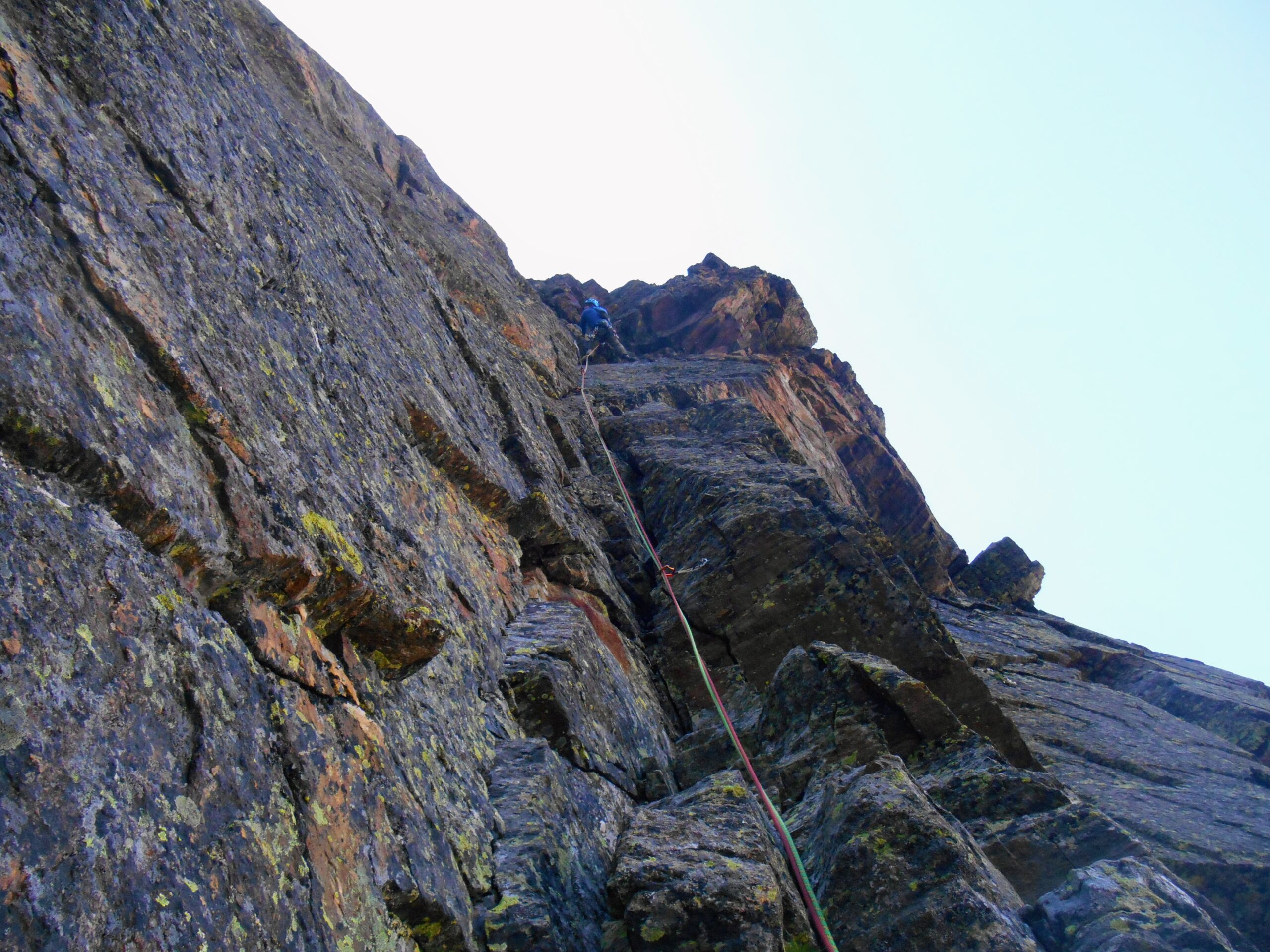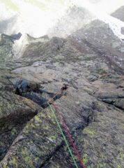Presente ancora un po’ di neve per raggiungere l’attacco della via. Dietro avevamo i ramponi, ma siamo riusciti comunque ad aggirarla con i soli scarponi e a cambiarci sulla cengia a destra dello spit con cordino (non più rosso, sbiadito quasi bianco). Le condizioni dell’accesso ricordano quelle della foto di “mcrain” del 18/07/2016.
