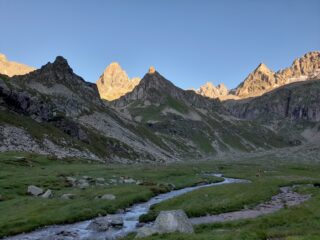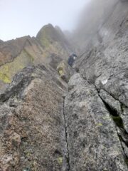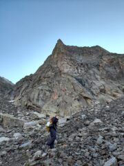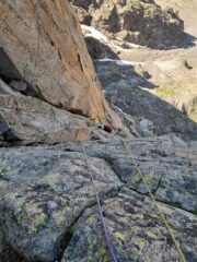Vallata incantevole… essere accolti dal Becco della Tribolazione che si illumina colpito dai raggi dell’alba ti riconcilia col mondo. Poi arrivi sotto il Valsoera, decisamente più cupo al mattino, e cominci a concentrarti sull’ascesa. Piacevoli già i primi tiri, dal 5° in poi cambiano marcia e regalano anche una grande esposizione. L’uscita del 5° e l’inizio del 7° in punti più duri, anche se protetti discretamente. Roccia ottima. Qualche tiro bagnato (ha piovuto qualche ora la notte). Trovata la linea molto logica anche se io seguivo le lepri della prima cordata (Ivan e Ska) ed è stato più facile. Fatta tutta da primo in libera (ad eccezione del tiro di A0 naturalmente)… via decisamente impegnativa e di soddisfazione. Tocca avere margine sul grado: talvolta devi proteggerti in posizioni non troppo comode vista la continuità di alcuni tiri. Utilizzato a pieno una serie di friends dal 0.3 al 3 (non serve doppiare le misure) e qualche nut (molto utile). Calate lungo “Nel corso del tempo” hanno il pregio di avere un infimo rischio di incastri, ma presentano almeno un paio di soste scabrose; i soci, che mi hanno guidato fino a terra, hanno rinforzato. Oltre a noi 4 altre due cordate sulla via, altre due hanno desistito all’attacco visto l’affollamento. Con Ivan e Ska a guidare e legato con fre che è venuto su proprio bene, non era scontato