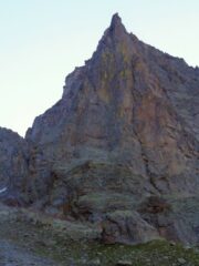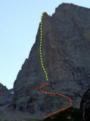 Prima volta in questa valle che presenta un ambiente straordinario, soprattutto per gli amanti dell’arrampicata su roccia. L’avvicinamento richiede circa 1h30′ e c’è un cenno di sentiero nell’ultimo tratto della pietraia, sullo zoccolo finale il percorso è segnalato da piccoli ometti. La via richiede un’arrampicata fisica, più che altro su diedri, generalmente ben appigliati. La via è molto evidente, anche perchè si trovano diversi chiodi datati, molti dei quali di dubbia tenuta… ma è però ben proteggibile con friends (1 set dal 0,4 al 3 -C4 BD è sufficiente) e soprattutto con fettucce (in particolare nel penultimo tiro dove si trovano blocchi incastrati e spuntoni).