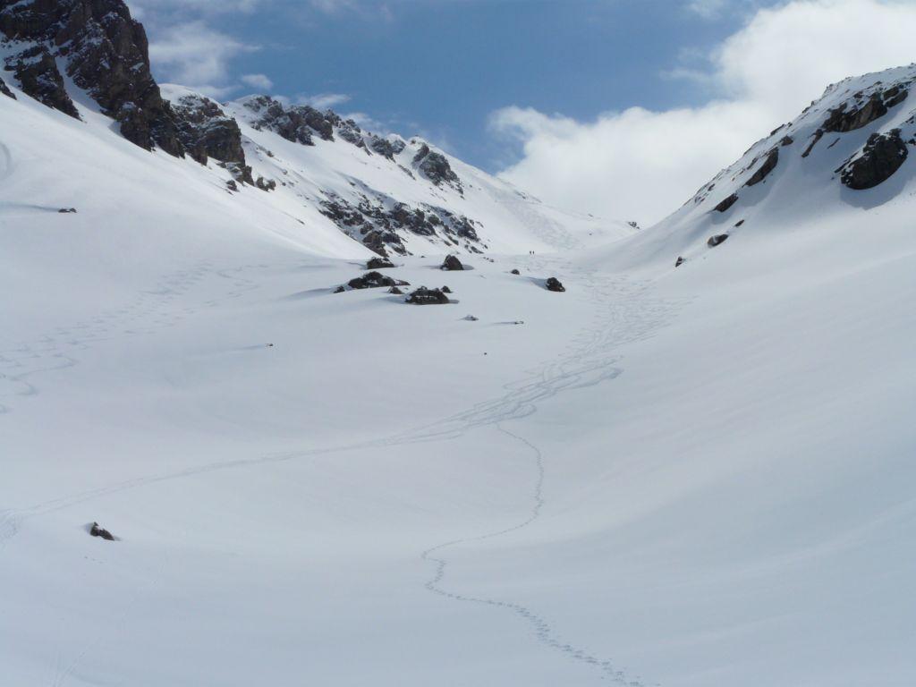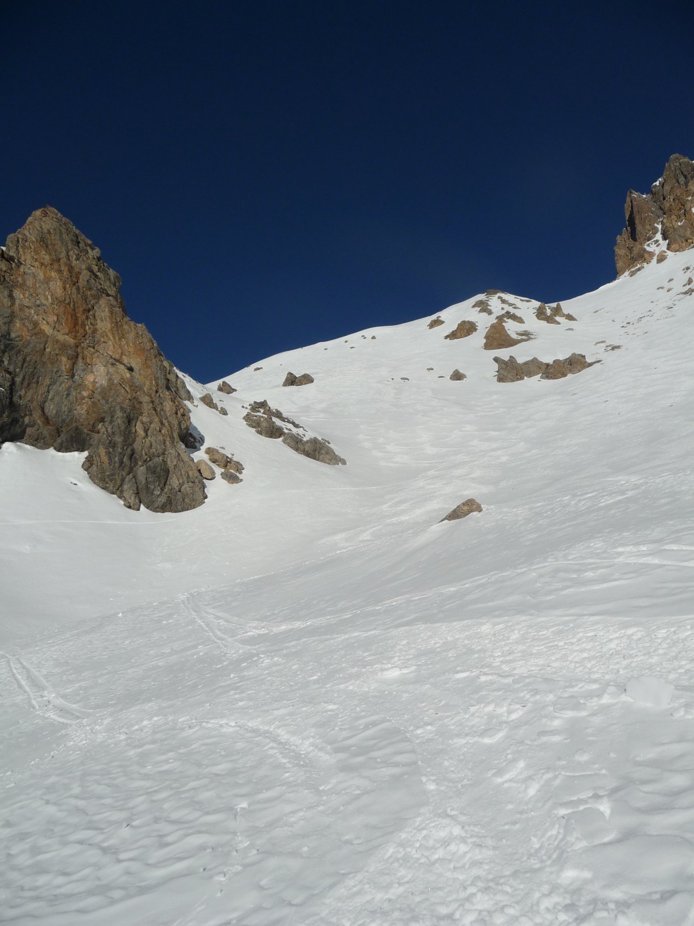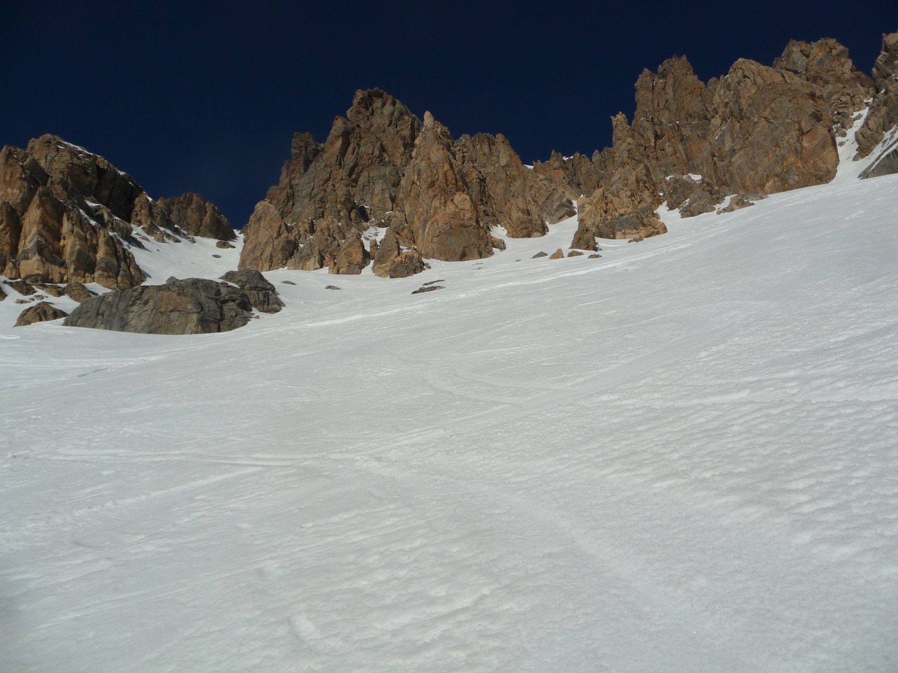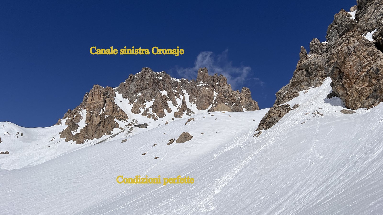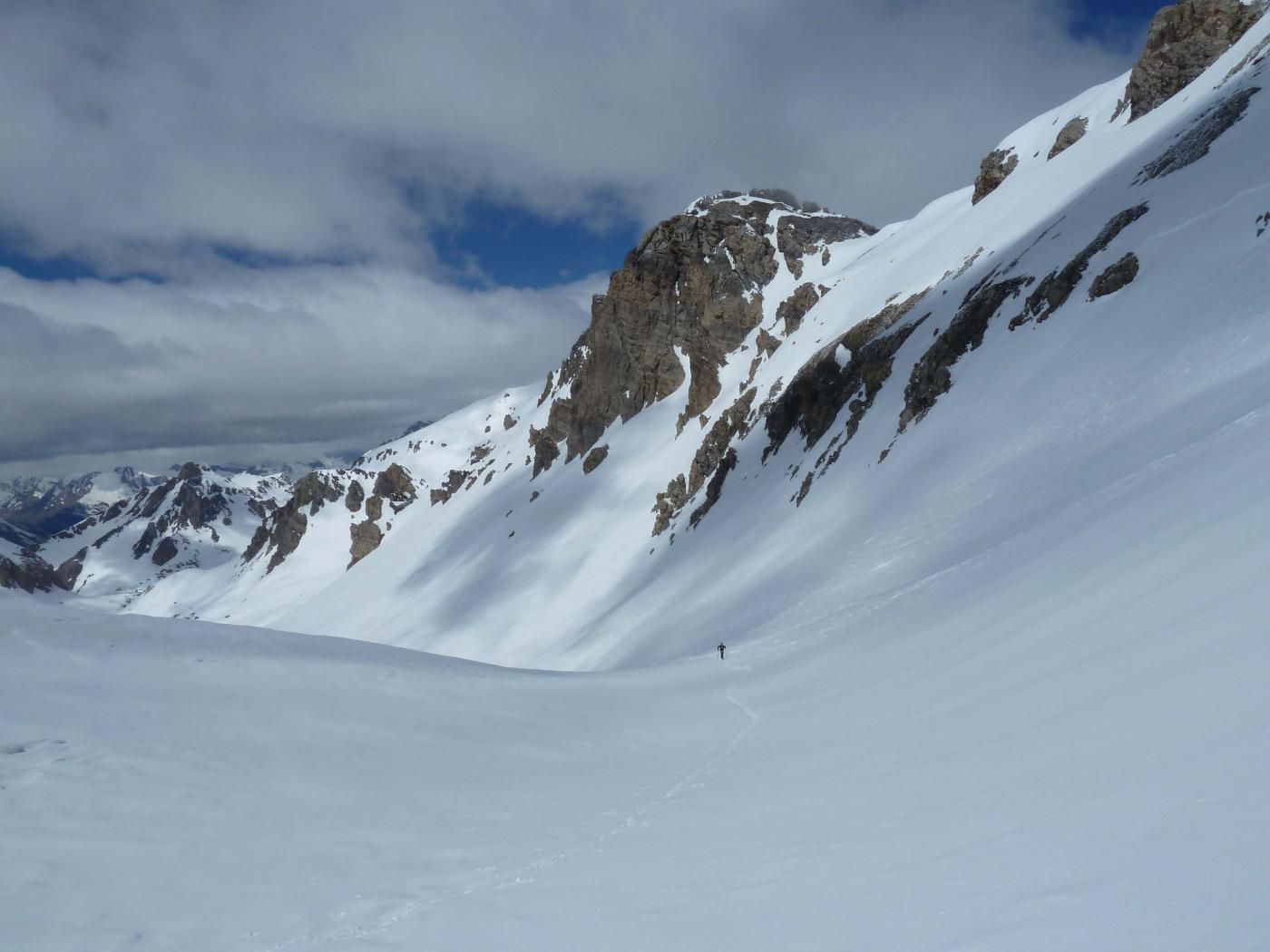 Dal Pontet 1948 m. si segue il Vallone de l’Oronaye lungo la sponda destra orografica sino alla q di 2500m c.a. dove si apre in un ampio anfiteatro (in alternativa ma con neve assestata e sicura si può risalire dal Colle della Maddalena 2000m. il medesimo vallone sulla sinistra orografica facendo attenzione a non innalzarsi troppo sui ripidi pendii per congiungersi con il primo itinerario a q. 2300m. c.a.)