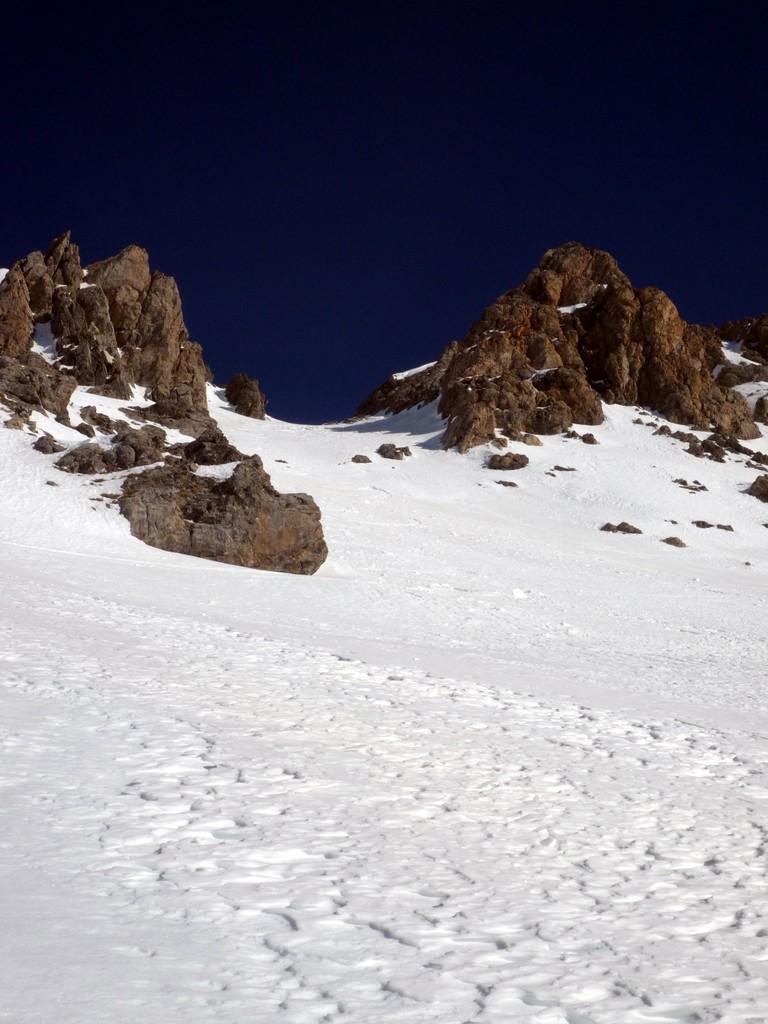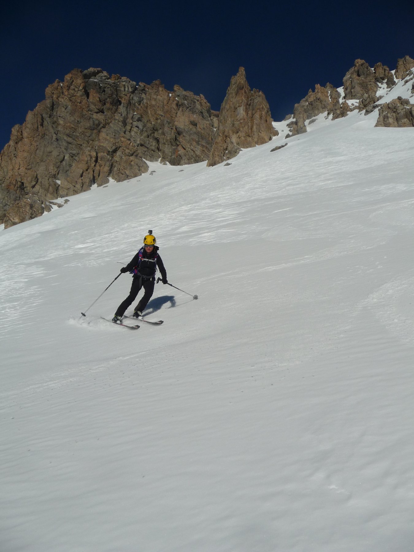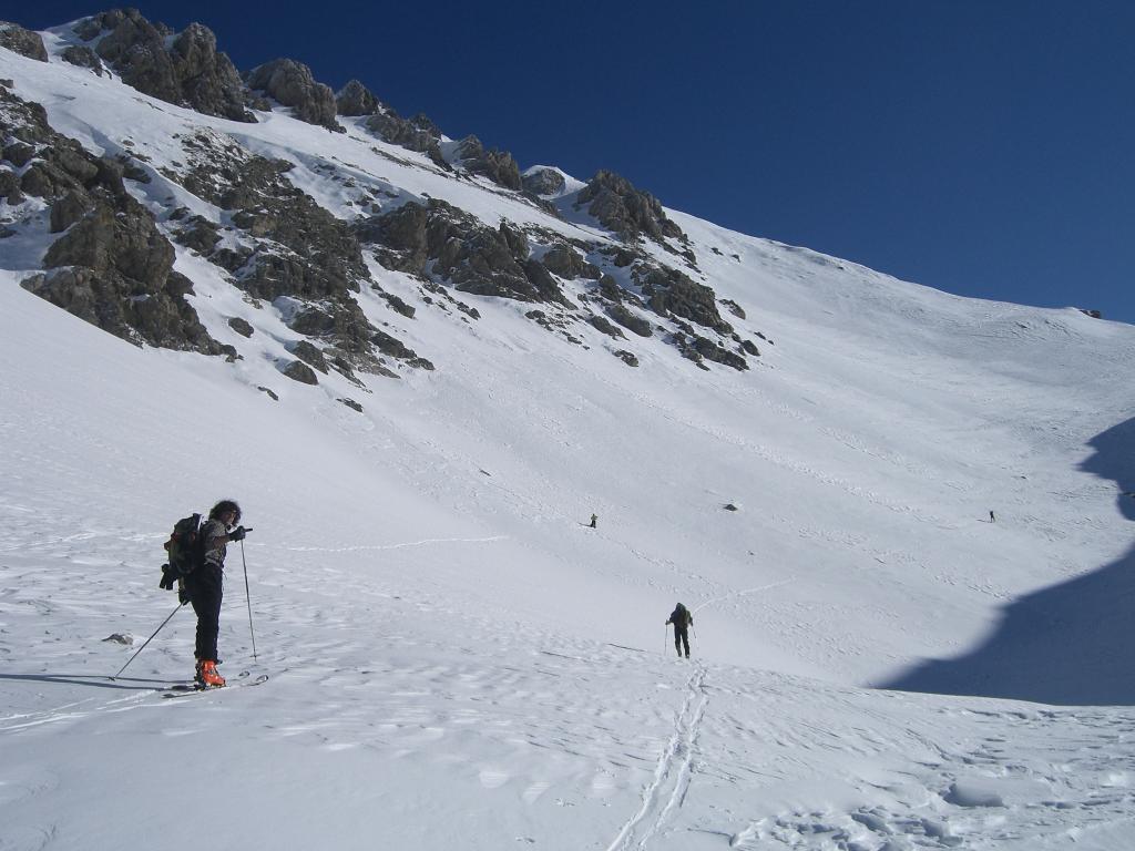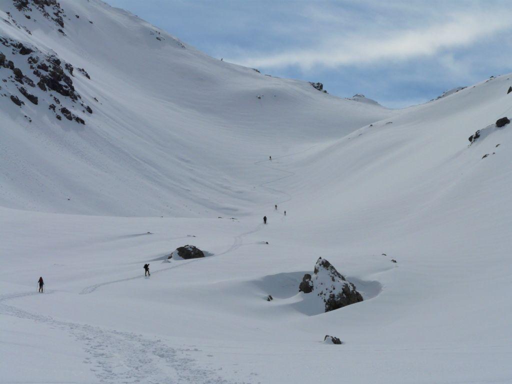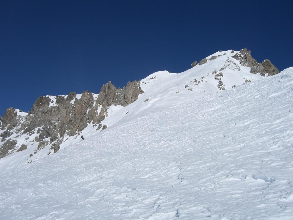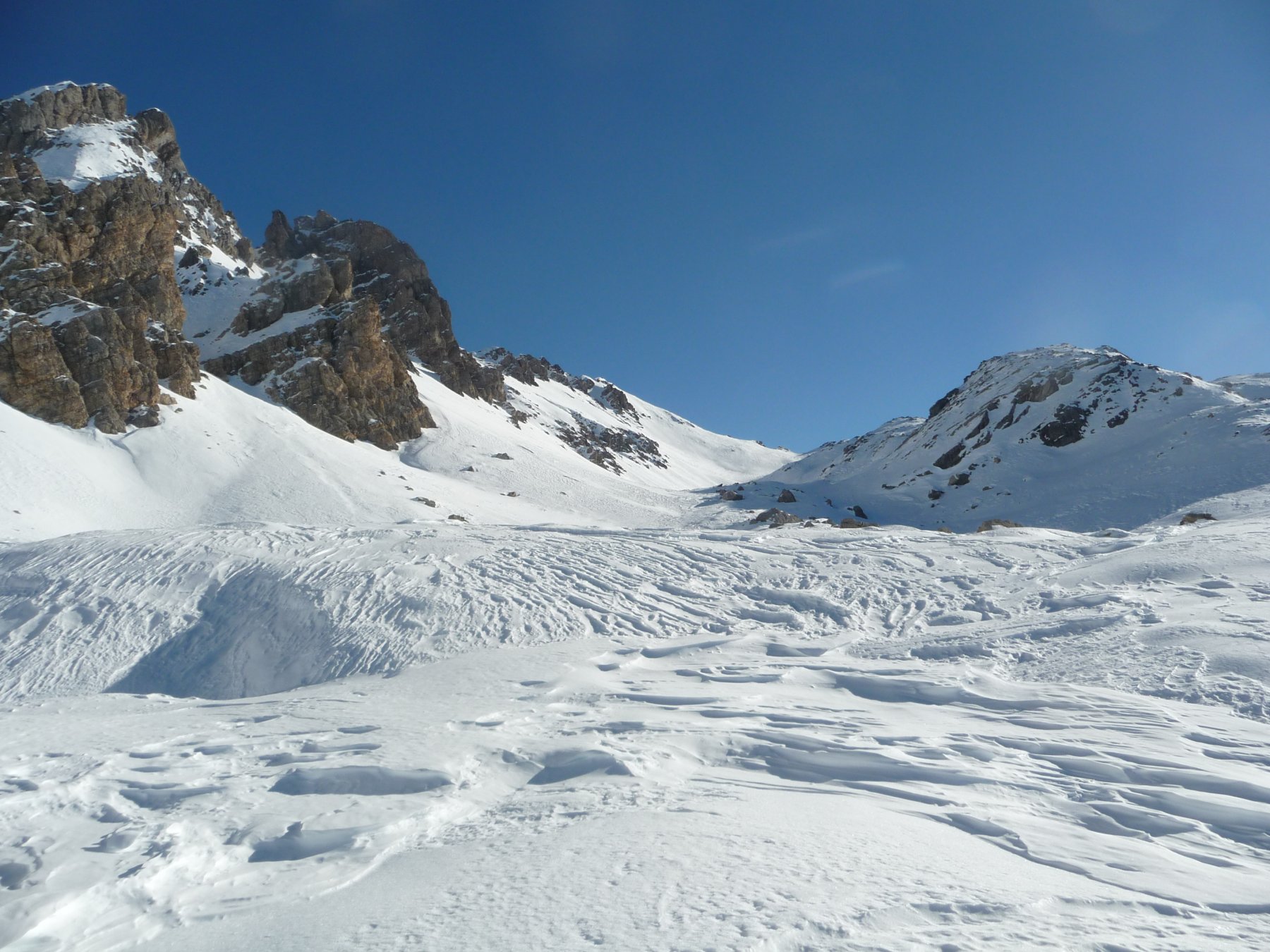 Dal Pontet 1948 m. si segue il Vallone de l’Oronaye lungo la sponda destra orografica sino alla q di 2500m c.a. dove si apre in un ampio anfiteatro (in alternativa ma con neve assestata e sicura si può risalire dal Colle della Maddalena 2000m. il medesimo vallone sulla sinistra orografica facendo attenzione a non innalzarsi troppo sui ripidi pendii per congiungersi con il primo itinerario a q. 2300m. c.a.)