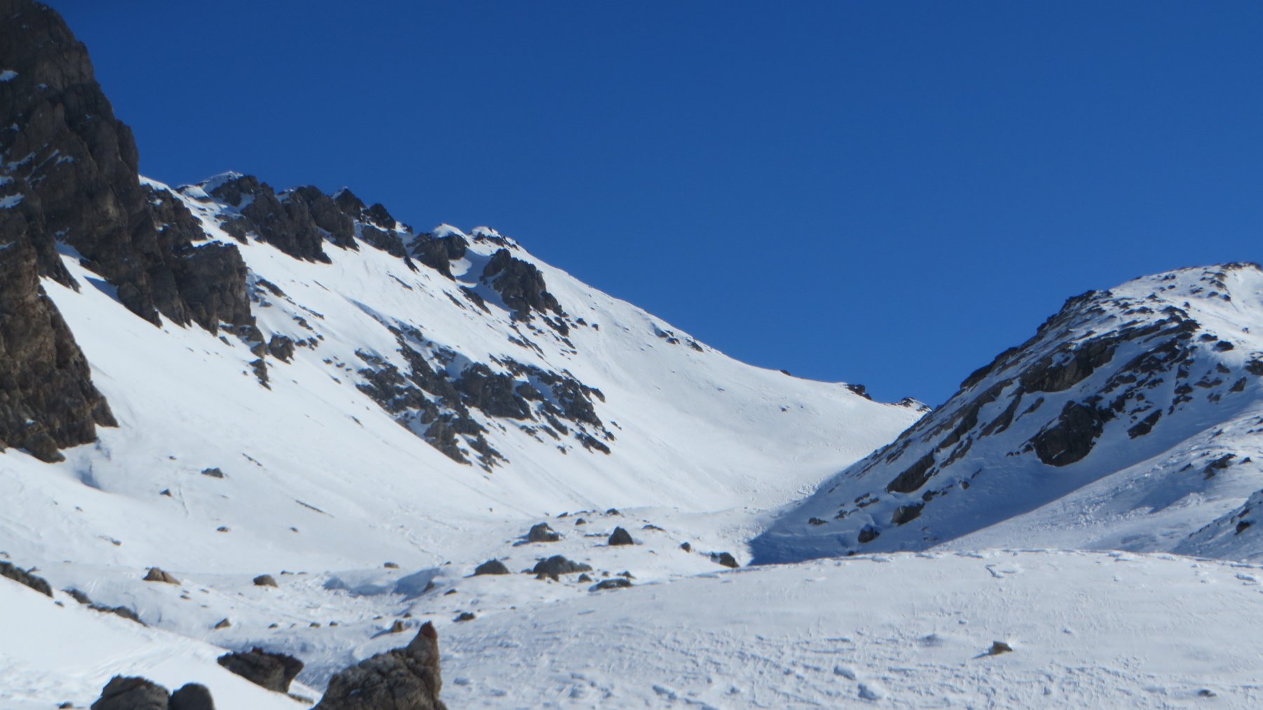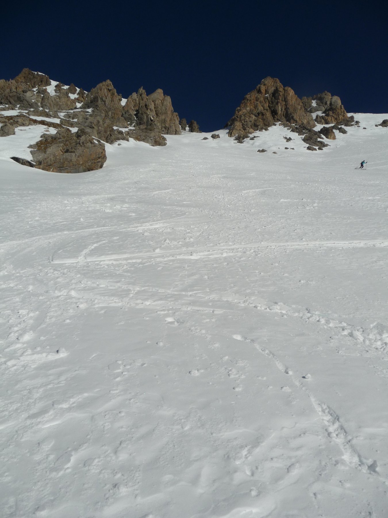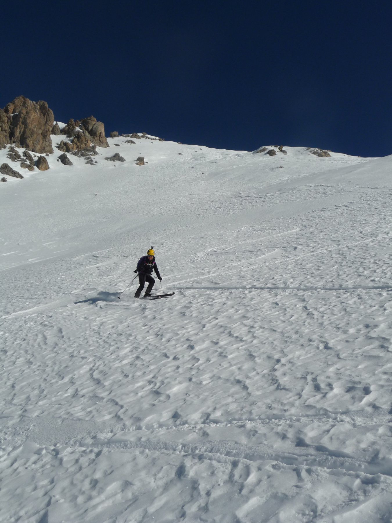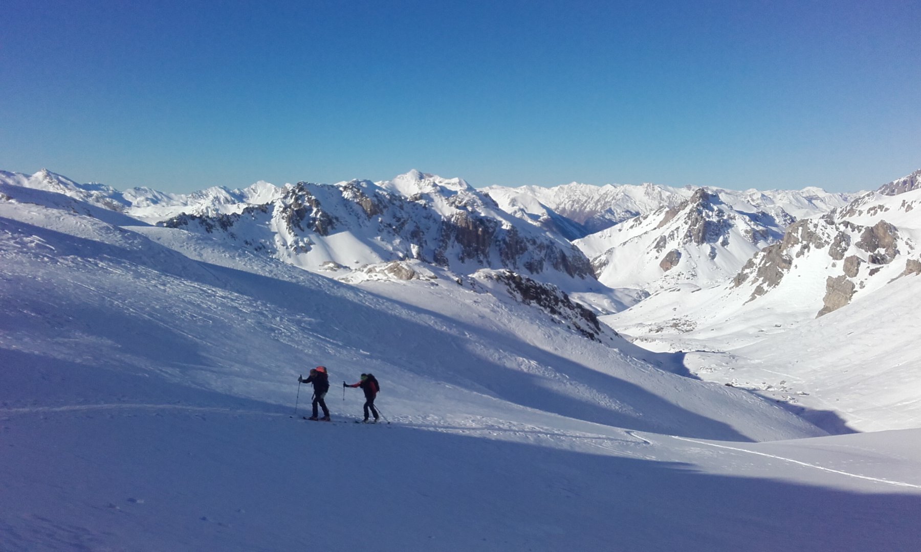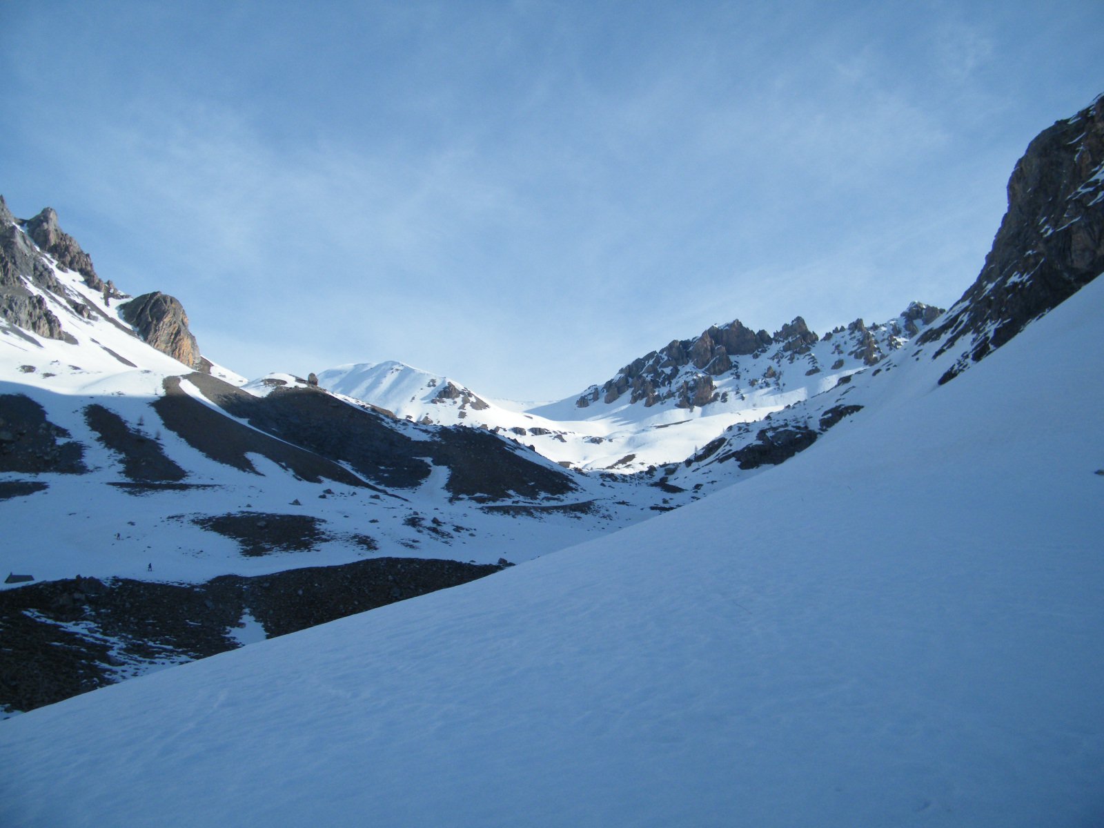 Dal Pontet 1948 m. si segue il Vallone de l’Oronaye lungo la sponda destra orografica sino alla q di 2500m c.a. dove si apre in un ampio anfiteatro (in alternativa ma con neve assestata e sicura si può risalire dal Colle della Maddalena 2000m. il medesimo vallone sulla sinistra orografica facendo attenzione a non innalzarsi troppo sui ripidi pendii per congiungersi con il primo itinerario a q. 2300m. c.a.)