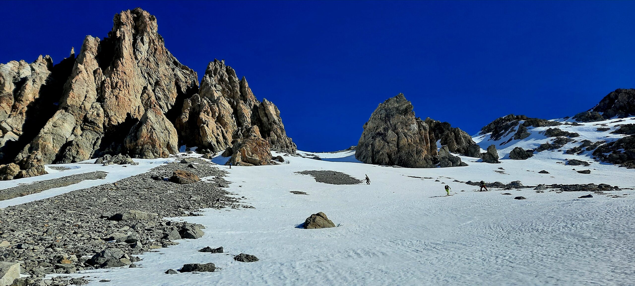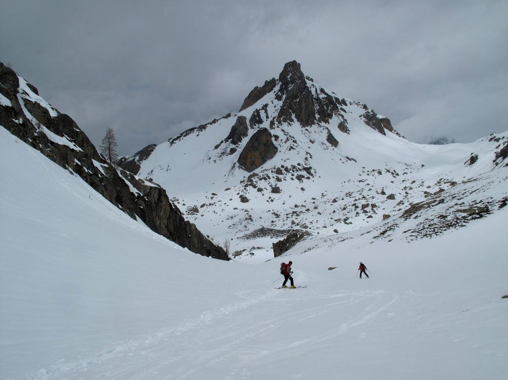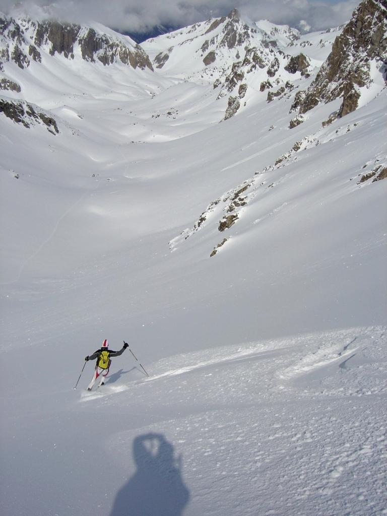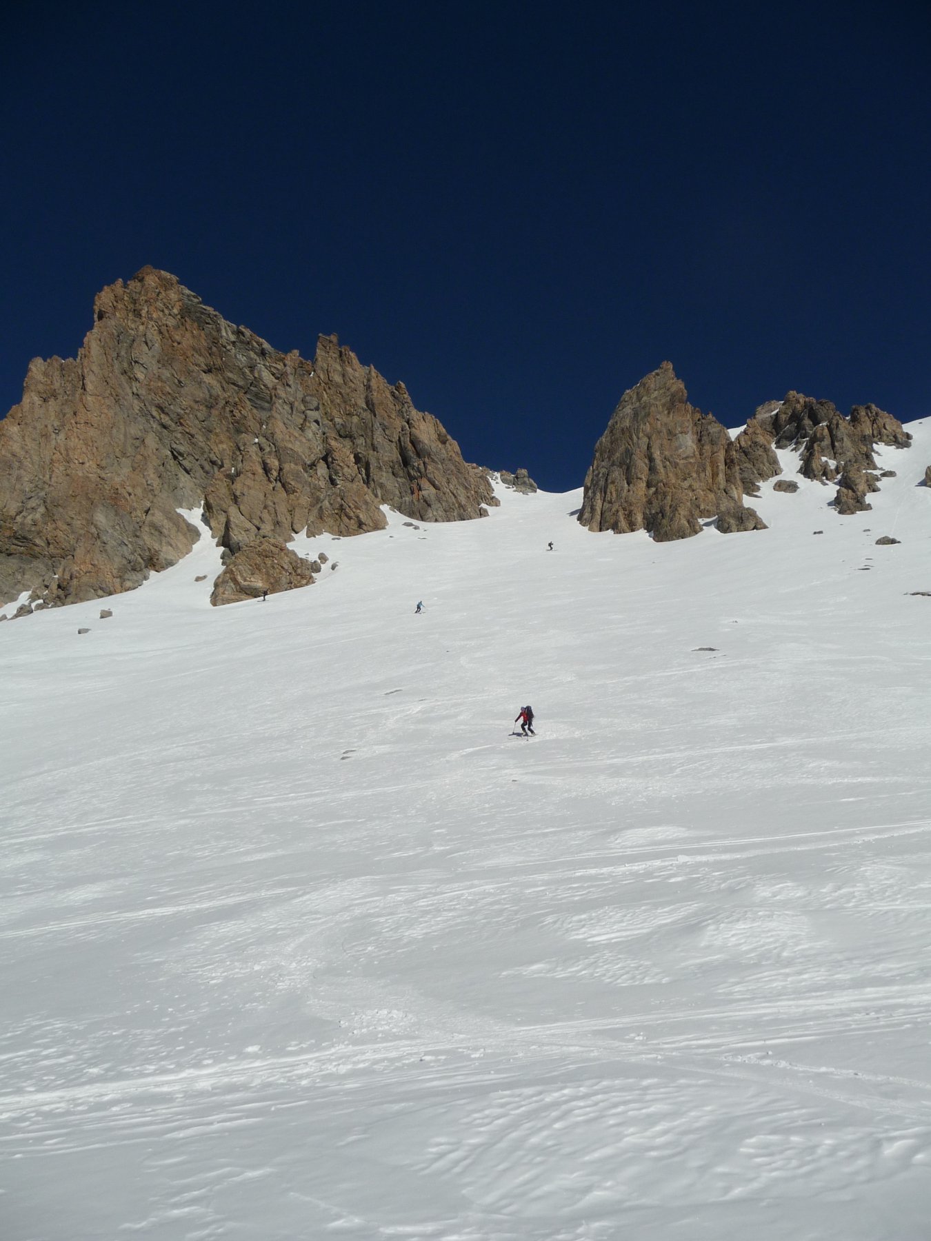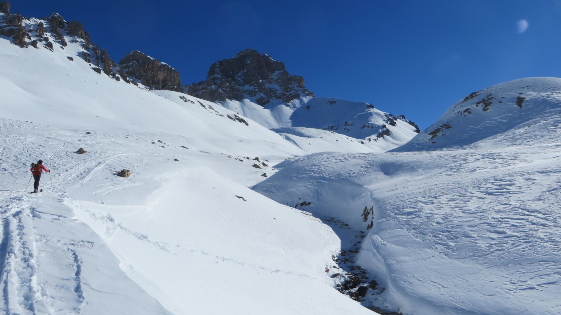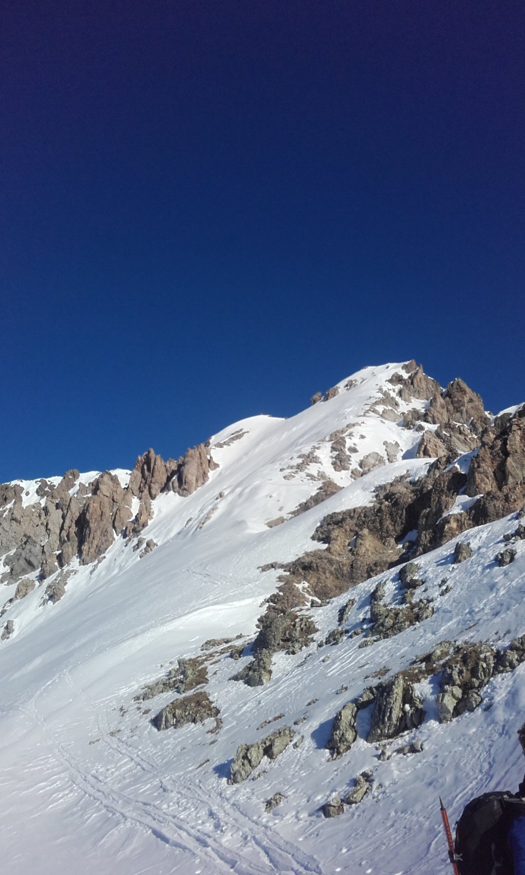 Dal Pontet 1948 m. si segue il Vallone de l’Oronaye lungo la sponda destra orografica sino alla q di 2500m c.a. dove si apre in un ampio anfiteatro (in alternativa ma con neve assestata e sicura si può risalire dal Colle della Maddalena 2000m. il medesimo vallone sulla sinistra orografica facendo attenzione a non innalzarsi troppo sui ripidi pendii per congiungersi con il primo itinerario a q. 2300m. c.a.)