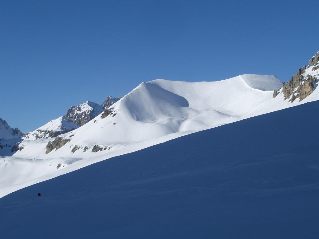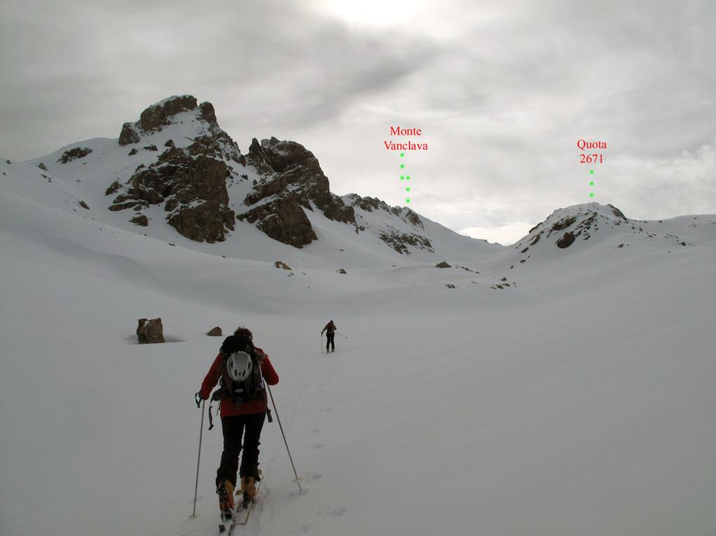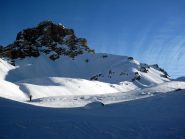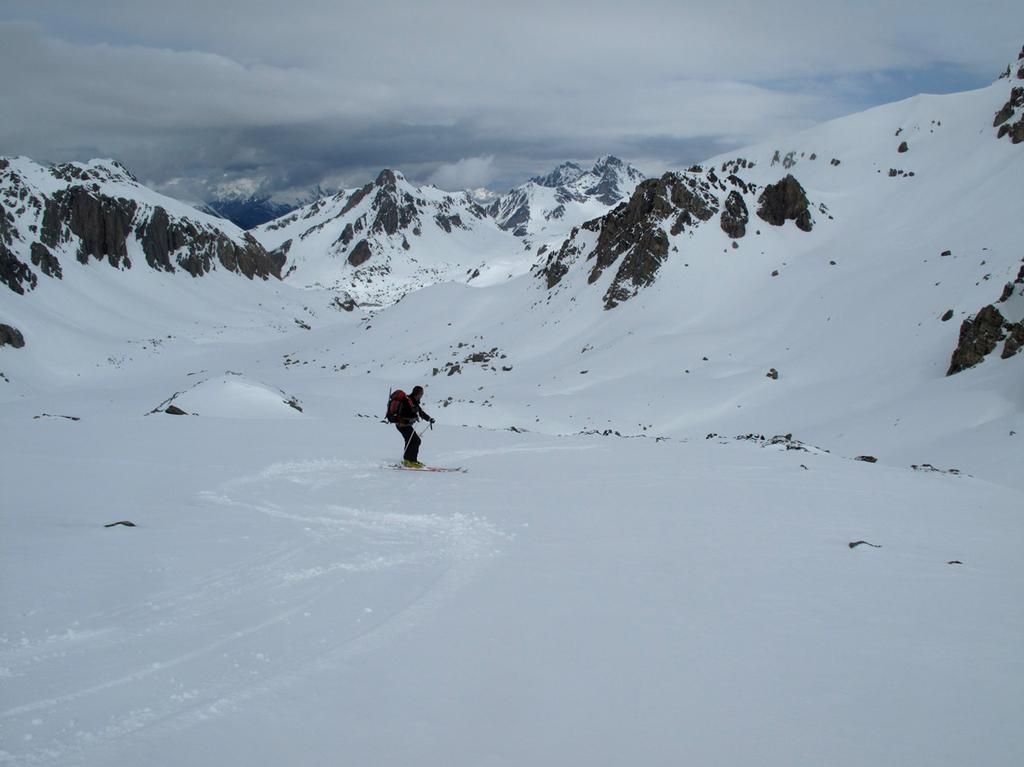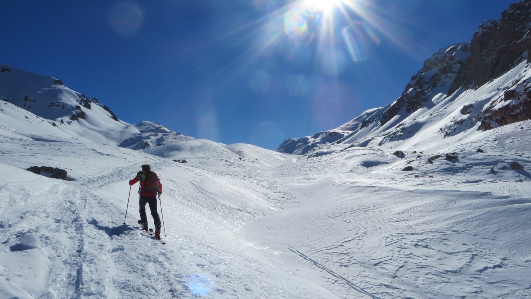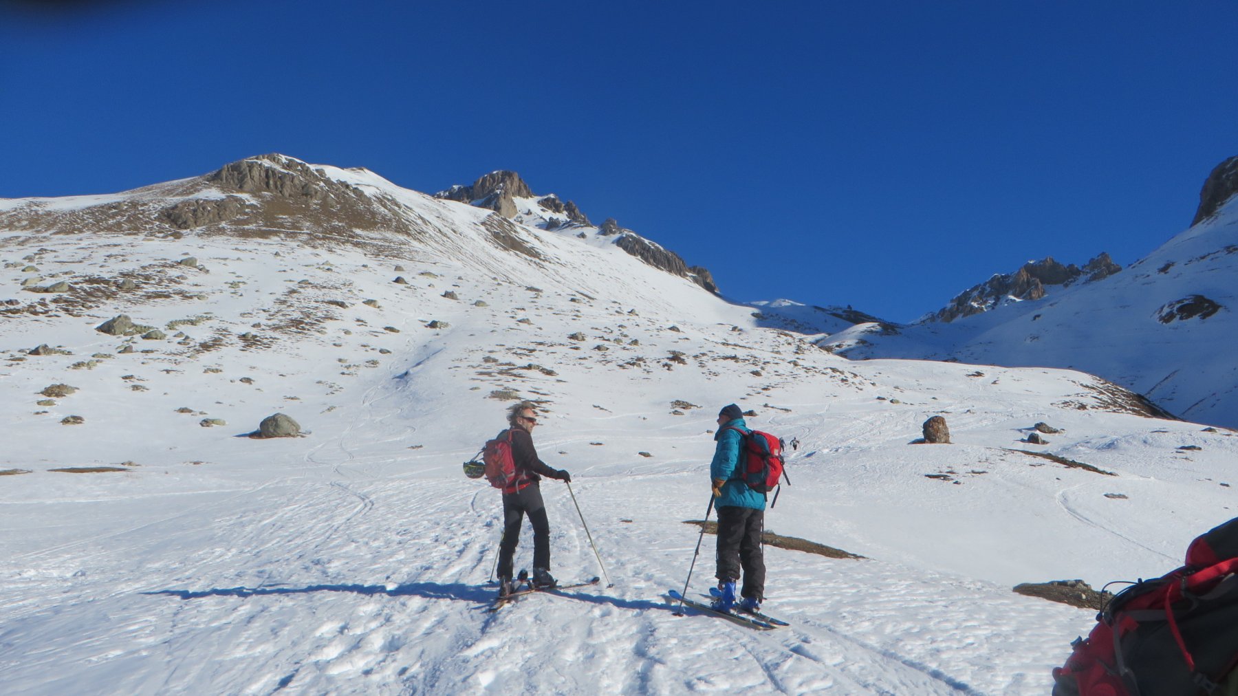 Dal Pontet 1948 m. si segue il Vallone de l’Oronaye lungo la sponda destra orografica sino alla q di 2500m c.a. dove si apre in un ampio anfiteatro (in alternativa ma con neve assestata e sicura si può risalire dal Colle della Maddalena 2000m. il medesimo vallone sulla sinistra orografica facendo attenzione a non innalzarsi troppo sui ripidi pendii per congiungersi con il primo itinerario a q. 2300m. c.a.)