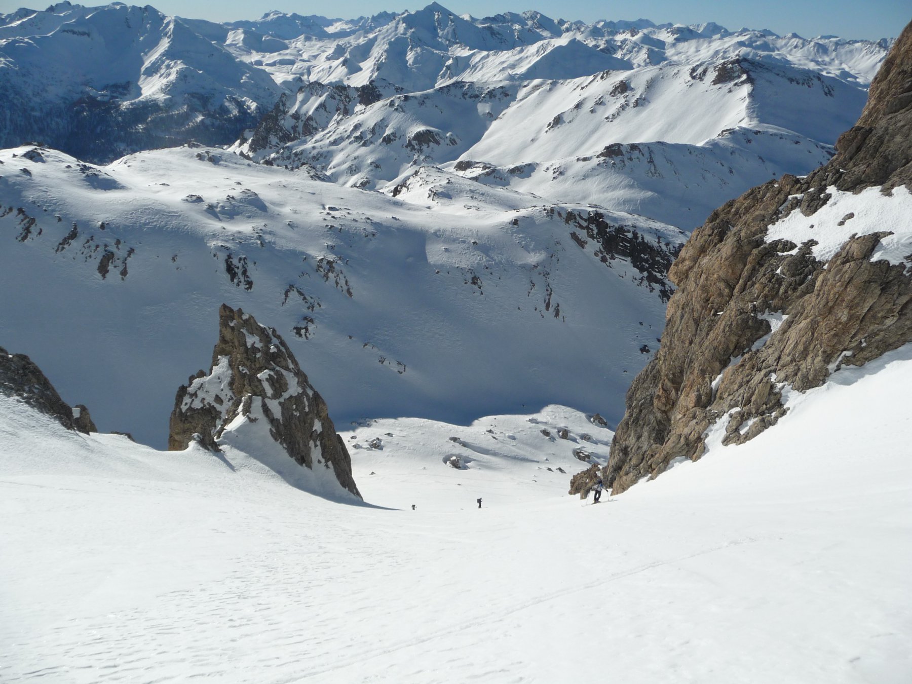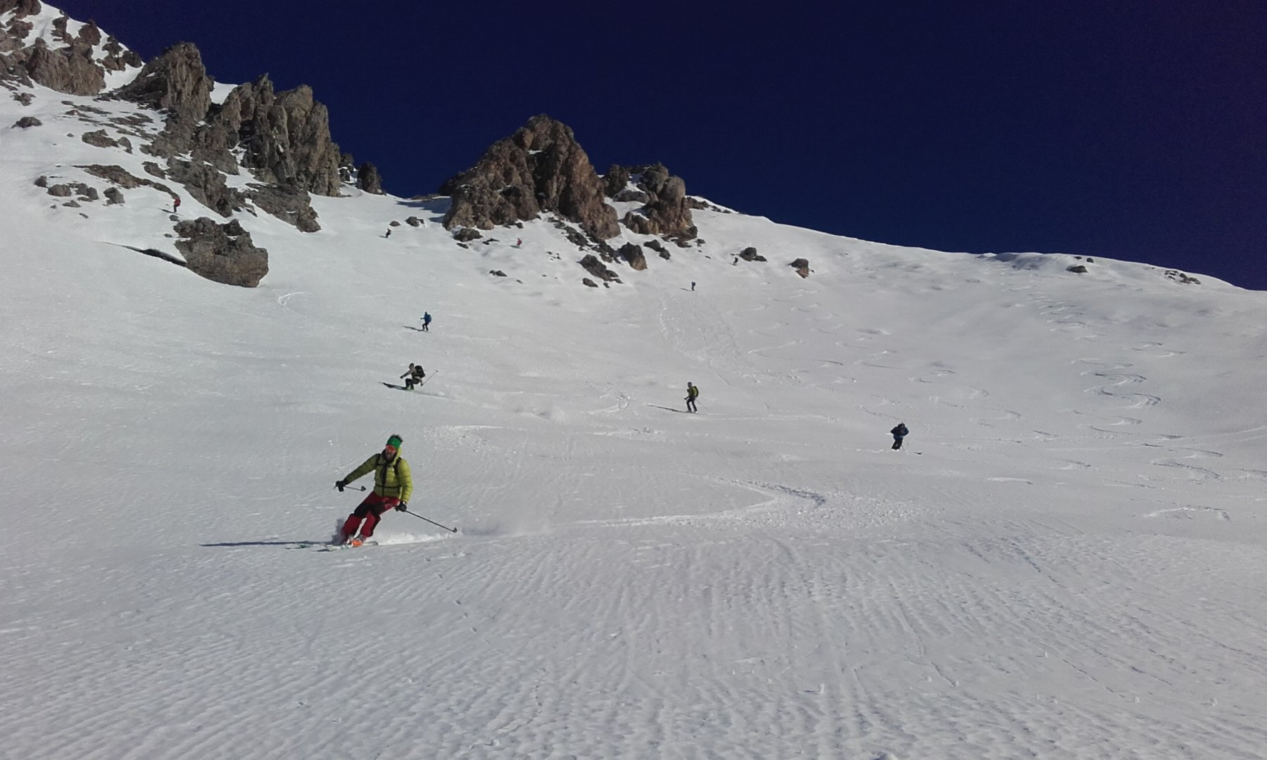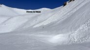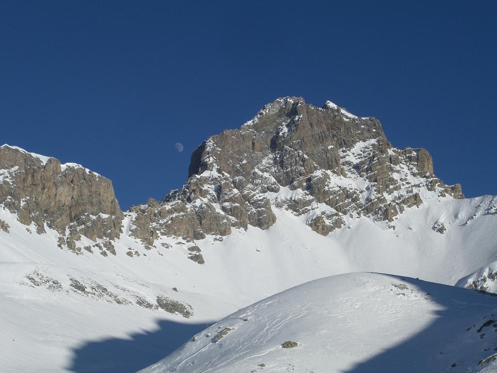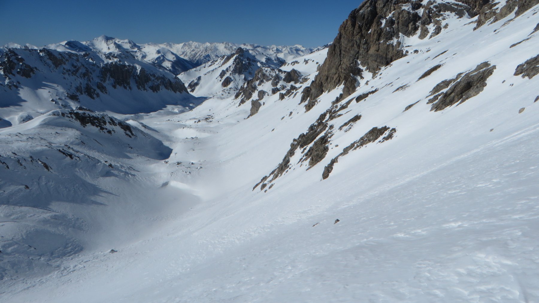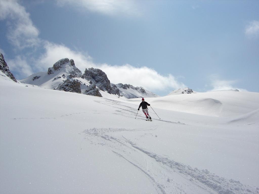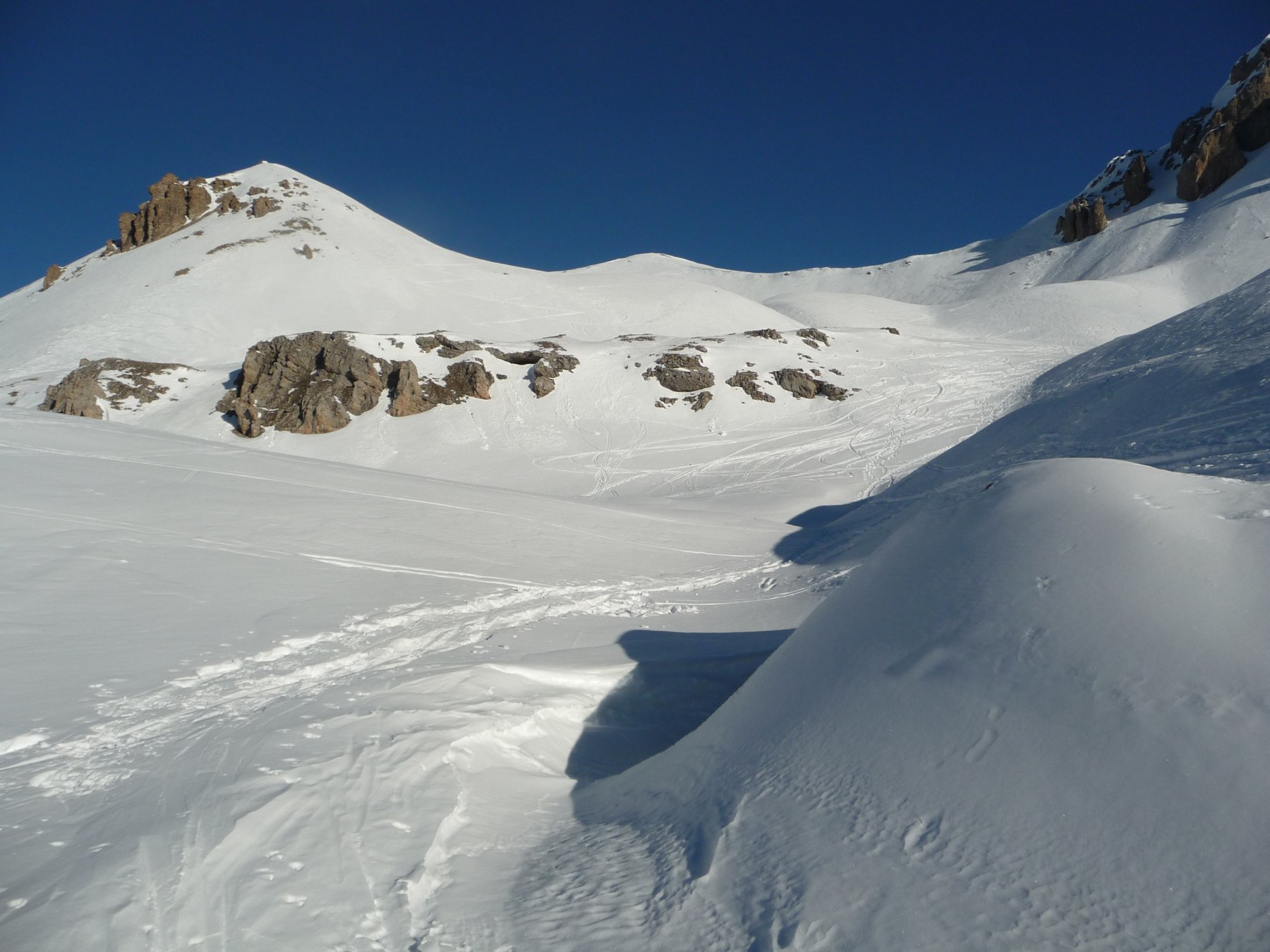 Dal Pontet 1948 m. si segue il Vallone de l’Oronaye lungo la sponda destra orografica sino alla q di 2500m c.a. dove si apre in un ampio anfiteatro (in alternativa ma con neve assestata e sicura si può risalire dal Colle della Maddalena 2000m. il medesimo vallone sulla sinistra orografica facendo attenzione a non innalzarsi troppo sui ripidi pendii per congiungersi con il primo itinerario a q. 2300m. c.a.)