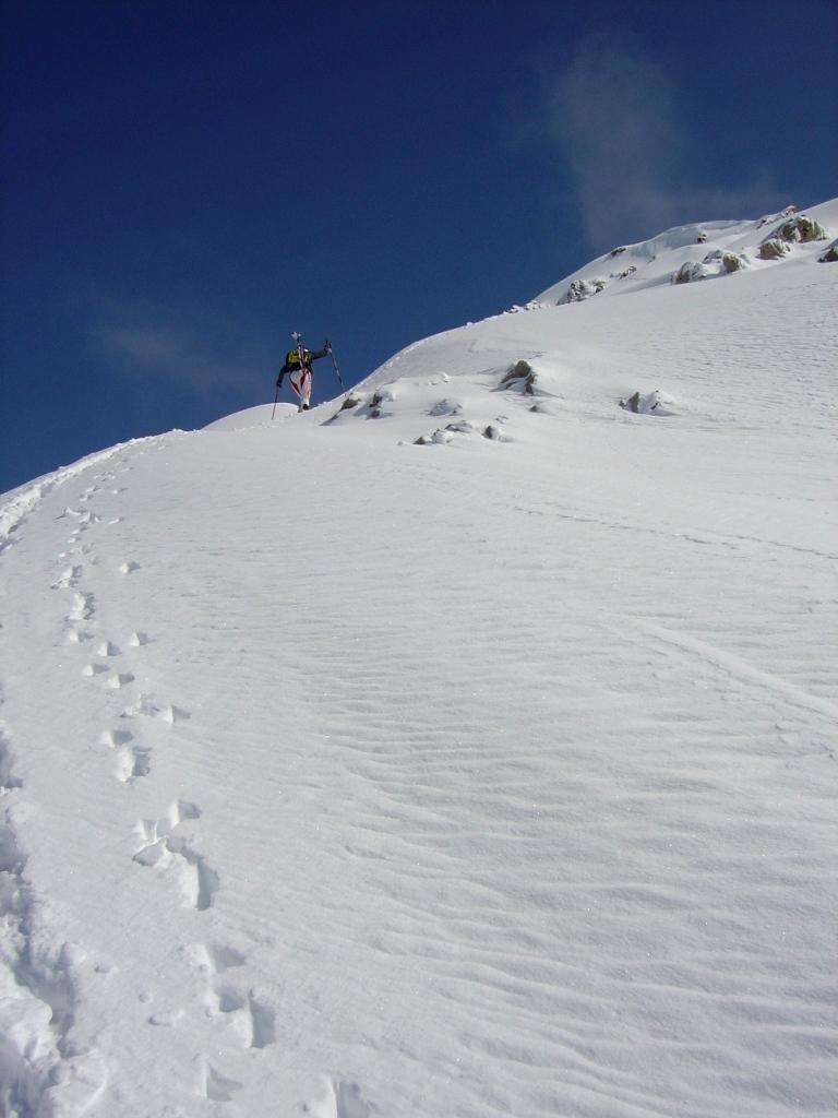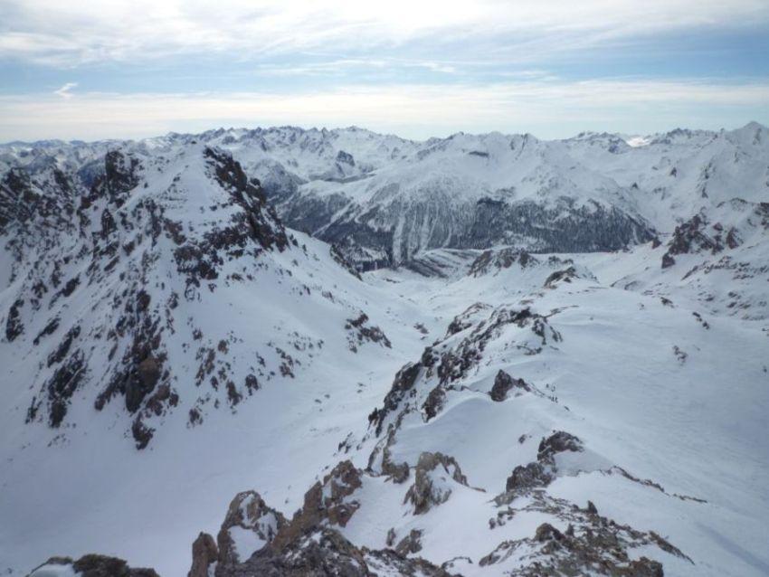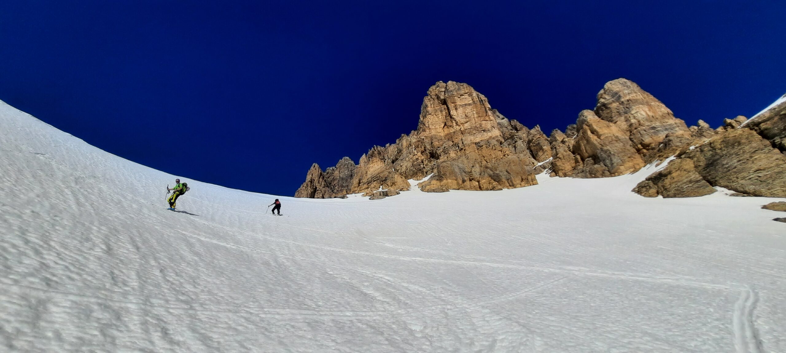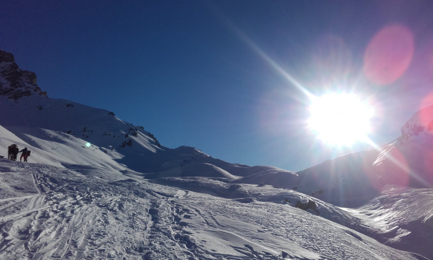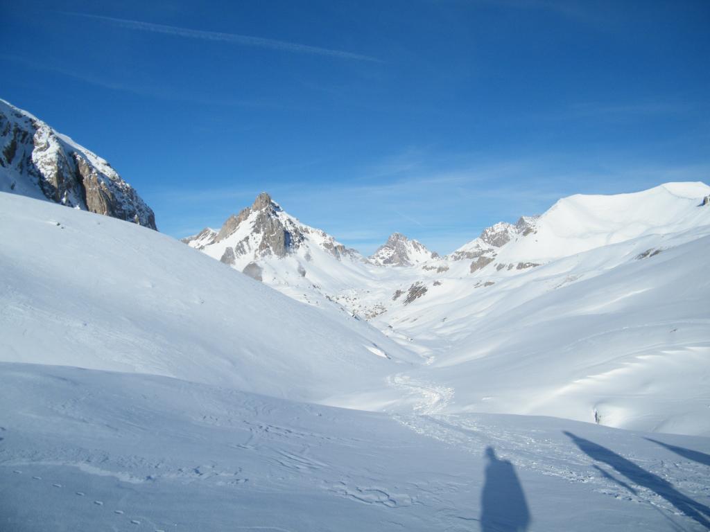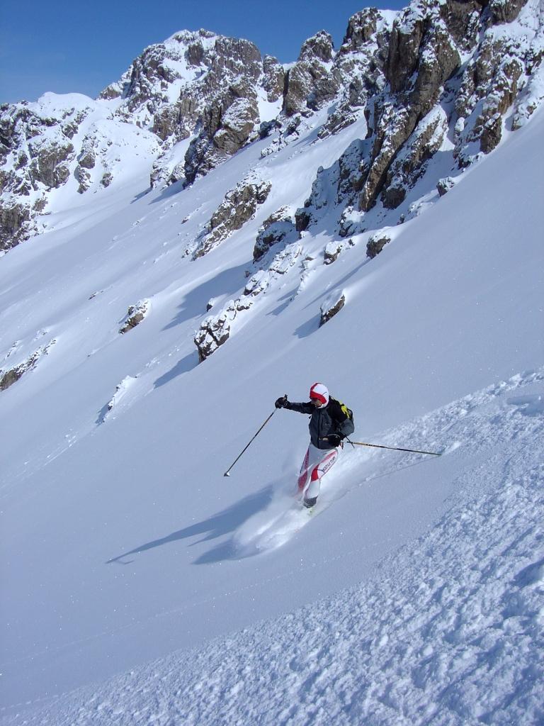Dal Pontet 1948 m. si segue il Vallone de l’Oronaye lungo la sponda destra orografica sino alla q di 2500m c.a. dove si apre in un ampio anfiteatro (in alternativa ma con neve assestata e sicura si può risalire dal Colle della Maddalena 2000m. il medesimo vallone sulla sinistra orografica facendo attenzione a non innalzarsi troppo sui ripidi pendii per congiungersi con il primo itinerario a q. 2300m. c.a.)