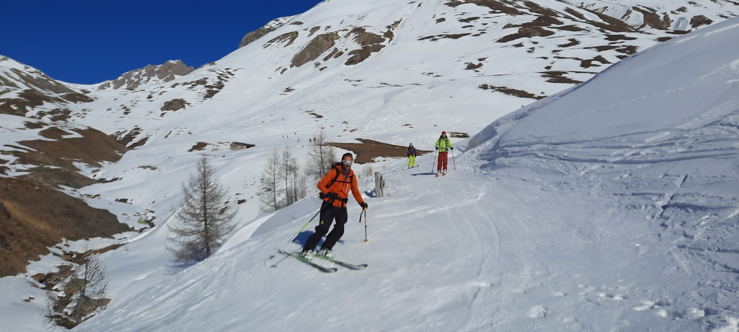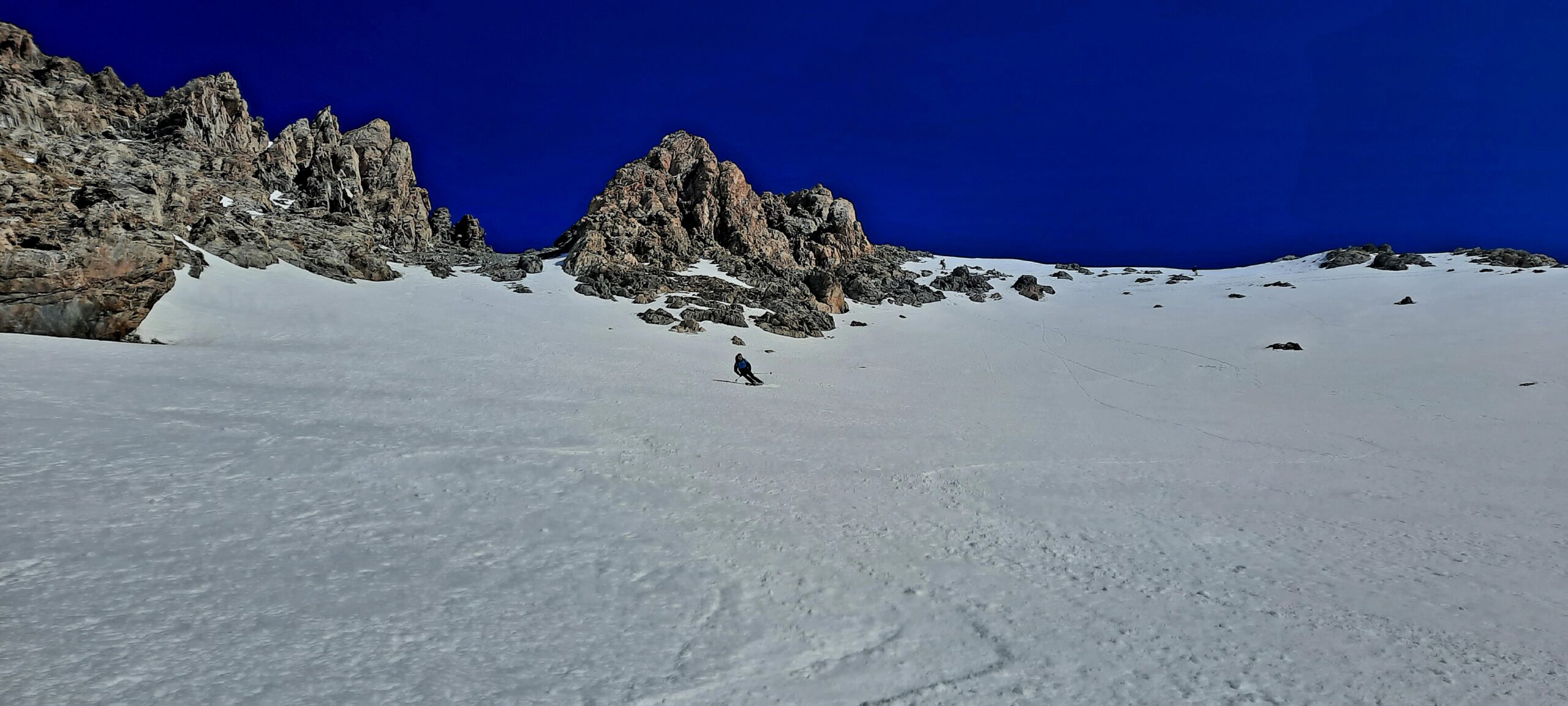 Discesa sul lato opposto (expo ONO) su farina delle migliori da non credere e ampi spazi fino a toccare il vallone de l’Orrenaye da cui si rientra senza problemi all’auto stando sul versante ortografico sinistro.
