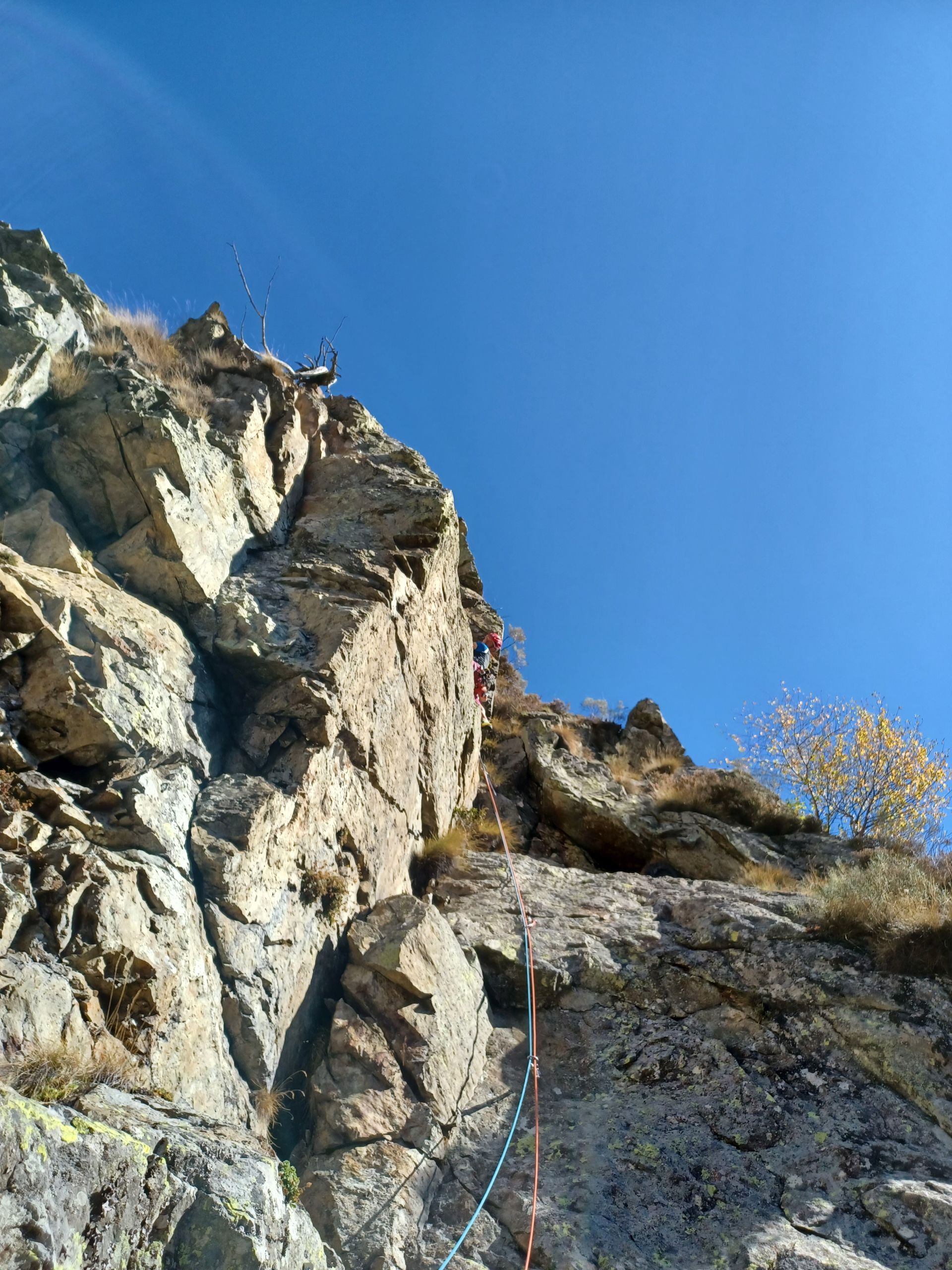 - L6: dalla sosta traversare verso dx seguendo prima una fessura/diedro in leggero strapiombo e poi piegare a sx nel diedro fessurato fino a raggiungere la sosta in comune con Dolce Enrico (tiro atletico) 6b