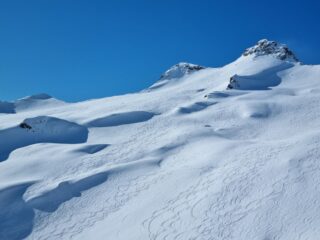 Neve polverosa, di quella che a ogni curva di uno sciatore si alza un nugolo di polvere, trascinata poi via dal vento.