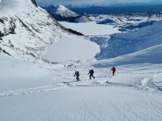 Siamo andati al colle tra il Varden e il Småtindan, scesi di 350 m abbiamo ripellato, scavalcato nel vallone adiacente e saliti sul Simitinden. Discesa fino al lago di Damvatnet, seconda ripellata e salita fino allo spartiacque tra i due valloni. Discesa nel vallone del Varden.