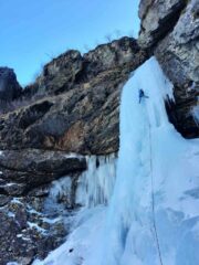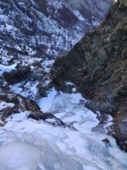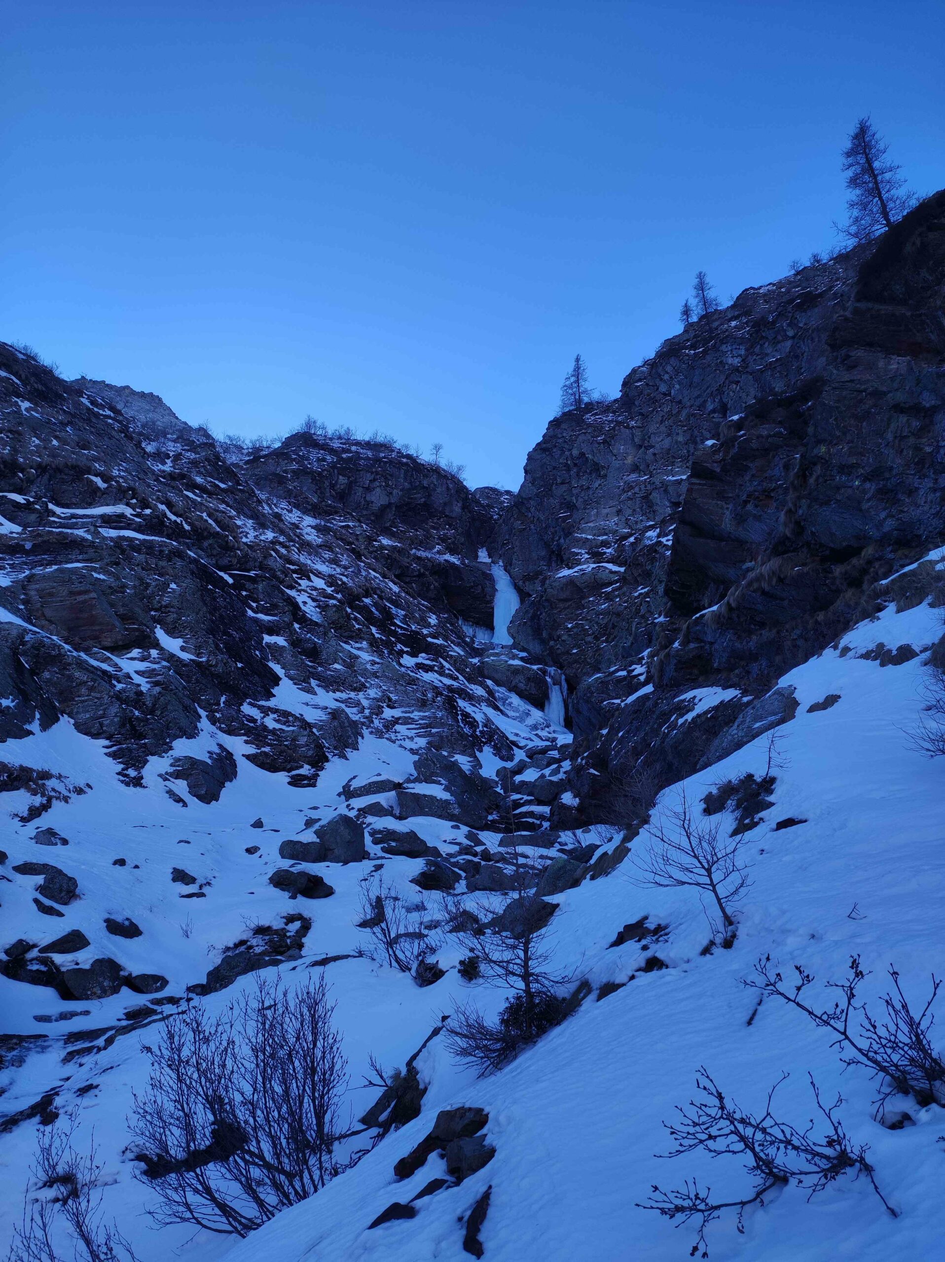 Qui termina la cascata Vargnei. Volendo attaccare la candela, proseguire per vari risalti tra neve, rocce e brevi rampe di ghiaccio da affrontare in conserva protetta, per poi giungere a canale innevato che conduce alla candela. (È presente un spit con cordone e maillon sul tratto più ripido).